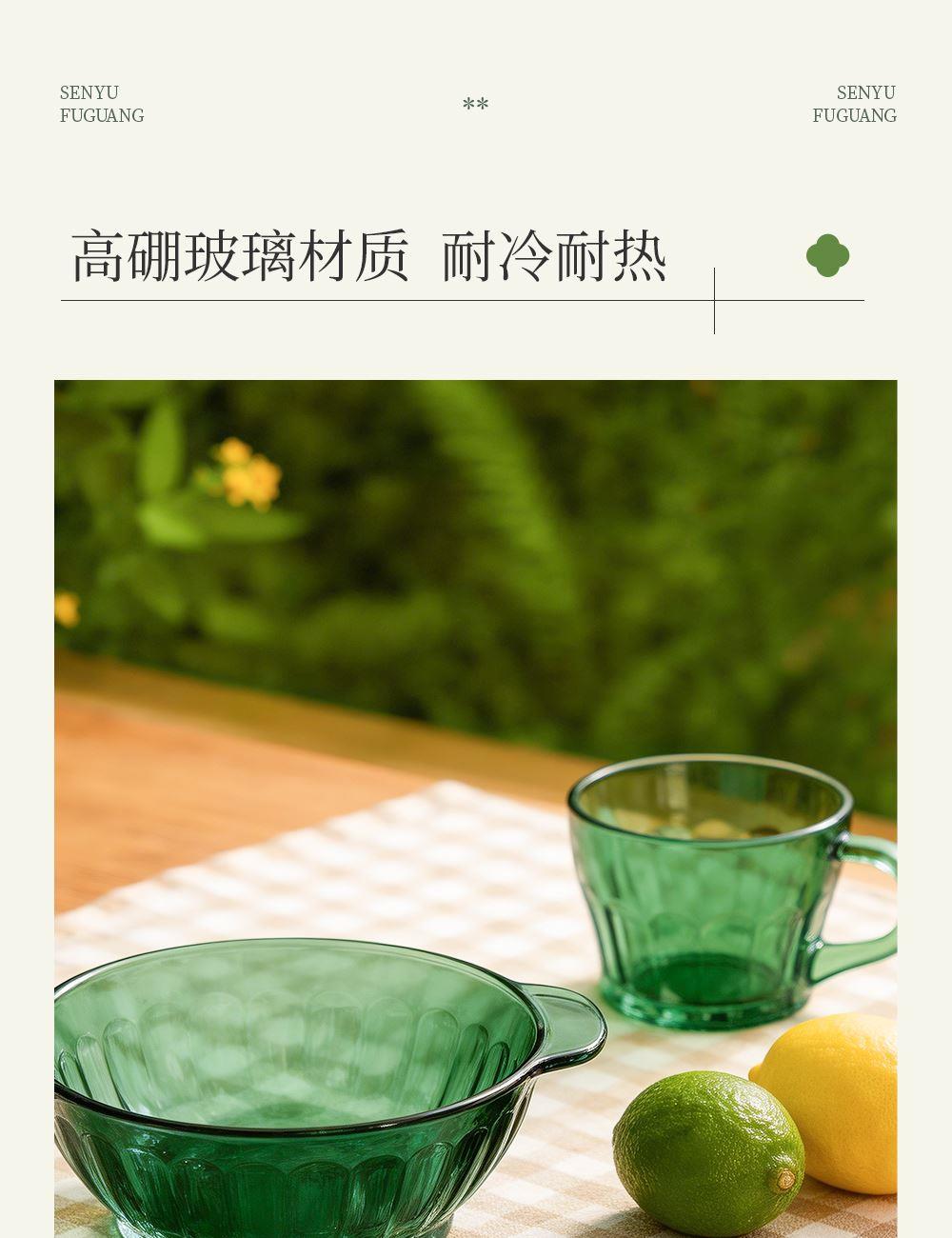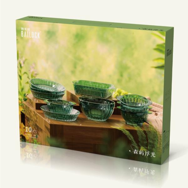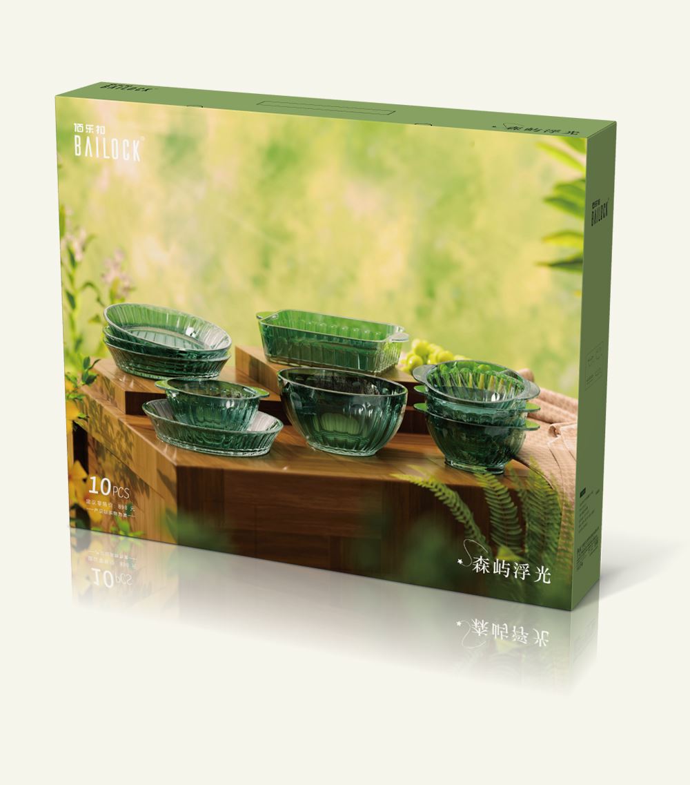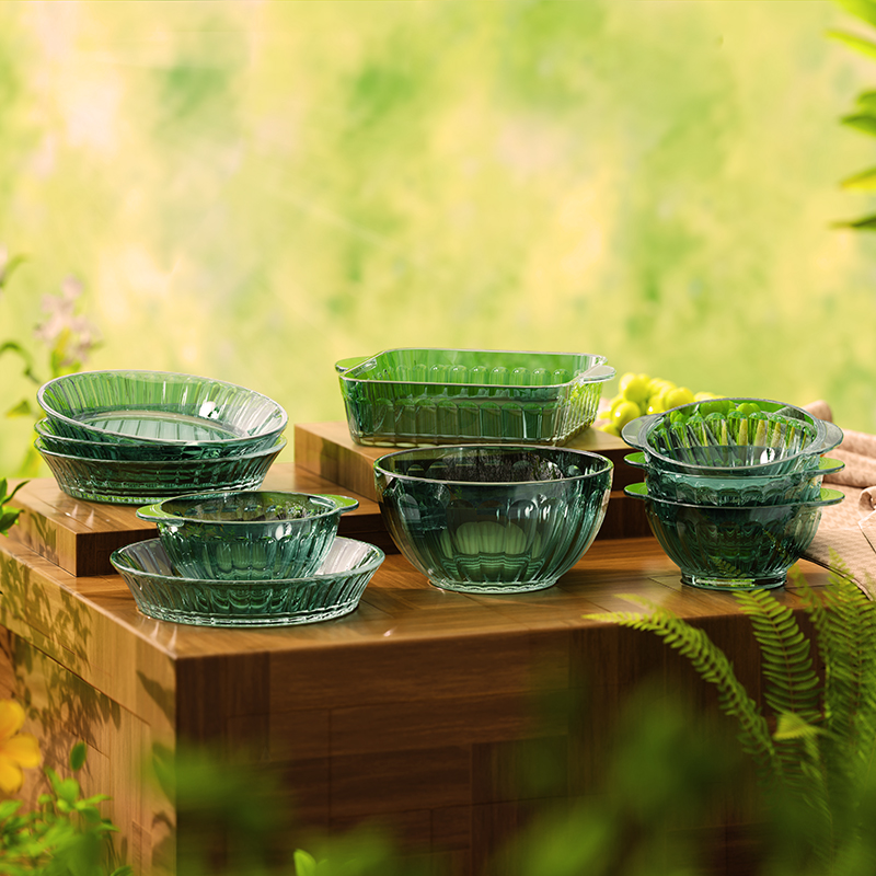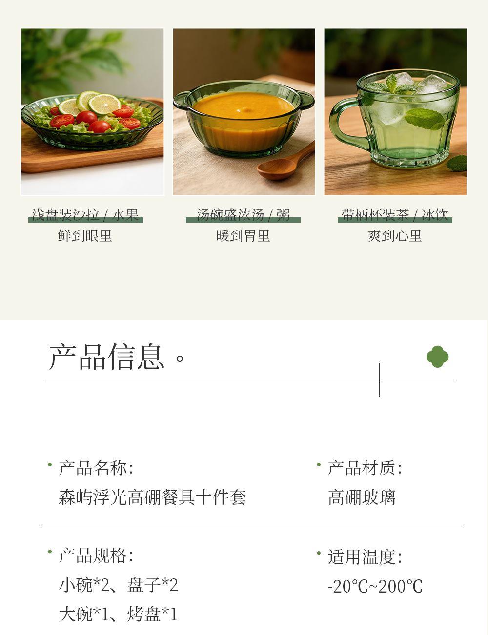 材 质:高硼色料玻璃 产品参数:小碗*4、盘子*4、大碗*1、烤盘*1 产品卖点:1.它是原色玻璃:不是表面涂层,杜绝铅镉等重金属析出。 2.它是高硼硅材质:能从冰箱直接进烤箱,不炸裂,不娇气。 3.它是顶配厚度:竖纹肌理,重工加厚,手感无与伦比。 只服务懂行、追求极 致生活品质的客户。礼盒发售中,详情私信。