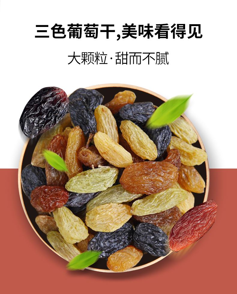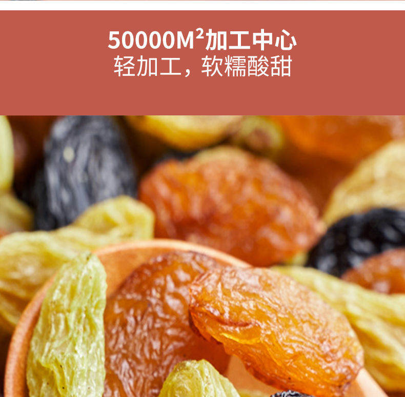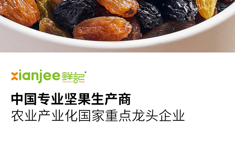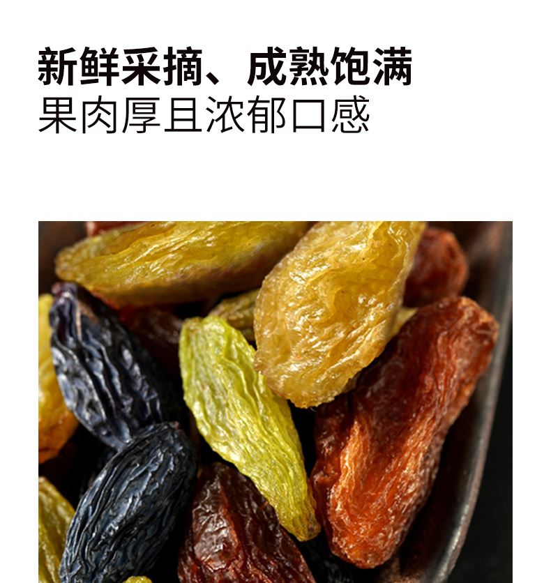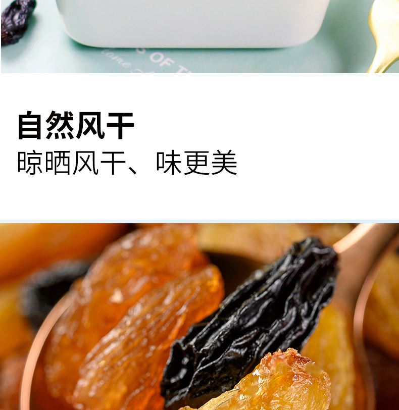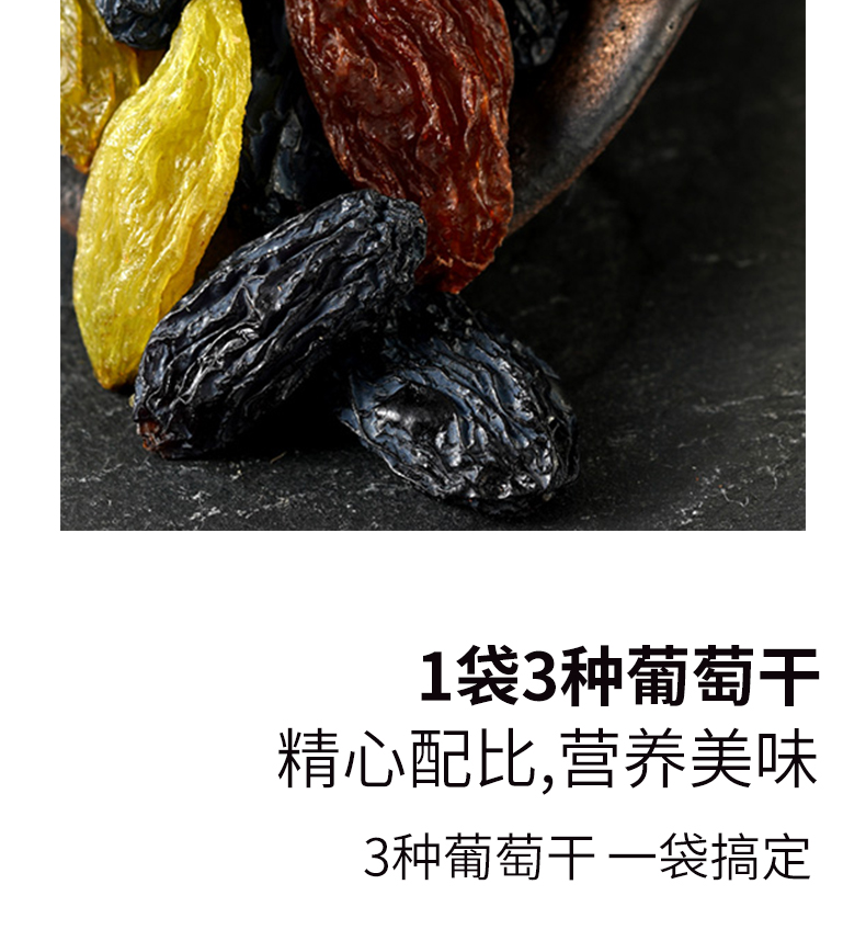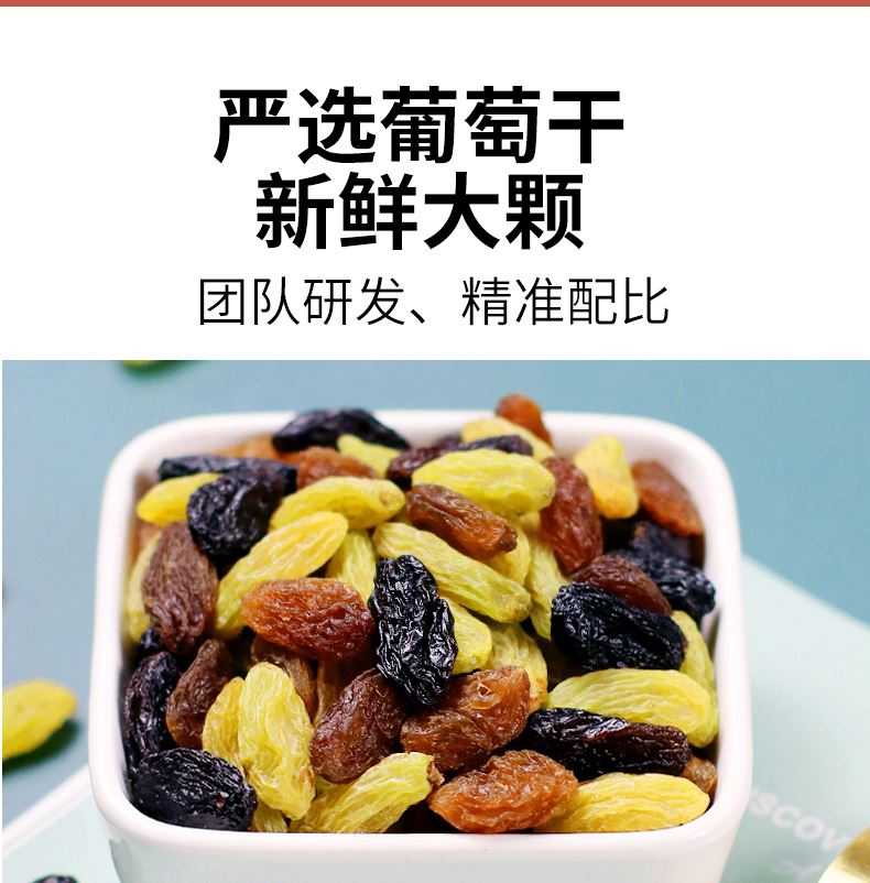 严选葡萄干,新鲜大颗,自然风干,软糯酸甜; 精心配比,营养美味。