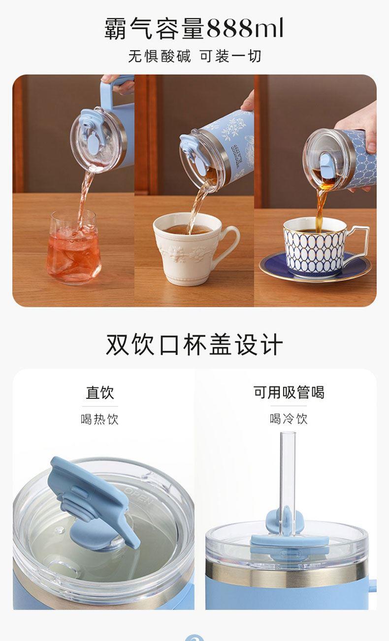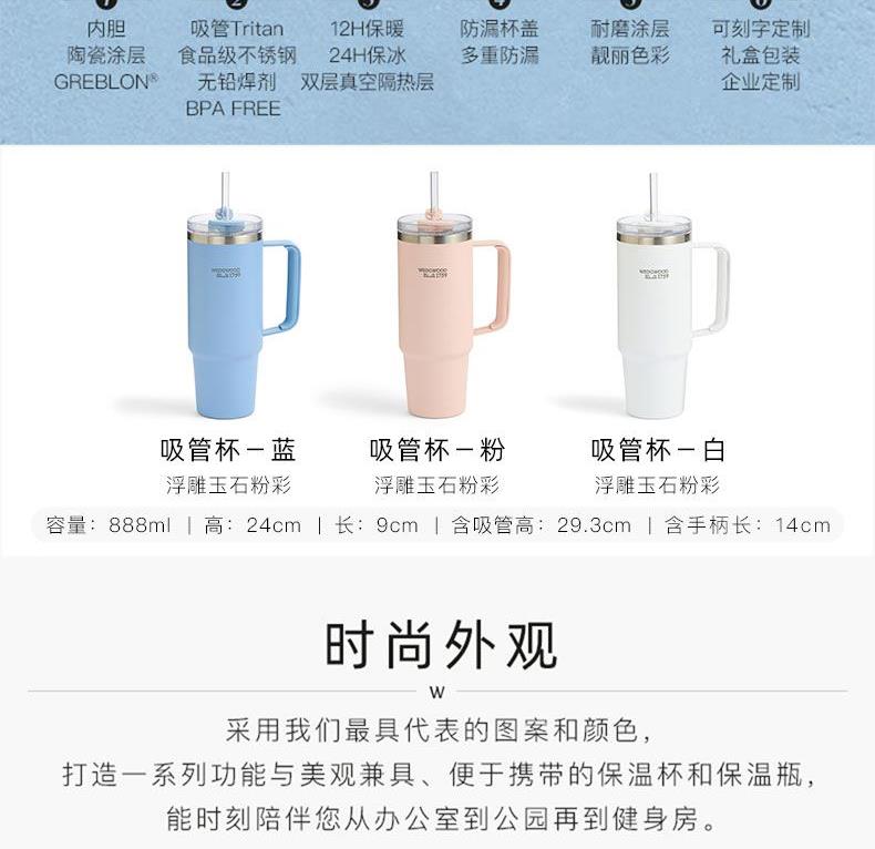 尺寸:高: 24cm 长: 9cm 含吸管高:29.3cm 含手柄长: 14cm 颜色:蓝、粉、白 产地:中国大陆 杯身:304不锈钢 手柄:手柄金属201不锈钢,手柄塑料 ABS(丙烯腈-苯乙烯-丁二烯共聚物)铆钉304不锈钢 杯盖:Tritan;PP聚丙烯;Silicone硅胶 水杯内壁采用了高品质的陶瓷涂层,更加健康耐用且易于清洁。 手柄设计便于携带 附赠备用吸管及吸管刷保温/保冷可达12小时,保冰24小时
