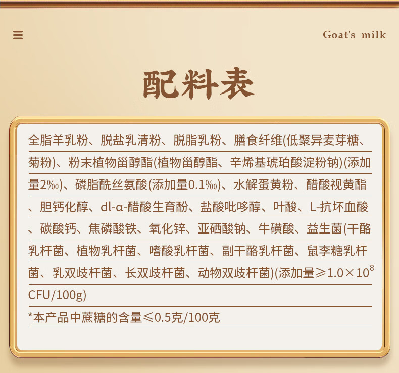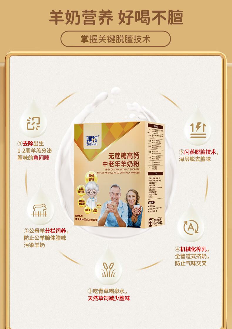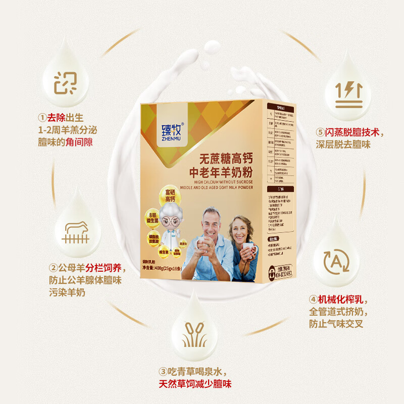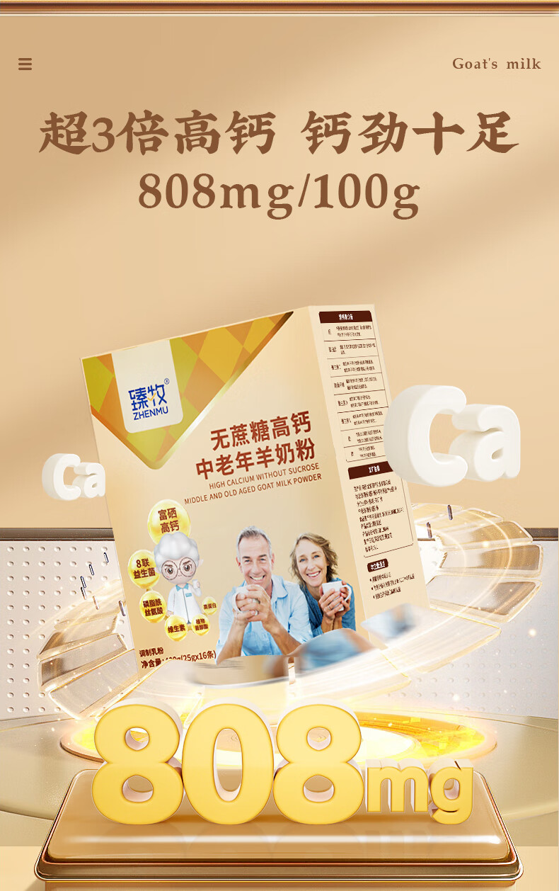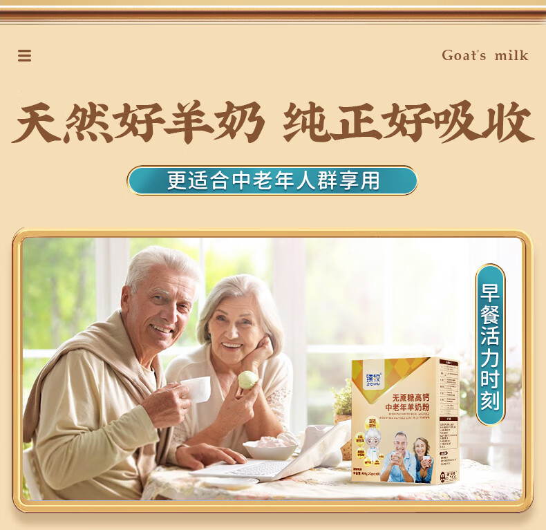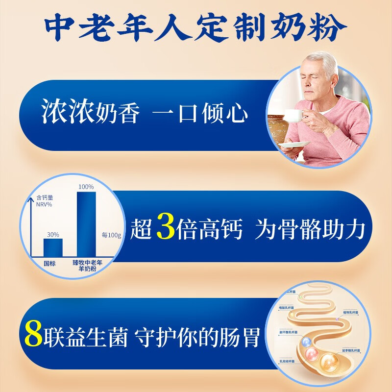 1、中老年羊奶粉榜全网销售额 2、荣获世界品质评鉴大会“国际蒙特奖” 3、超国标4倍高钙含量,每100g含钙1080mg 4、黄金三角高钙法,钙吸收率达2.5倍 5、8联益生菌,促进有益菌生长,助力肠道舒适畅通 6、不易上火,不易过敏,易吸收,乳糖不耐可尝试