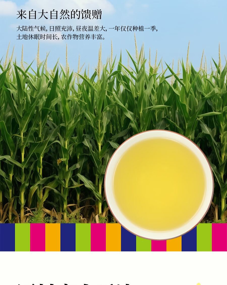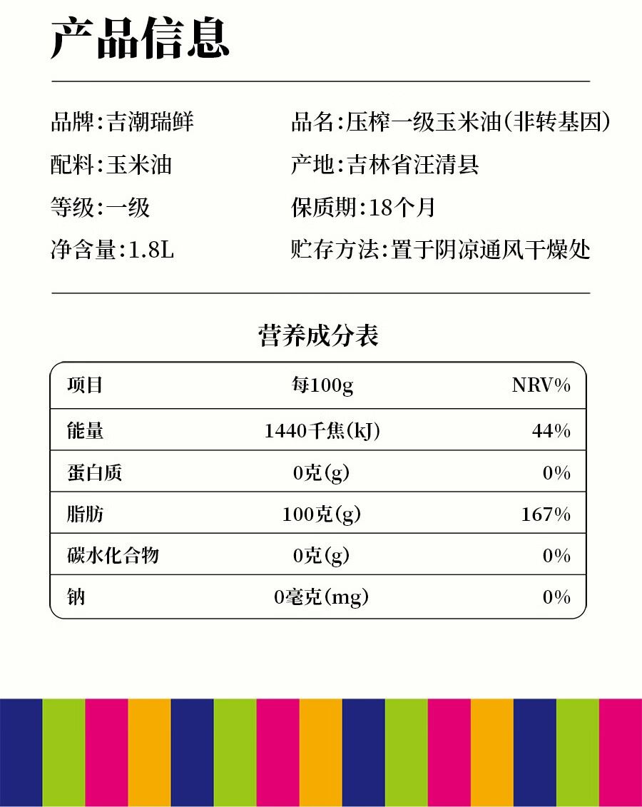 吉潮瑞鲜压榨一级玉米油(非转基)1.8L 配料:玉米油 等级:一级 净含量:1.8L 产地:吉林省汪清县 保质期:18个月 贮存方法:置于阴凉通风干燥处