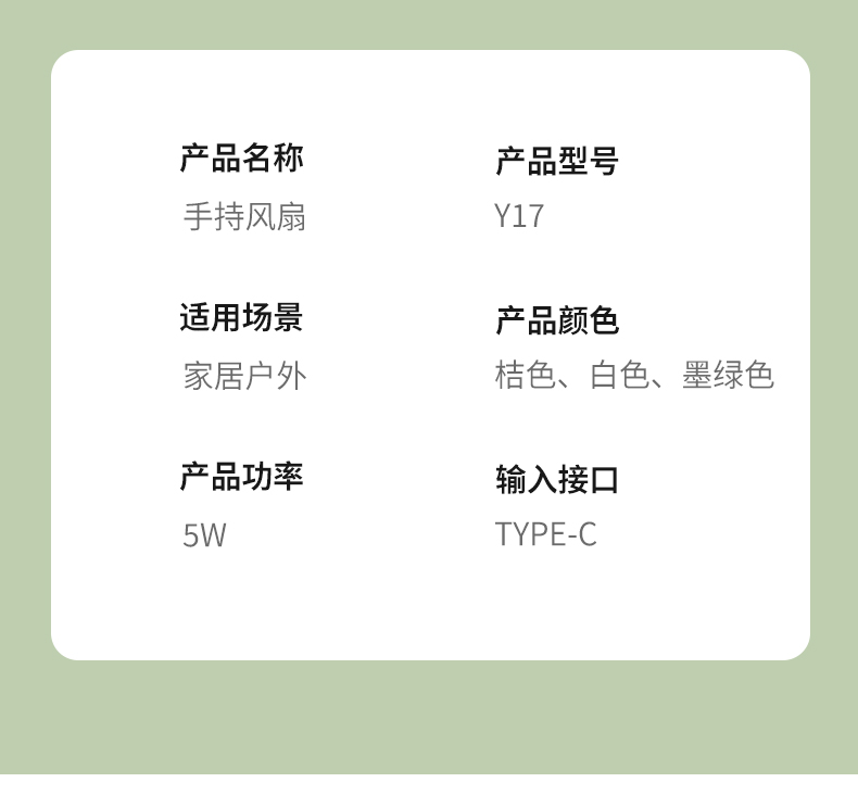 手持桌面户外小风扇Y17 颜色:白色 黄色 绿色 材质:ABS 尺寸:85*33*160mm 容量:600mAh 包装:彩盒包装 【推荐理由】: 精致小巧,方便携带 三档风速可调 桌面/手持 /自带挂钩多种使用方法