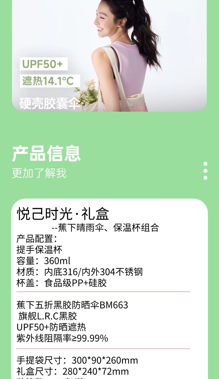 产品配置: 提手保温杯 容量:360ml 材质:内底316/内外304不锈钢 杯盖:食品级PP+硅胶 蕉下五折黑胶防晒伞BM663 旗舰L.R.C黑胶 UPF50+防晒遮热 紫外线阻隔率≥99.99% 手提袋尺寸:300*90*260mm 礼盒尺寸:280*240*72mm