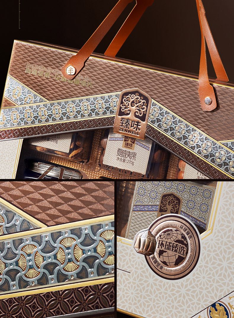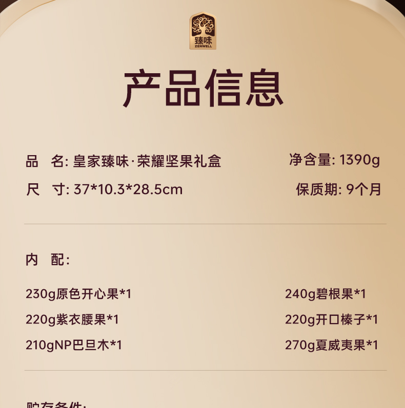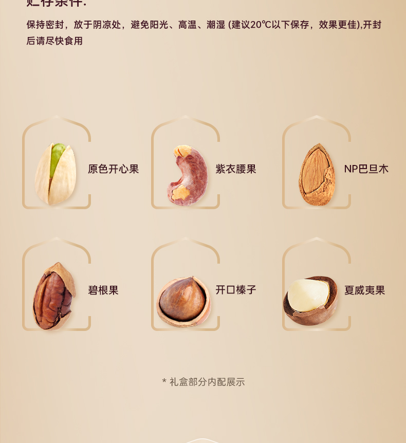 230g原色开心果*1 220g紫衣腰果*1 210gNP巴旦木*1 240g碧根果*1 220g开口榛子*1 270g夏威夷果*1 礼盒采用经典手提包盒型,搭配精致的花纹装饰与透明开窗设计,颜值在线,轻奢感十足; 净含量:1390g,内含6种纯坚果,品质坚果独立罐装,防潮锁鲜保存方便。