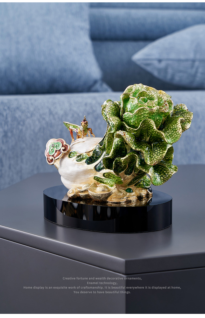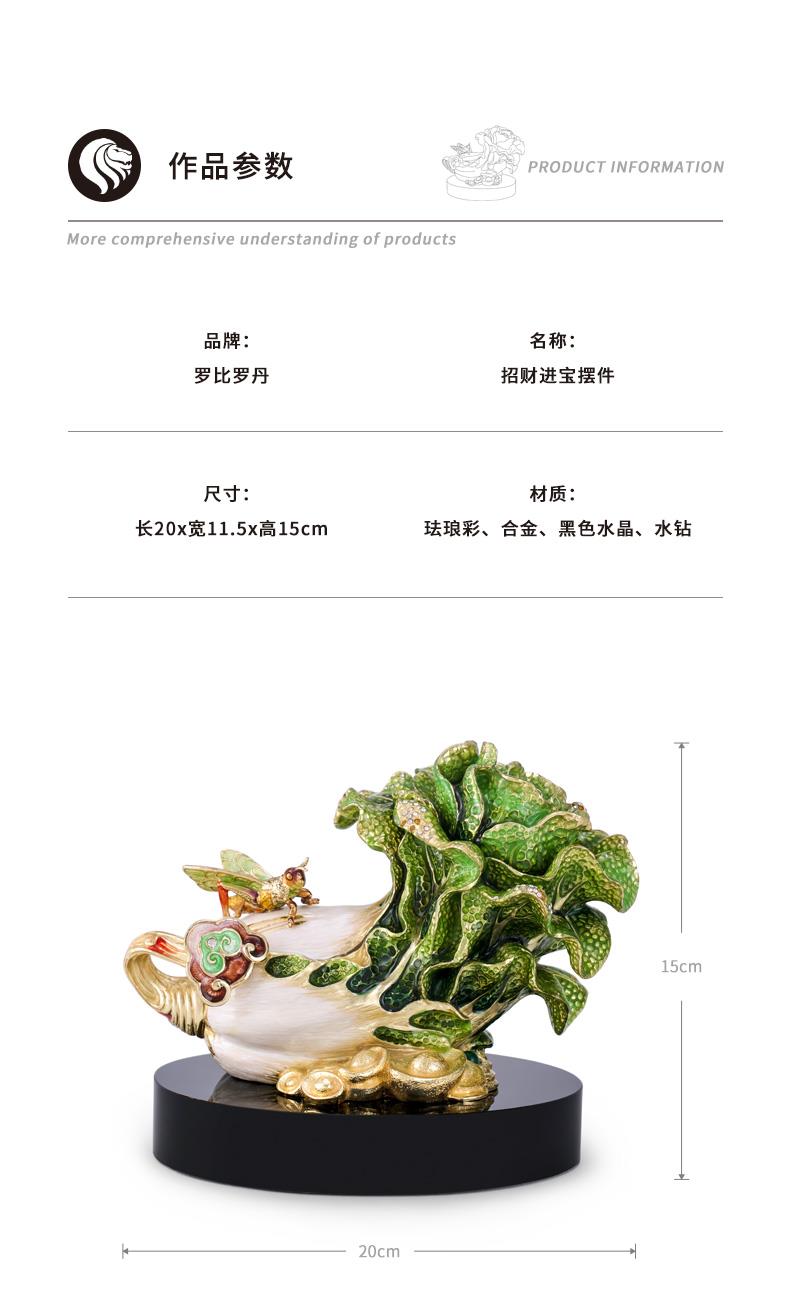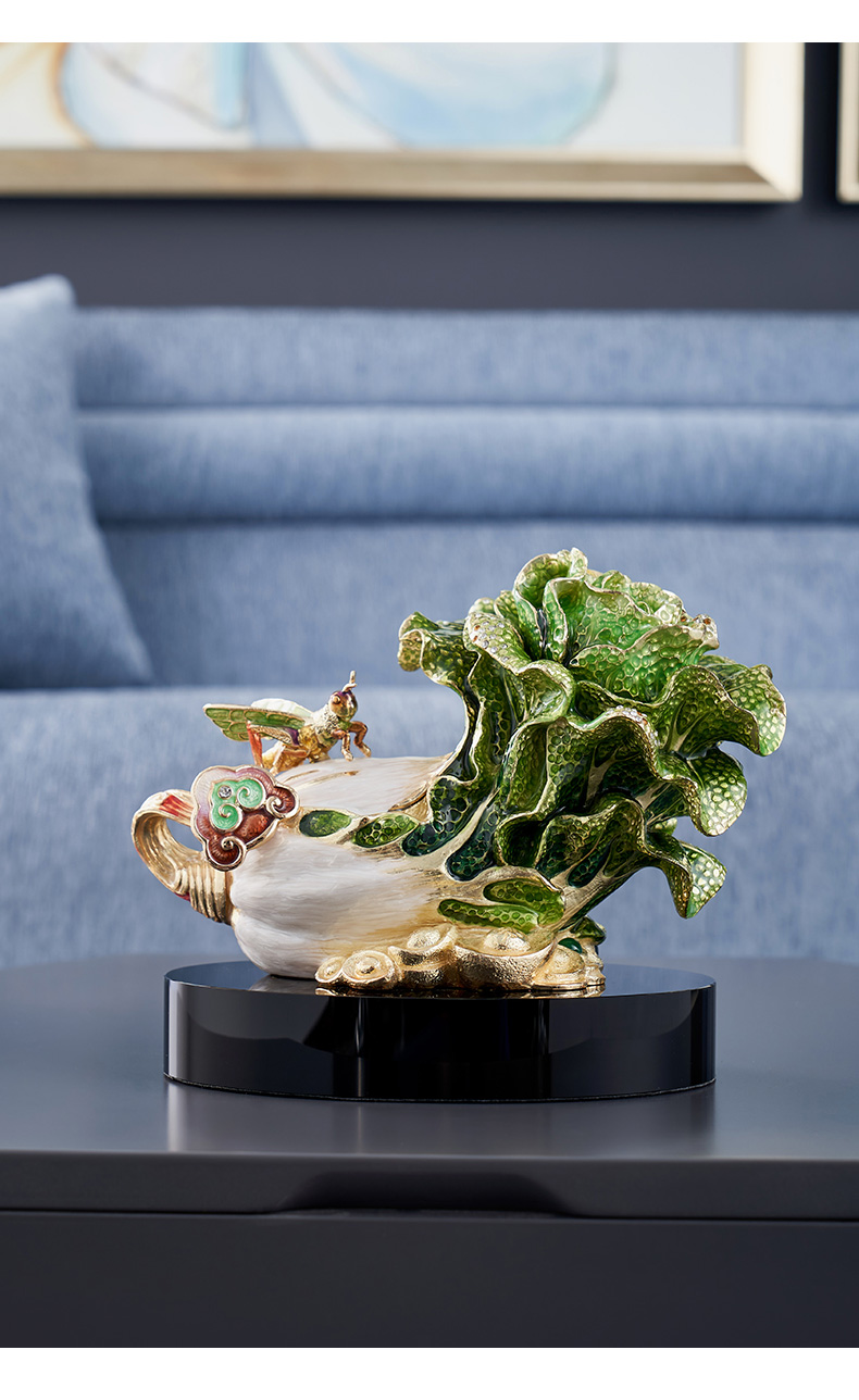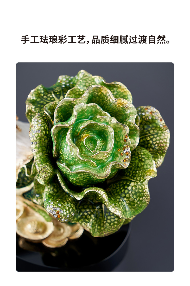 规格:20x11.6x15cm 包装:26x21x15.5cm 白菜谐音“百财”,寓意百种财富滚滚而来,而且叶子层层包裹,象征包你发财,有聚财、招财、发财的寓意。白菜的颜色纯洁,也象征品德高尚、不忘初心。蝗虫的“蝗”同“黄”同音,寓意飞黄腾达、多子多福。