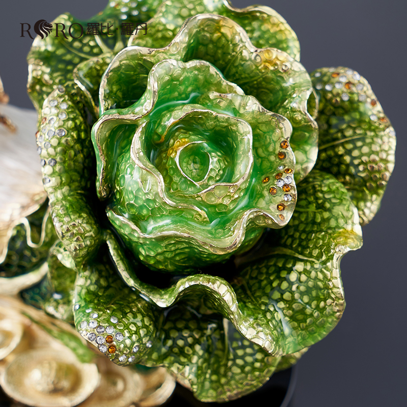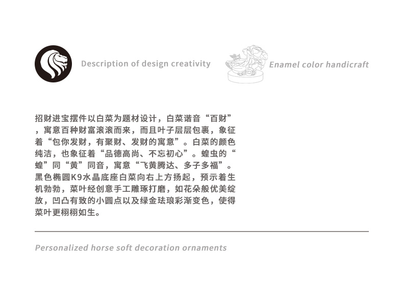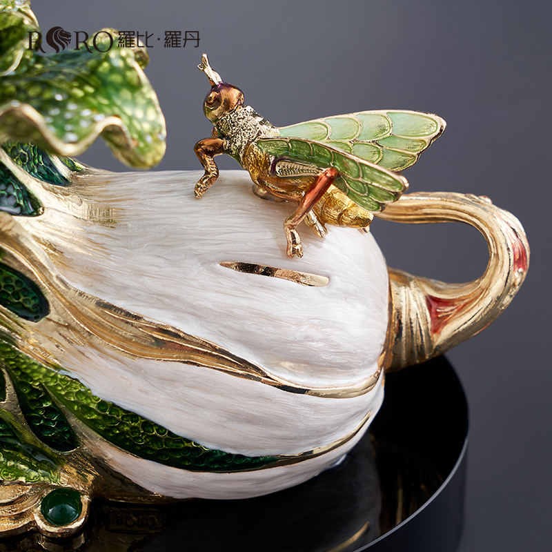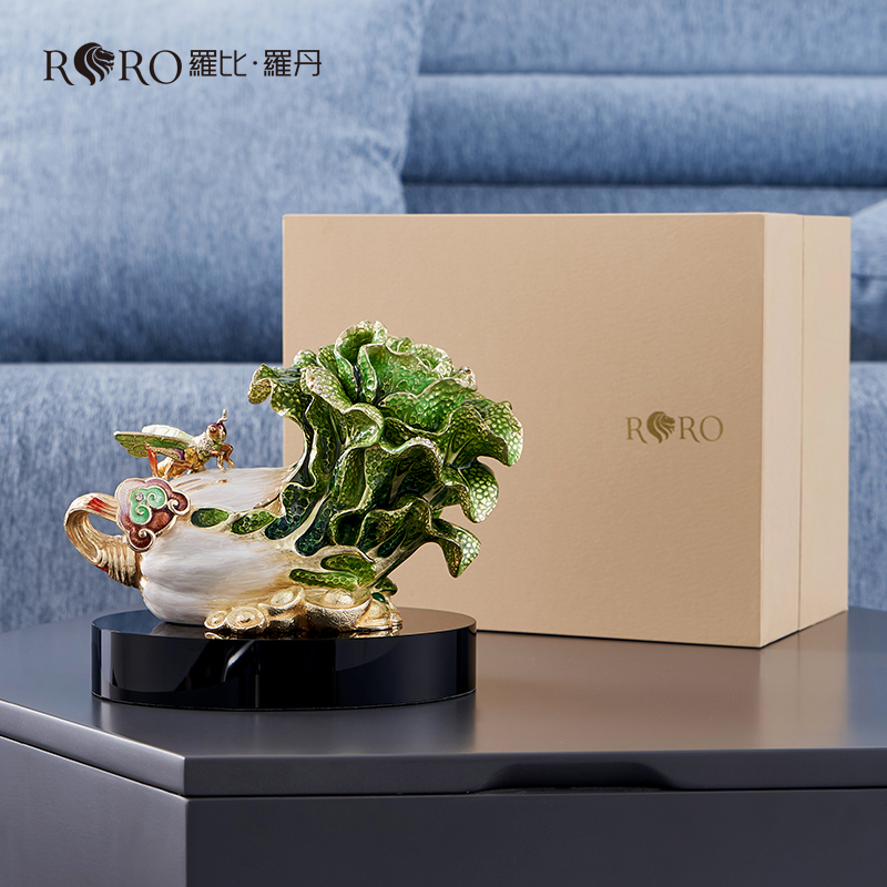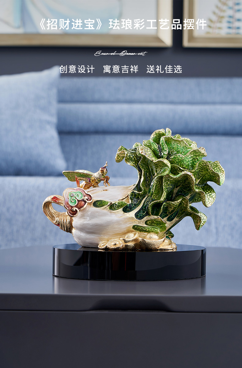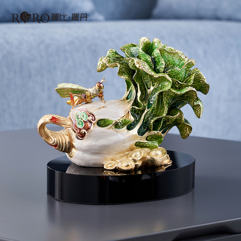 规格:20x11.6x15cm 包装:26x21x15.5cm 白菜谐音“百财”,寓意百种财富滚滚而来,而且叶子层层包裹,象征包你发财,有聚财、招财、发财的寓意。白菜的颜色纯洁,也象征品德高尚、不忘初心。蝗虫的“蝗”同“黄”同音,寓意飞黄腾达、多子多福。