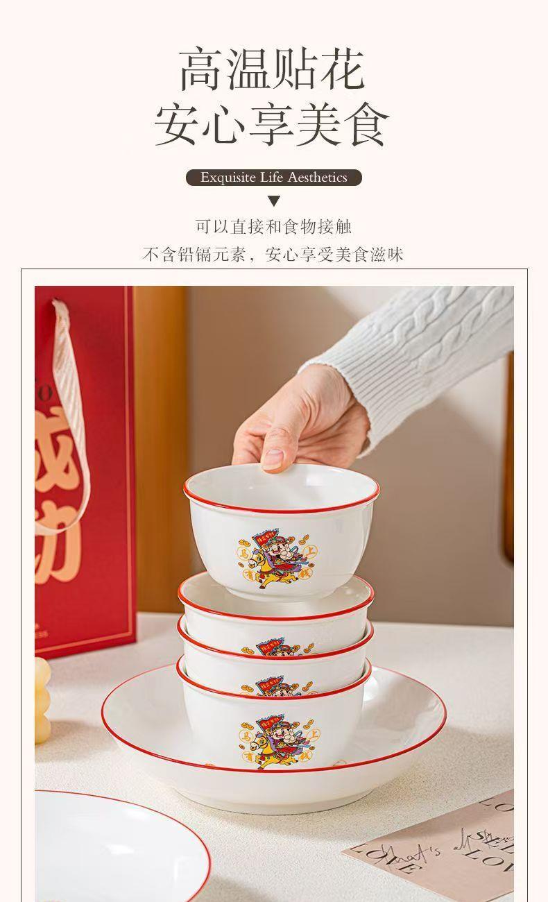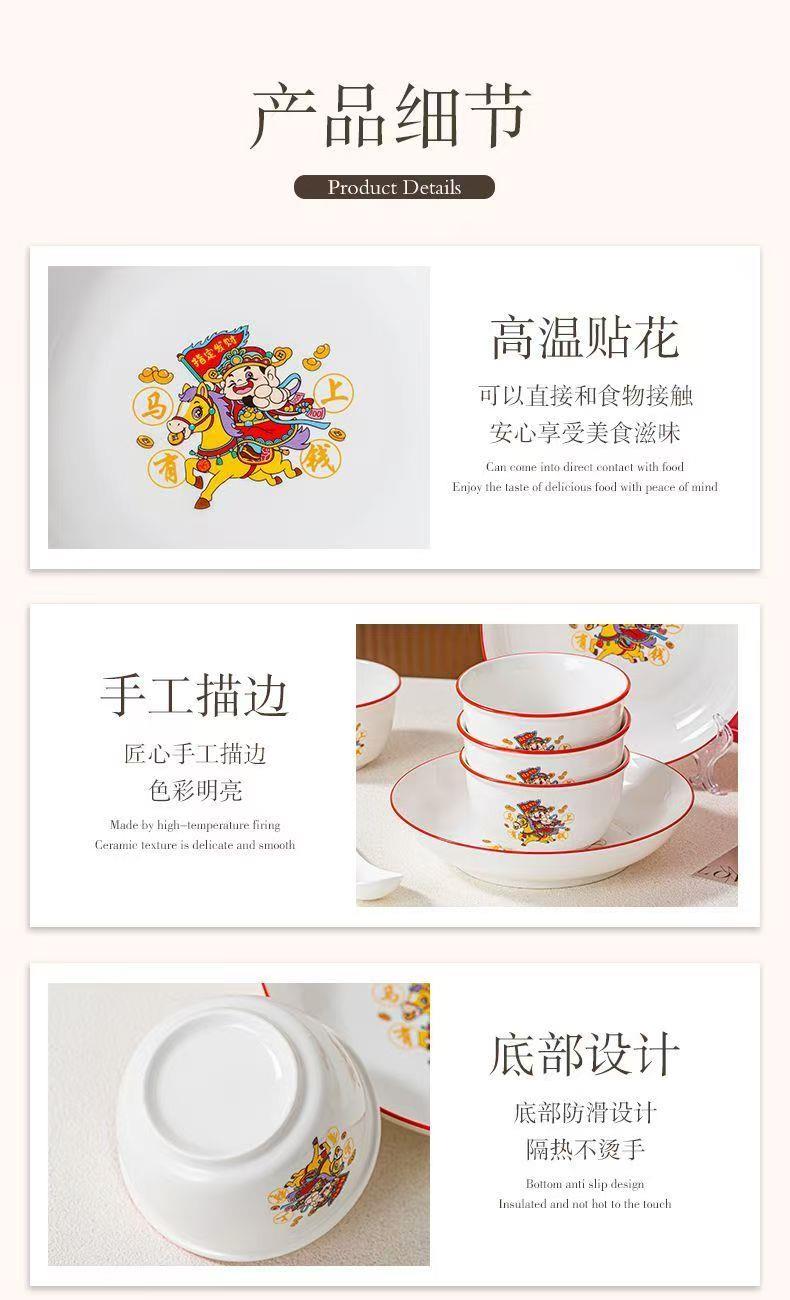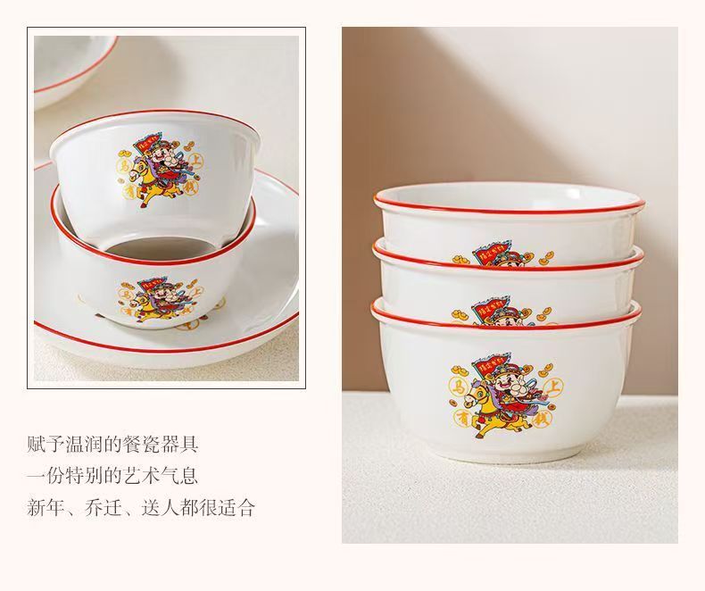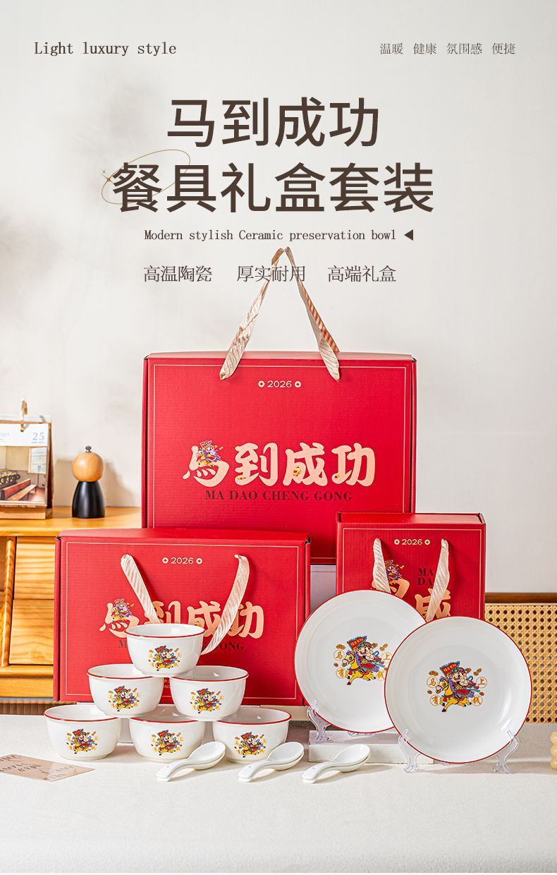 材质:新骨瓷+金属密胺筷 2碗套装:24CM*6CM*12.4CM , 外箱尺寸:52×35×64CM 24kg、 配法:2碗筷 产品特点: 2026年马到成功,马上发财。精致好看的礼盒装,让人爱不释手,是送礼佳品哦。餐具整理厚实防烫,久经耐用,釉面光滑,清洗方便!