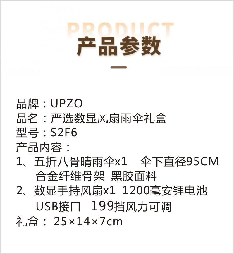 型号:S2F6 产品内容: 1、五折八骨晴雨伞(大伞)×1 伞下直径95CM 合金纤维骨架 黑胶面料 2、数显手持风扇*1 1200毫安锂电池 USB接口 (续航时间120分钟左右 199挡风力可调) 礼盒规格:25*14*7CM 五折八骨大号晴雨伞 口袋伞 标准伞尺寸 黑胶隔热 数显风扇 1200毫安 199档可调 长续航 靓丽外观