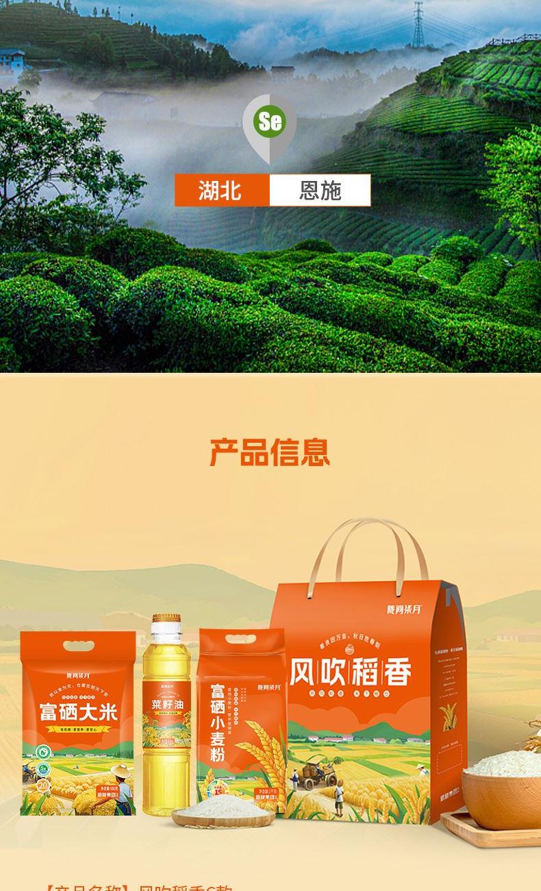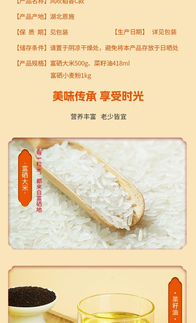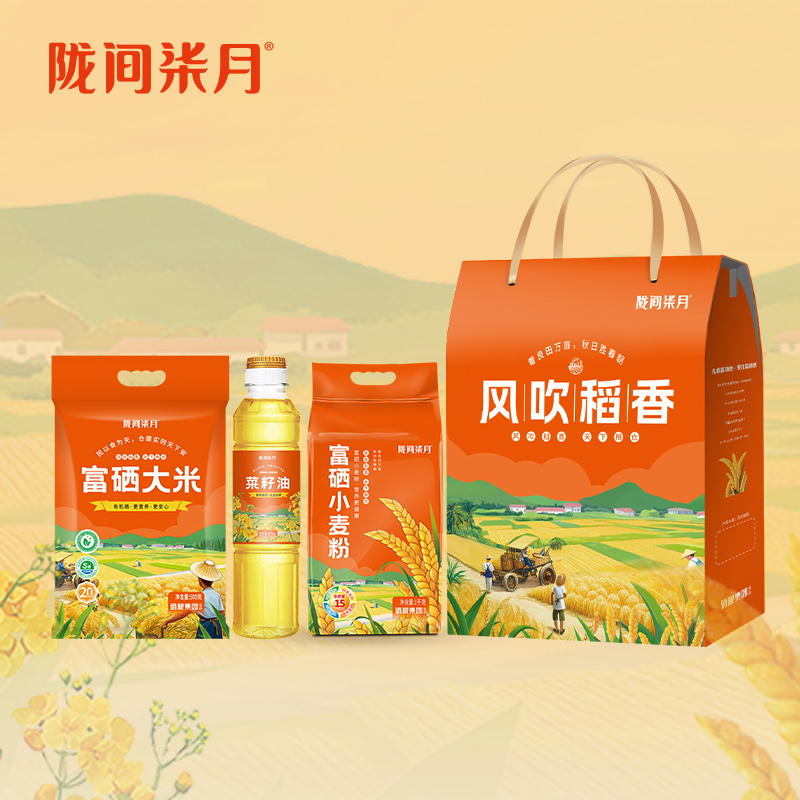 产品信息 品 名:风吹稻香C 规 格:富硒大米500g、菜籽油418ml 富硒小麦粉1kg 包 装:长25cm宽7cm高32cm 产品特色 1、富硒大米富含有机硒,更易被人体利用吸收。 2、菜籽油油品透亮、香味浓郁,烟点高、炒菜油烟少、低温下不易凝固等特点;菜籽油中还含有丰富的维生素E以及油酸、亚油酸、亚麻酸等 3、精选小麦品种,富硒的,更营养;面粉自然白净,粉质细腻,筋度适中,延展性高4、精美礼盒,送礼佳品。