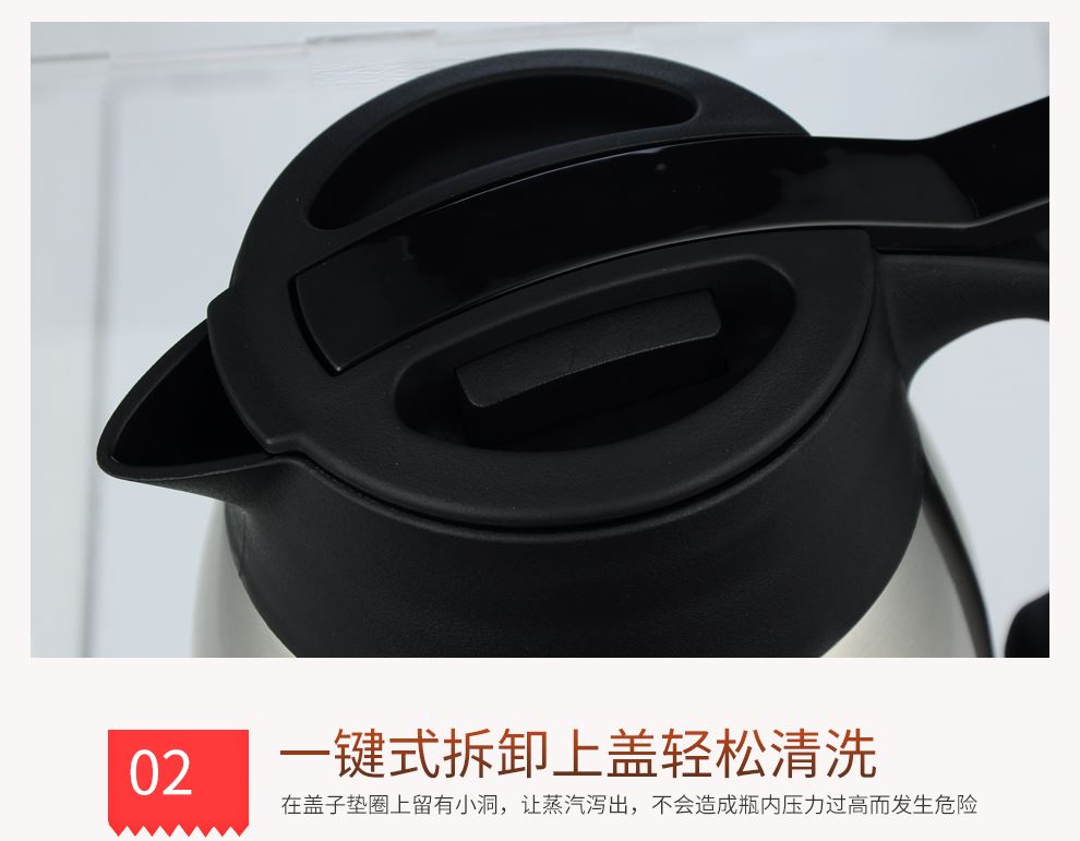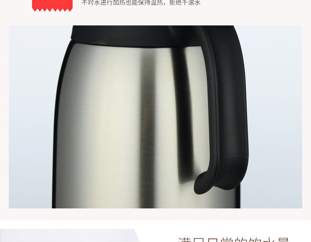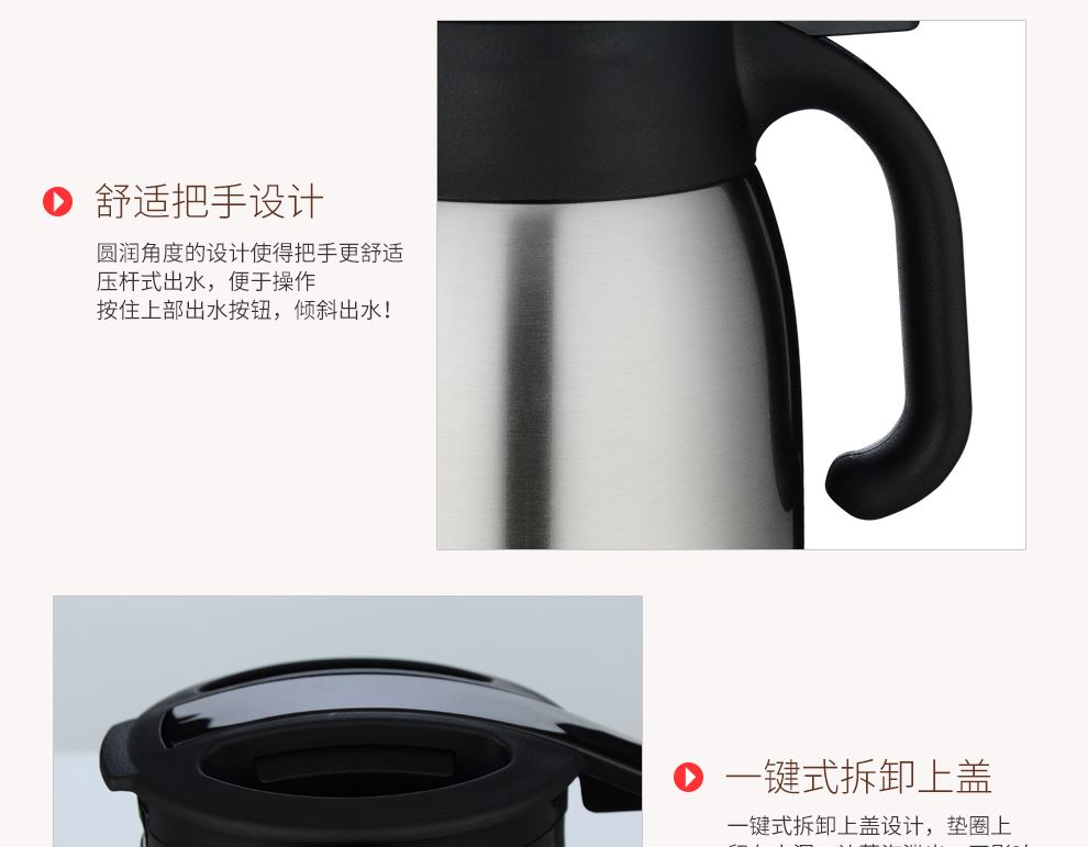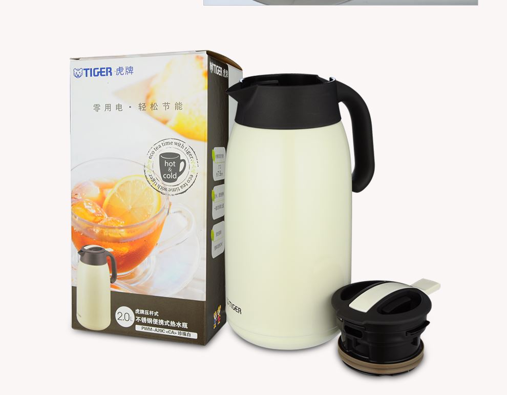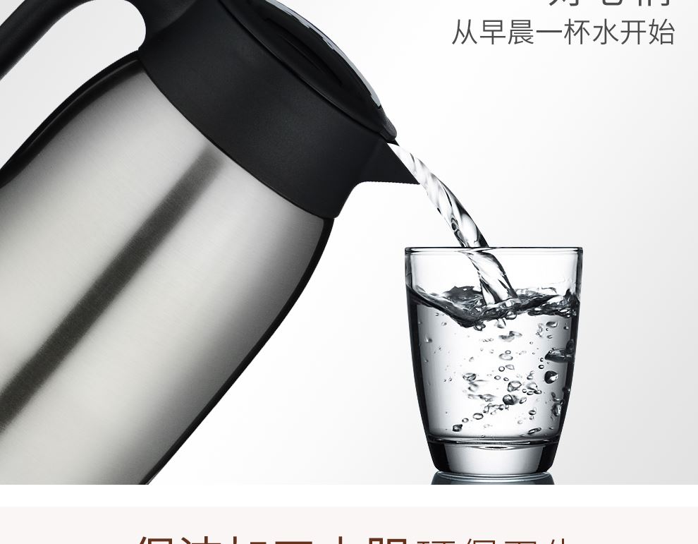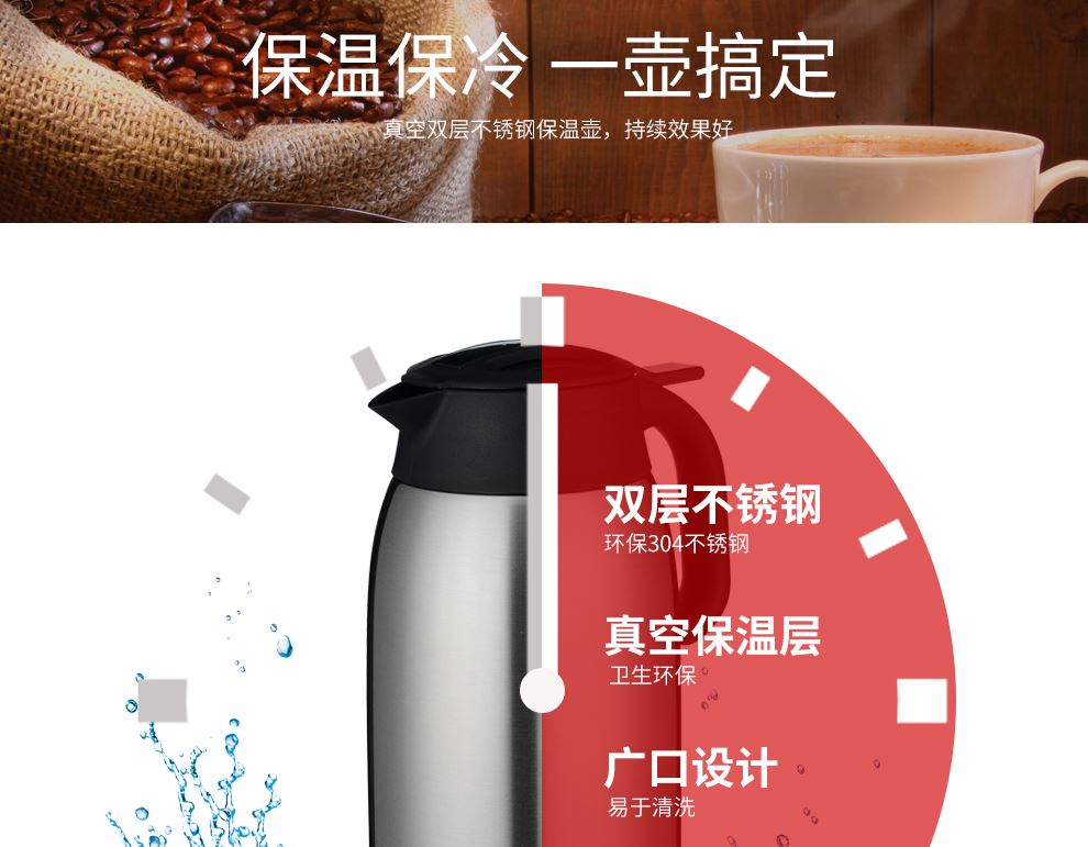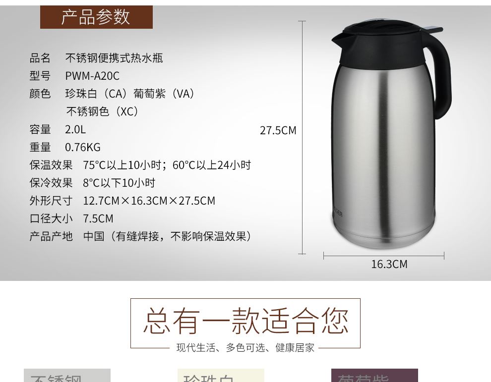 颜色:珍珠白(CA)、葡萄紫(VA)、不锈钢色( XC) 容量:2.0L 重量:0.76KG 保温效果:75°C以上10小时;60°C以上24小时 保冷效果:8°C以下10小时 外形尺寸:12.7*16.3*27.5CM 口径大小:7.5CM 产品产地:中国(有缝焊接,不影响保温效果) 1、壶身宽大,重心稳固,实用而不失时尚; 2、一键式拆卸上盖轻松清洗; 3、大口径设计,可轻松放入冰块,易于清洗; 4、双层不锈钢加真空保温层的设计,拒绝千滚水; 5、适用于办公室、家里、户外。