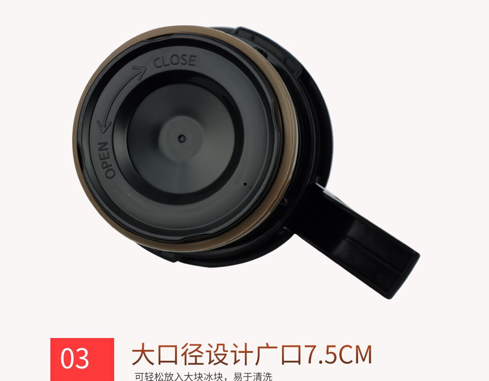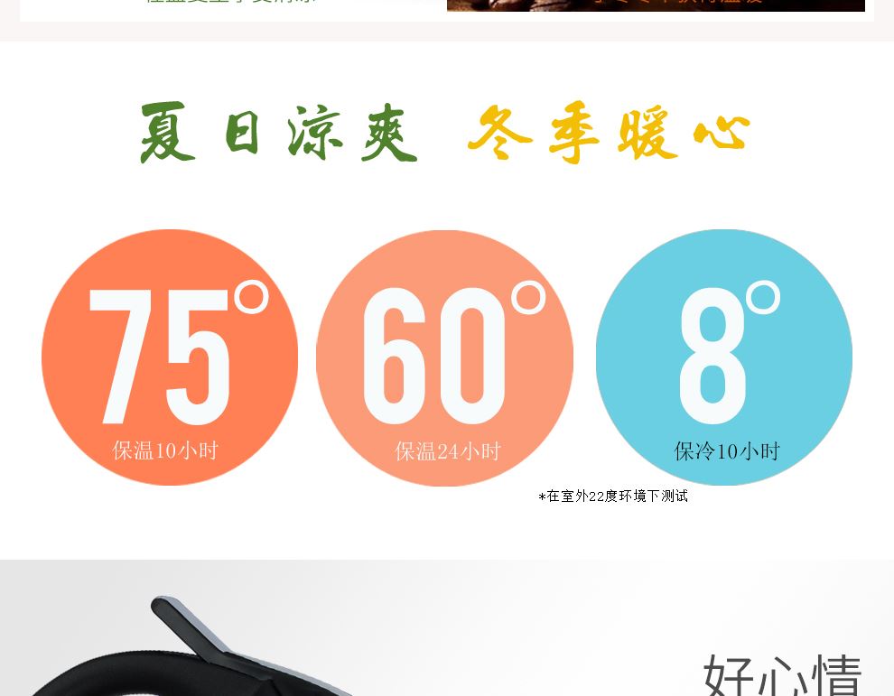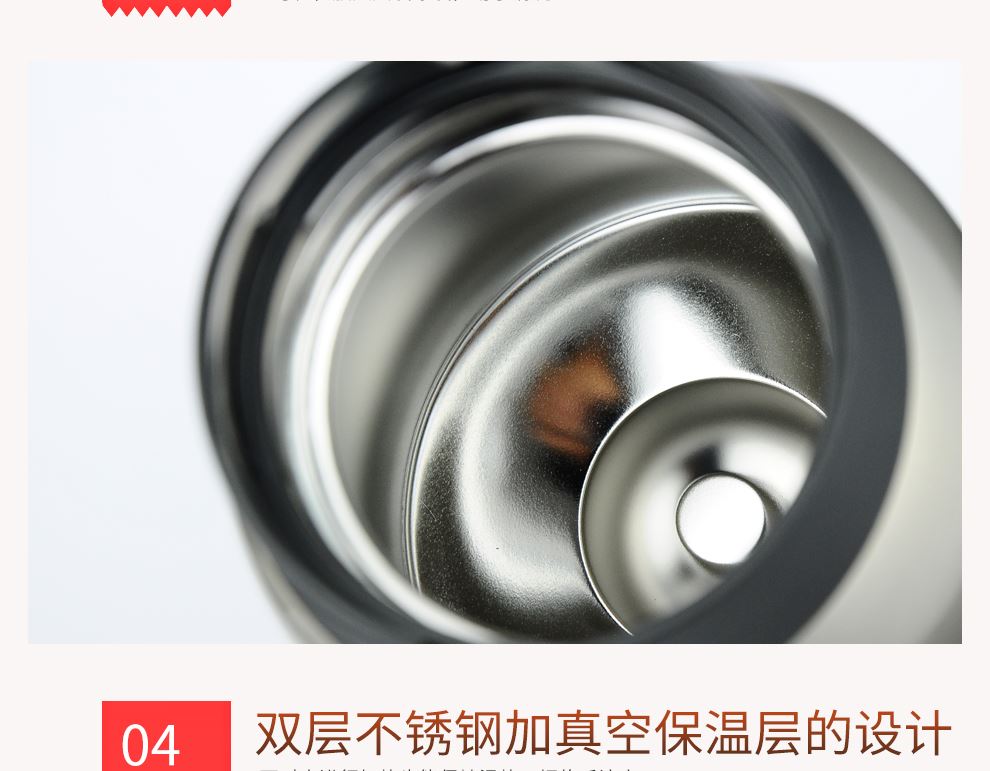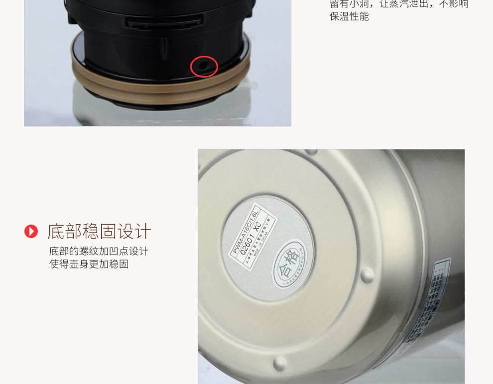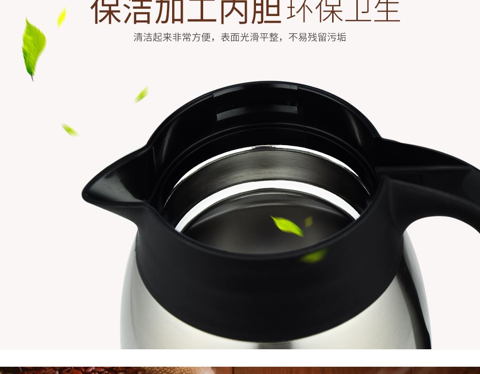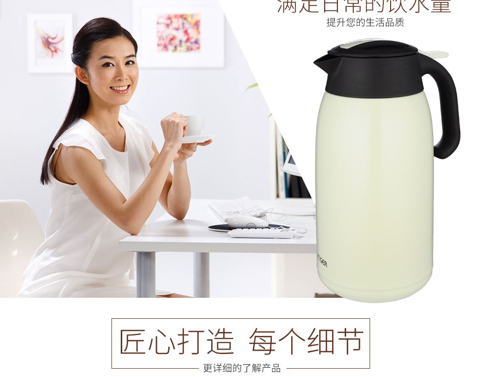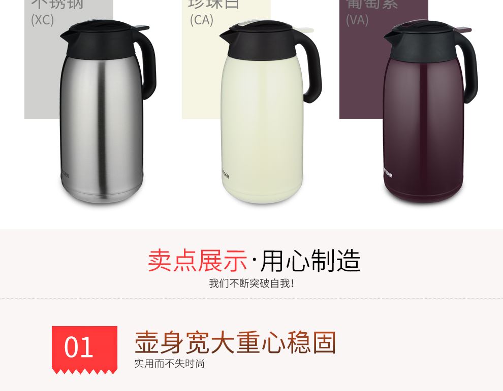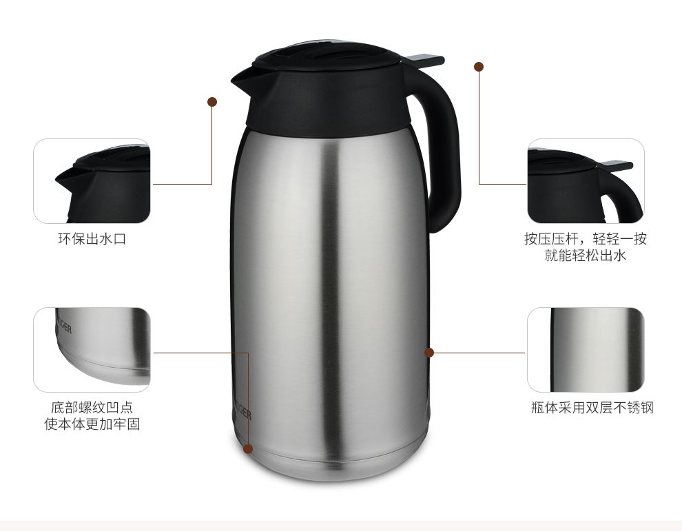 颜色:珍珠白(CA)、葡萄紫(VA)、不锈钢色( XC) 容量:2.0L 重量:0.76KG 保温效果:75°C以上10小时;60°C以上24小时 保冷效果:8°C以下10小时 外形尺寸:12.7*16.3*27.5CM 口径大小:7.5CM 产品产地:中国(有缝焊接,不影响保温效果) 1、壶身宽大,重心稳固,实用而不失时尚; 2、一键式拆卸上盖轻松清洗; 3、大口径设计,可轻松放入冰块,易于清洗; 4、双层不锈钢加真空保温层的设计,拒绝千滚水; 5、适用于办公室、家里、户外。