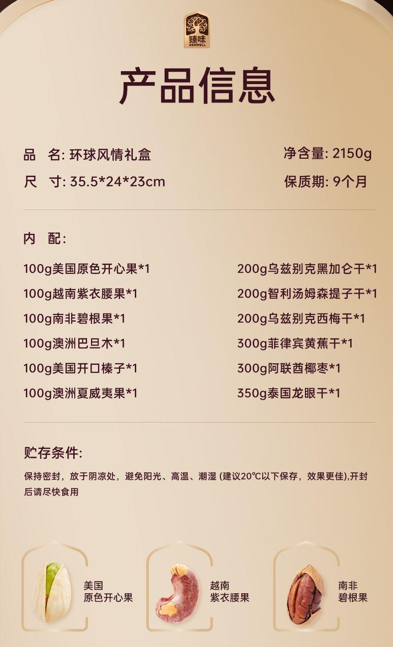 100g美国原色开心果*1 100g越南紫衣腰果*1 100g南非碧根果*1 100g澳洲巴旦木*1 100g美国开口榛子*1 100g澳洲夏威夷果*1 200g乌兹别克黑加仑干*1 200g智利汤姆森提子干*1 200g乌兹别克西梅干*1 300g菲律宾黄蕉干*1 300g阿联酋椰枣*1 350g泰国龙眼干*1 大容量手提箱设计,搭配烫金皮革工艺,缀以抽象艺术肌理,目之所及皆显贵;净含量:2150g,内含6种坚果、6种果干,欧式风情,奢华伴手礼,送礼更体面。