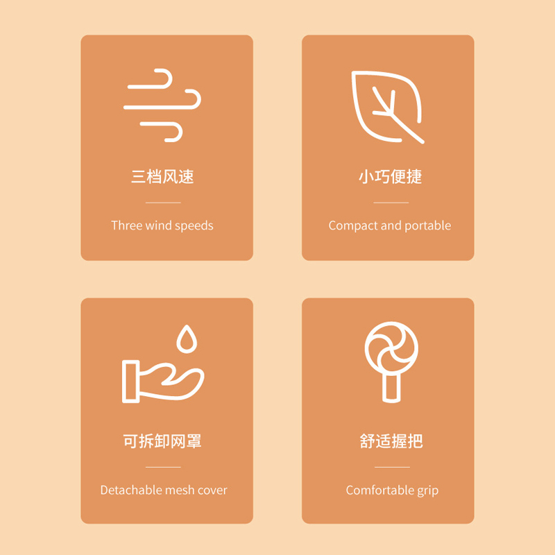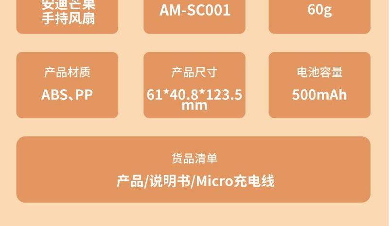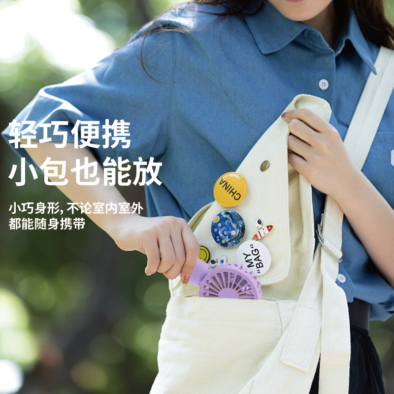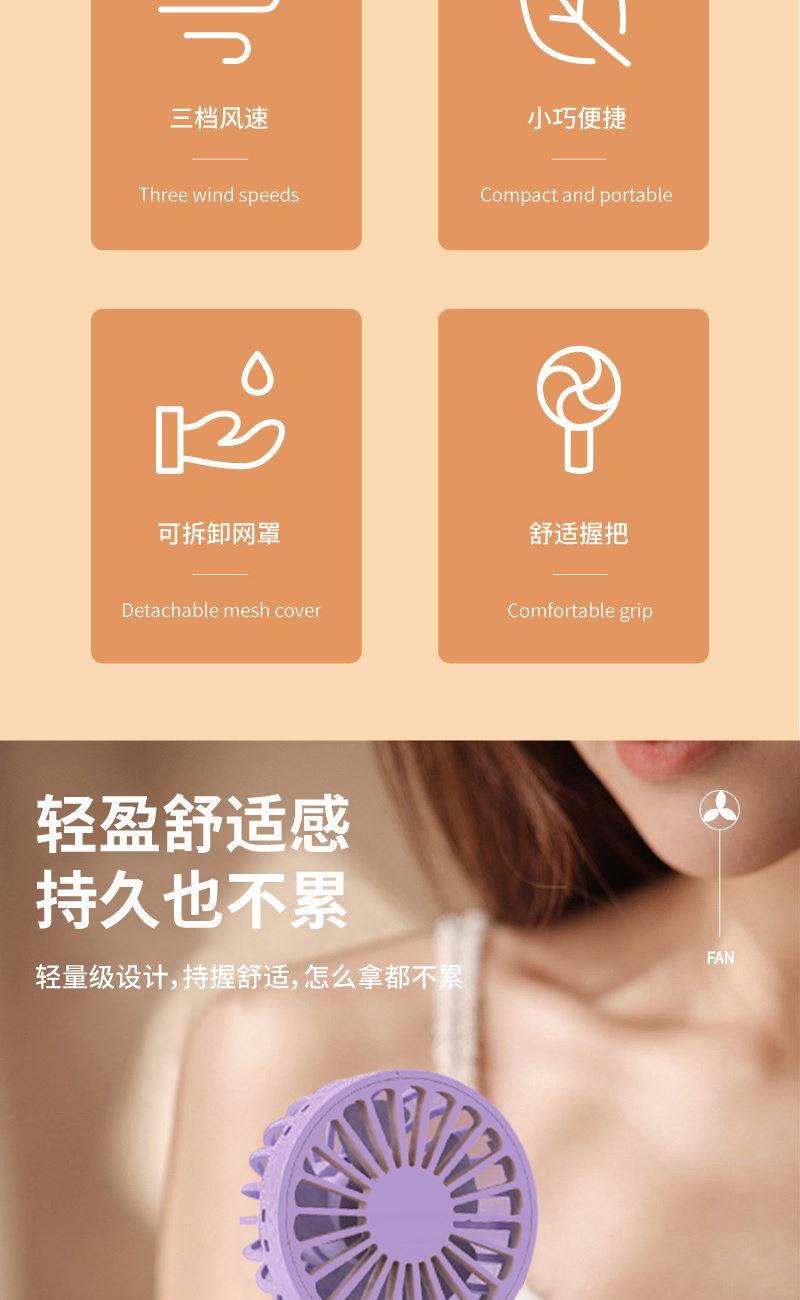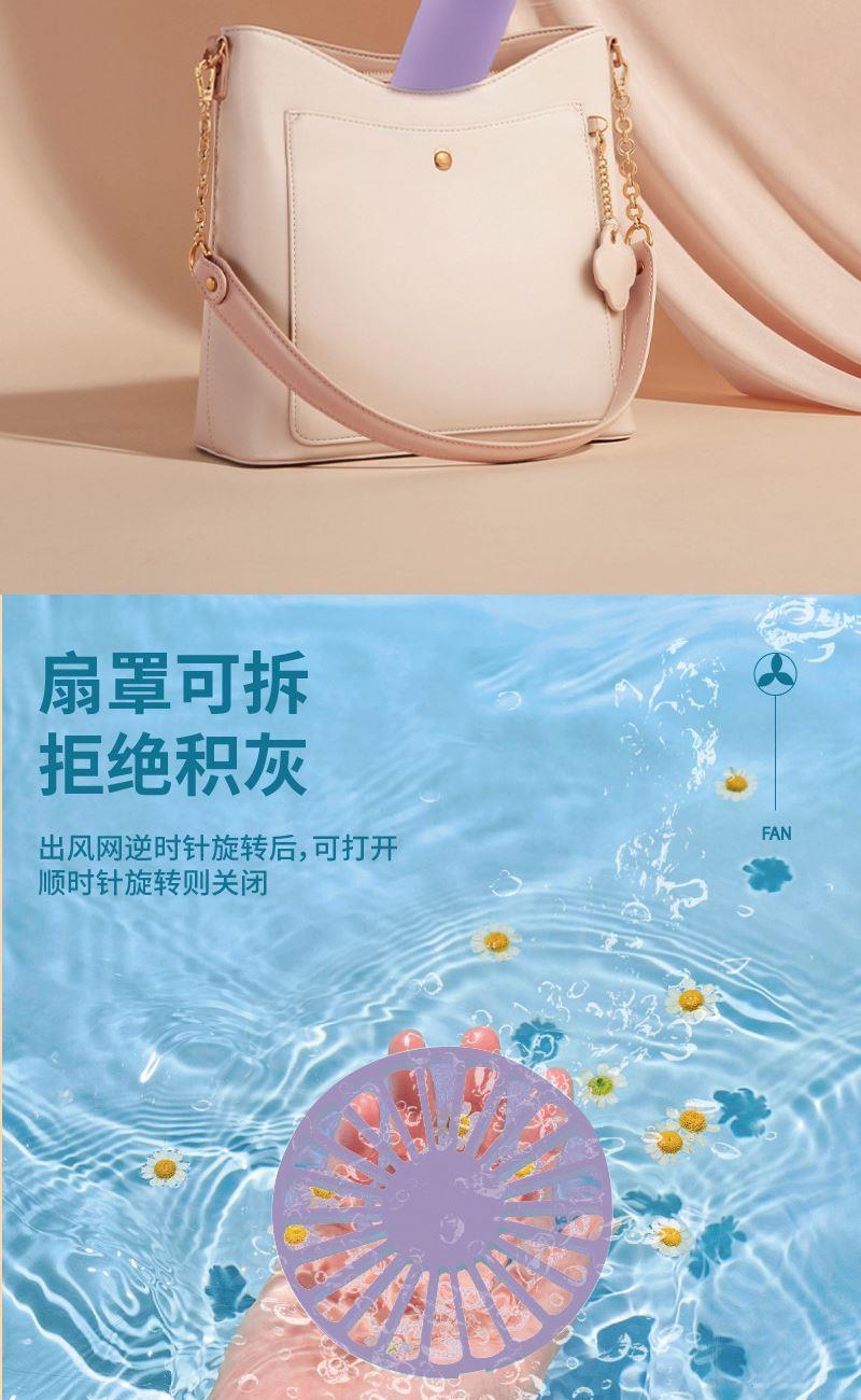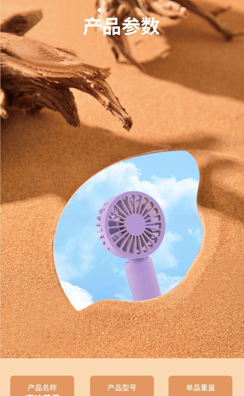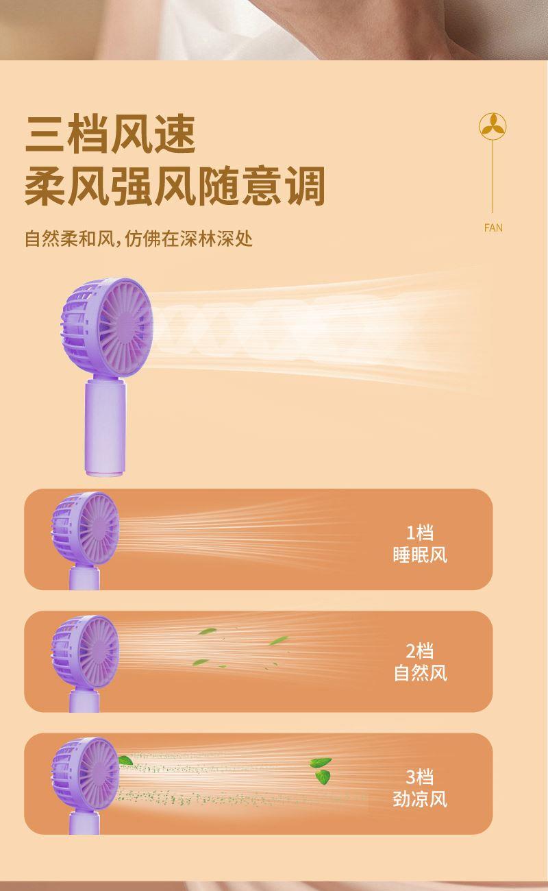 机类型 :无刷电机 外壳工艺 :喷涂(UV漆,橡胶漆,金属漆,钢琴烤漆,珠光粉) 噪音 :36dB(含)以下 内置蓄电池容量 :500mAh-800mAh(含) 产品净重 :60 扇叶数量 :5片 风速档位 :3档 续航时长 :1-3h(含) 尺寸:(300mAh+3档调速) 材 质 :ABS、PP 电池容量 :300mAh 额定电压 :5V ⎓ 额定功率 :3W 充电时间 :约 1.5 小时 使用时间:约 1.3-0.9小时 产品功能:三档风力 产品净重 : 60g 产品毛重 : 70kg 产品尺寸 :61*40.8*123.5mm 产品配置:风扇、USB电源线、说明书、彩盒