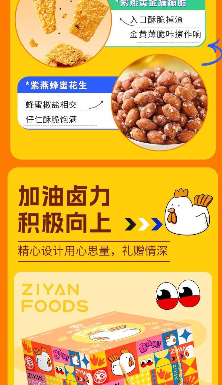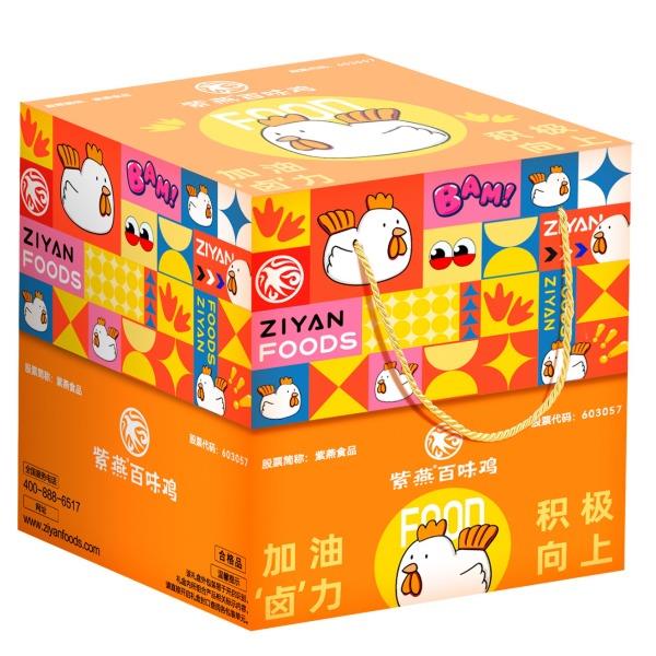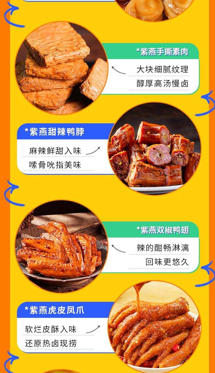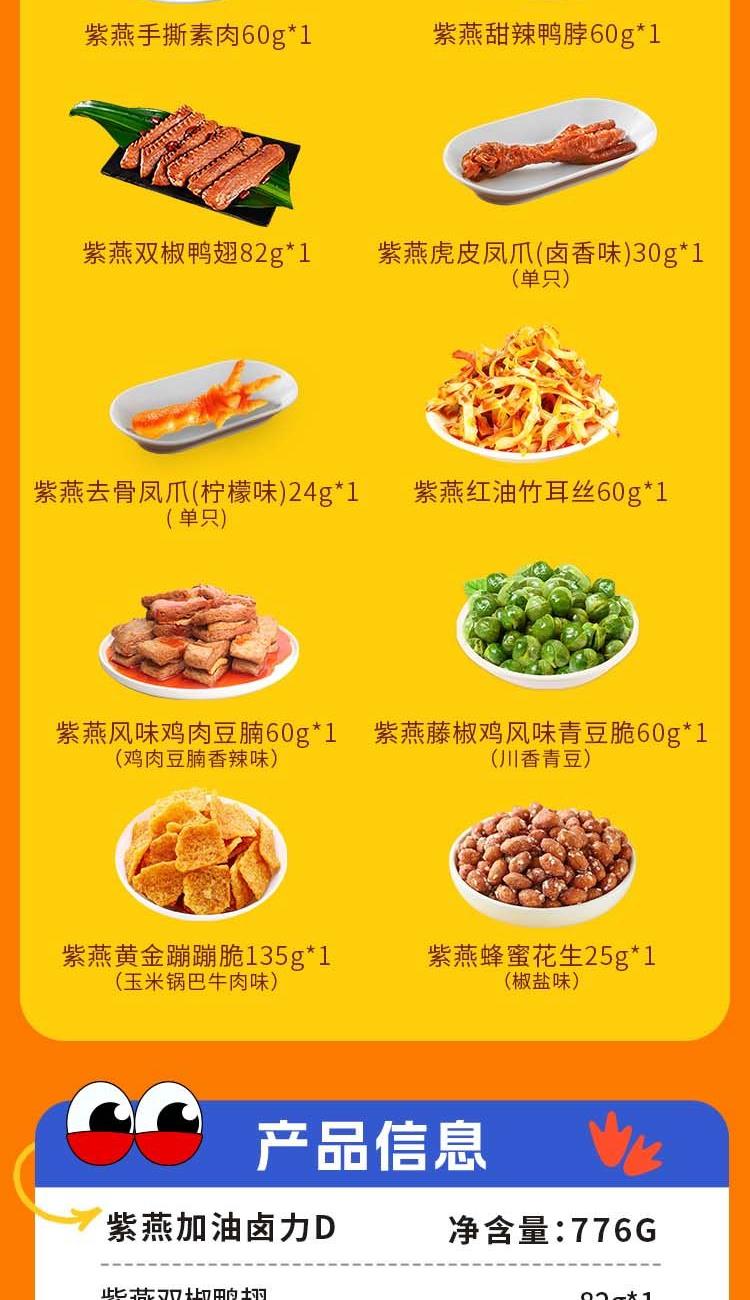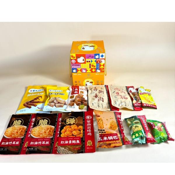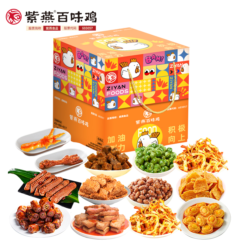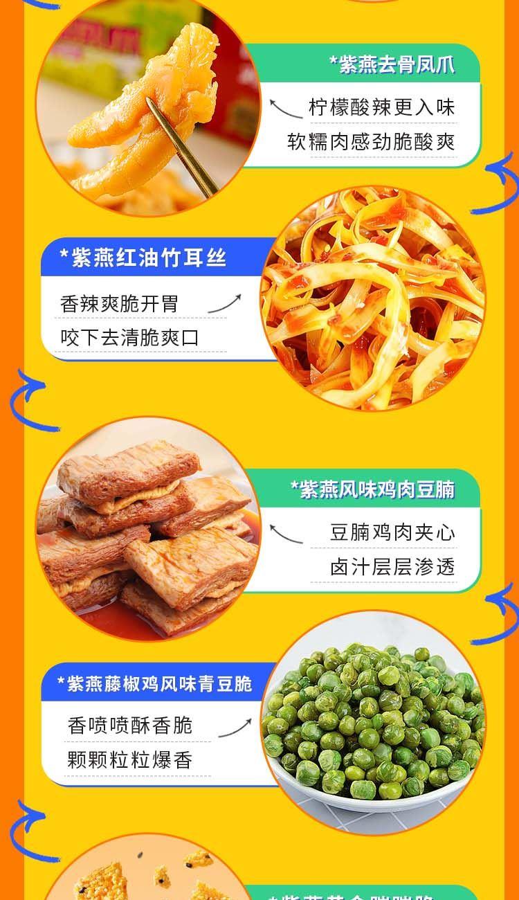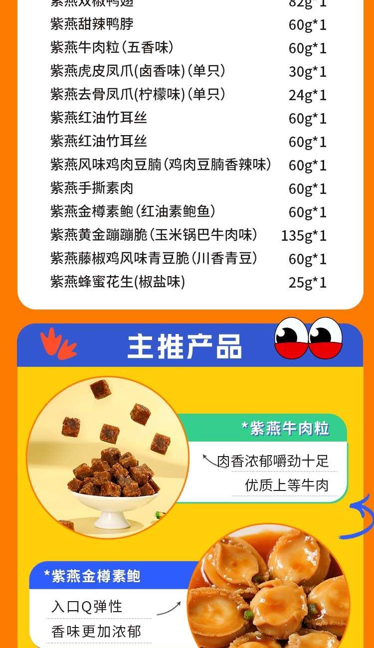 紫燕双椒鸭翅82g*1 紫燕甜辣鸭脖60g*1 紫燕牛肉粒(五香味)60g*1 紫燕虎皮凤爪(卤香味)(单只)30g*1 紫燕去骨凤爪(柠檬味)(单只)24g*1 紫燕红油竹耳丝60g*1 紫燕红油竹耳丝60g*1 紫燕风味鸡肉豆腩(鸡肉豆腩香辣味)60g*1 紫燕手撕素肉60g*1 紫燕金樽素鲍(红油素鲍鱼)60g*1 紫燕黄金蹦蹦脆(玉米锅巴牛肉味)135g*1 紫燕藤椒鸡风味青豆脆(川香青豆)60g*1 紫燕蜂蜜花生(椒盐味)25g*1 礼盒+组装+外盒