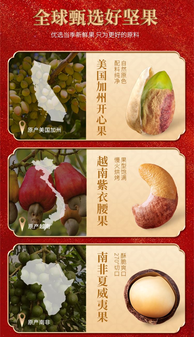 美国加州开心果88g 越南紫衣腰果88g 南非夏威夷果88g 新疆纸皮核桃108g 开口杏核108g 五香打手瓜子188g 鱼皮花生288g 泰国龙眼干288g 夹层山楂288g 若羌灰枣288g 香酥黑豆188g