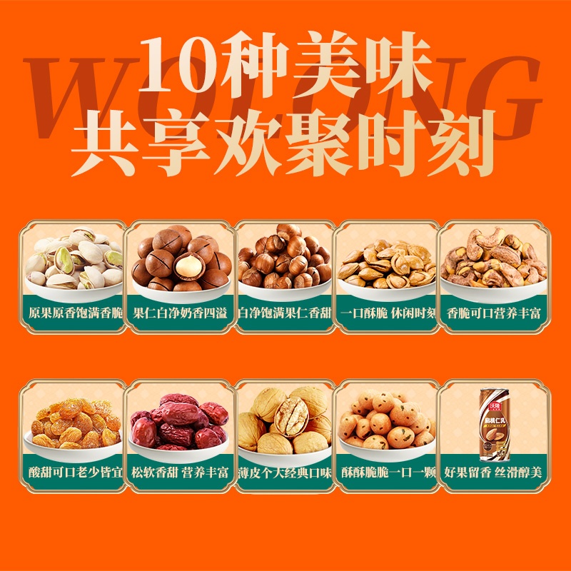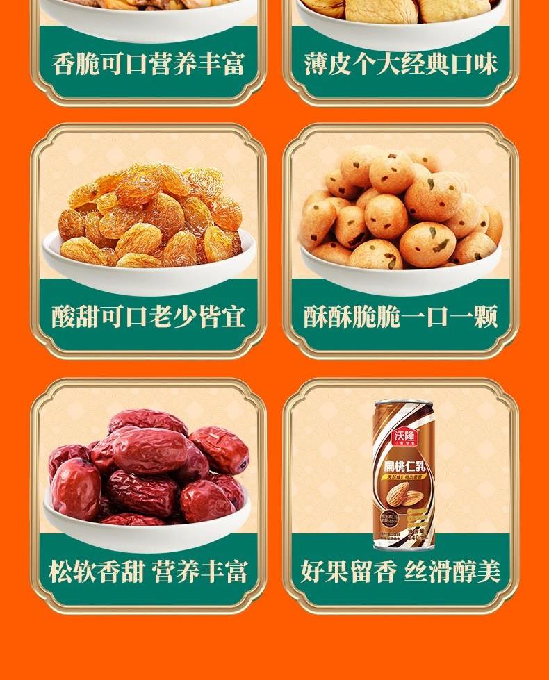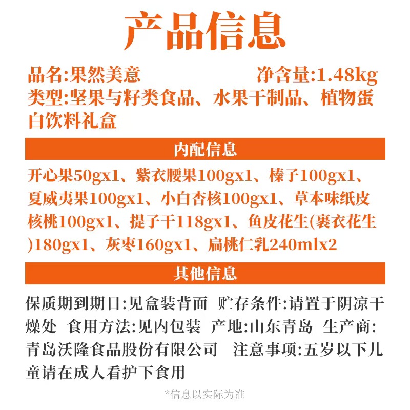 口袋开心果 50g×1袋 榛子 100g×1袋 草本味纸皮核桃 100g×1袋 夏威夷果 100g×1袋 小白杏核 100g×1袋 提子干 118g×1袋 紫衣腰果 100g×1袋 灰枣 160g×1袋 鱼皮花生(裹衣花生) 180g×1袋 扁桃仁乳 240mL×2罐