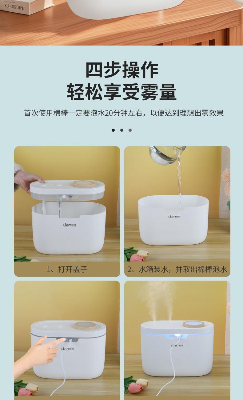 产品参数 输入电压:5V ⎓ 输入电流:1A 额定功率:4W 额定容量:4.5L 雾化量:100mL/h 材质:ABS 产品净重:0.65kg 产品毛重:0.82kg 彩盒尺寸:274x155x197mm 产品特点 1、底座水箱加水设计,实用和美观自然结合,外观简洁时尚。 2、整体结构采用工程塑胶料,颜色搭配时尚。 3、优质超声波雾化头,出雾细腻。 4、内置了智能水位监测器,检测到水位过低,及时自动关机,安全放心使用。 5、一键式开关。