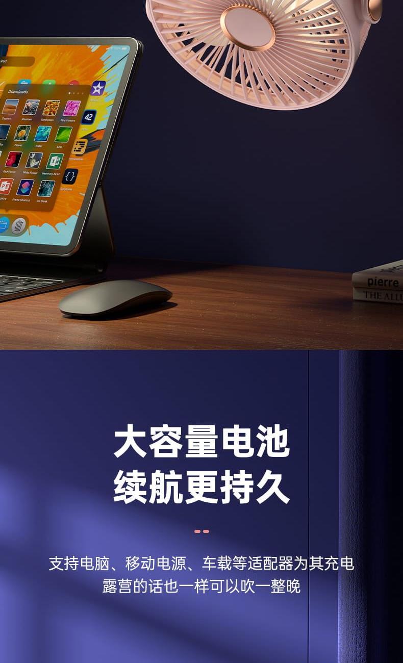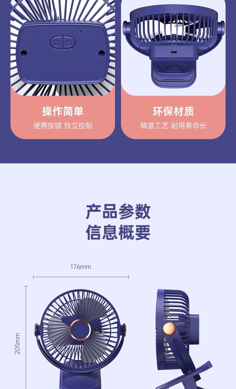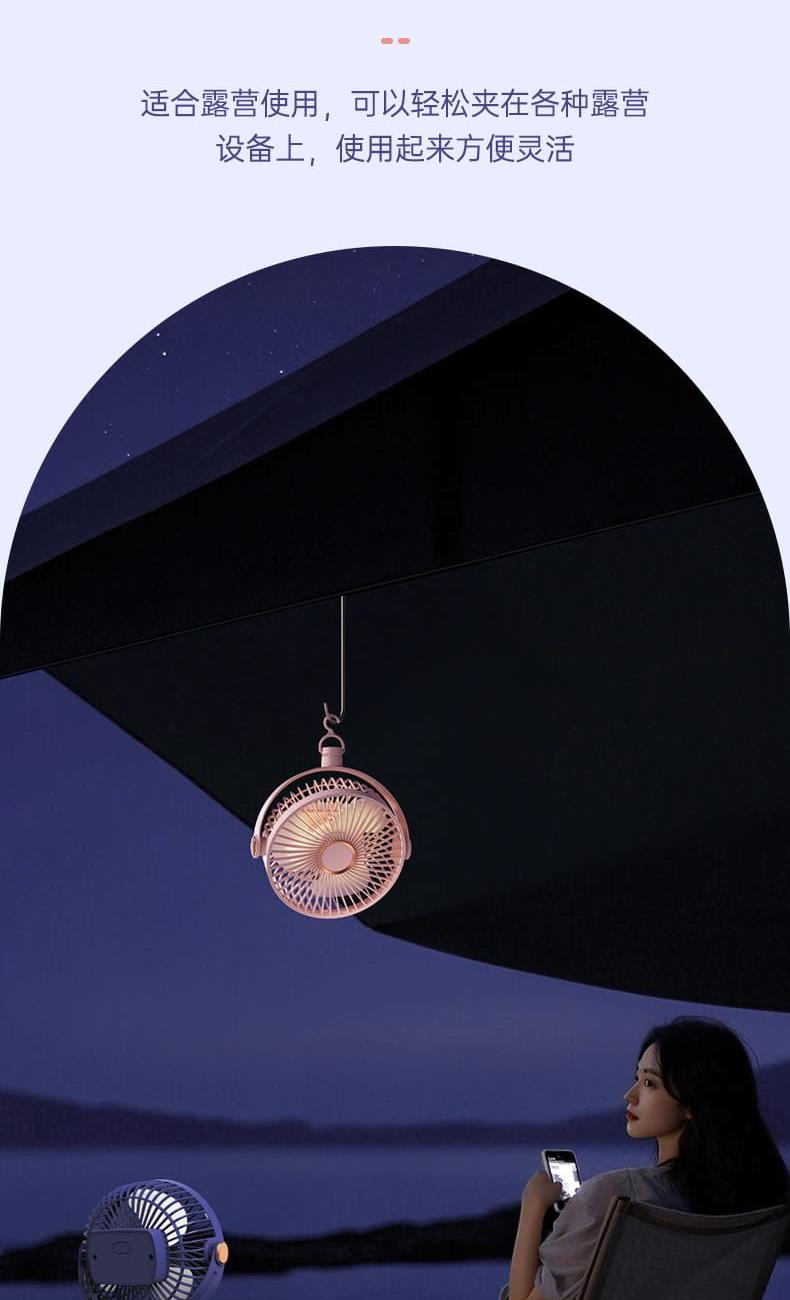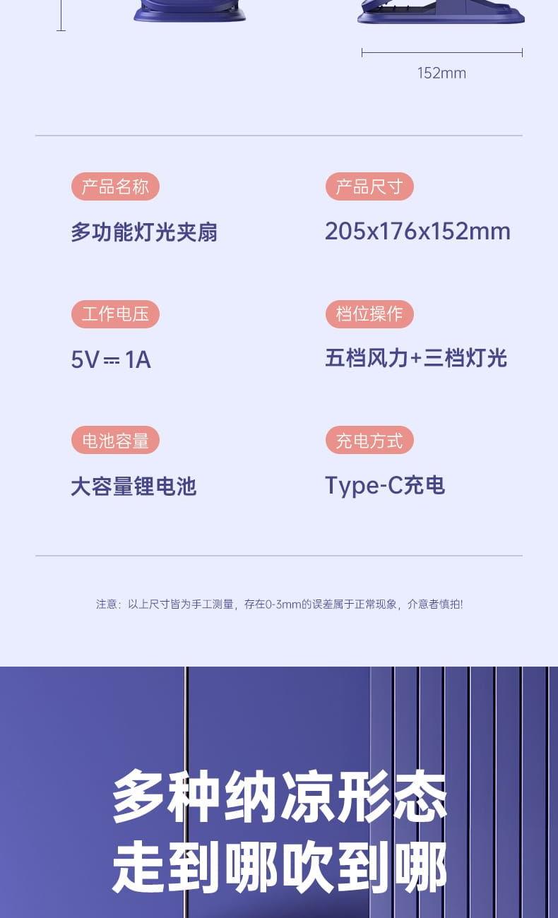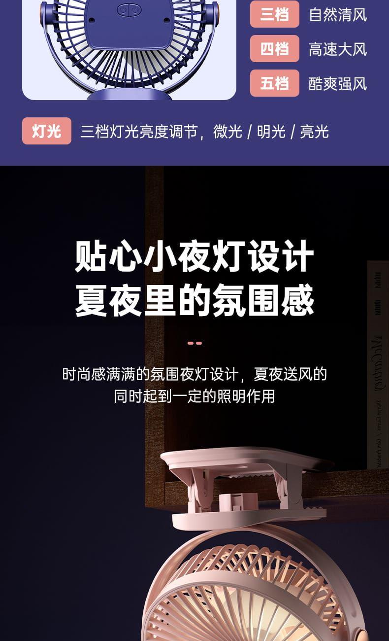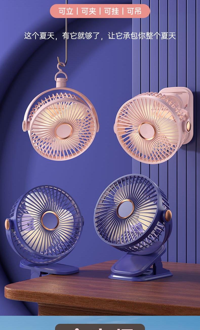 电池容量:800mAh 产品尺寸:176*205*152mm 产品重量:320g 彩盒尺寸:16.5*9.5*21.5cm 外箱尺寸:84.5*39.5*44.7cm/40/13kg 产品颜色:黑色、白色、粉色、蓝色 5档风速,3档灯光可调 内置电池,便携使用 可桌面、可夹、可挂吊使用