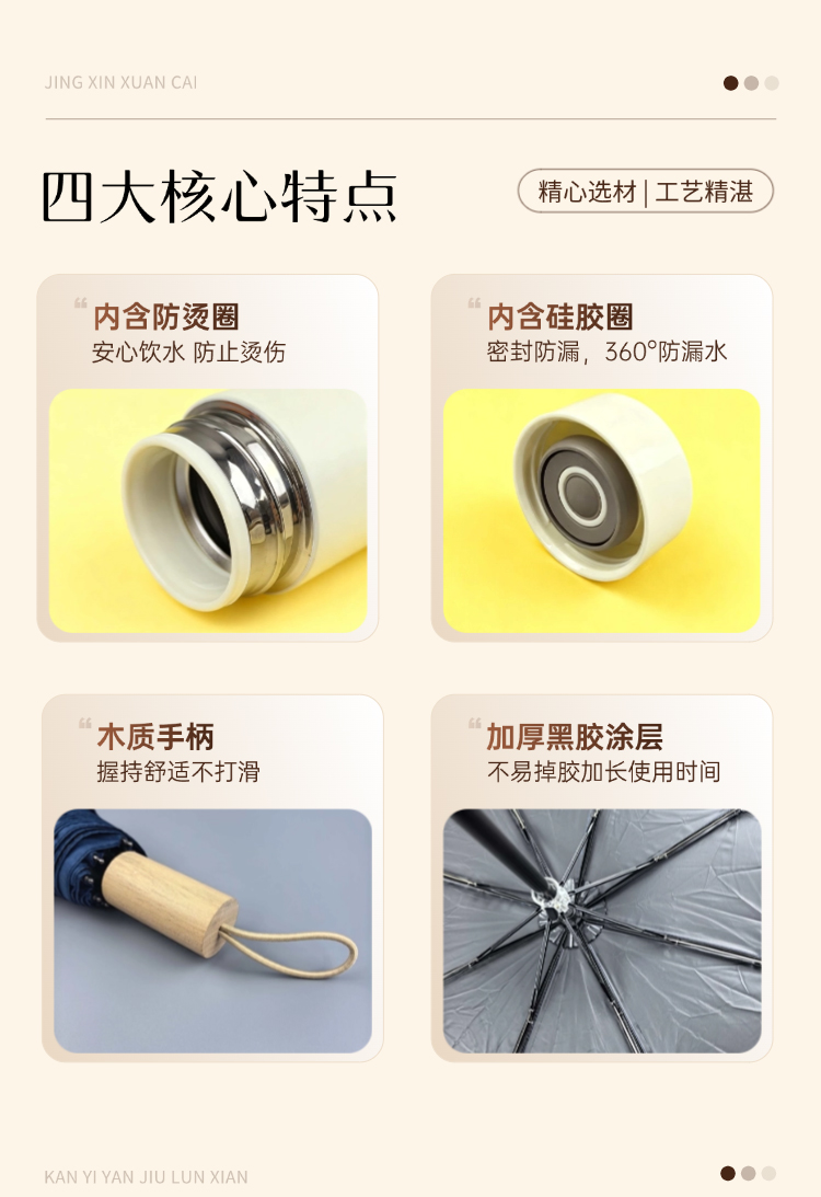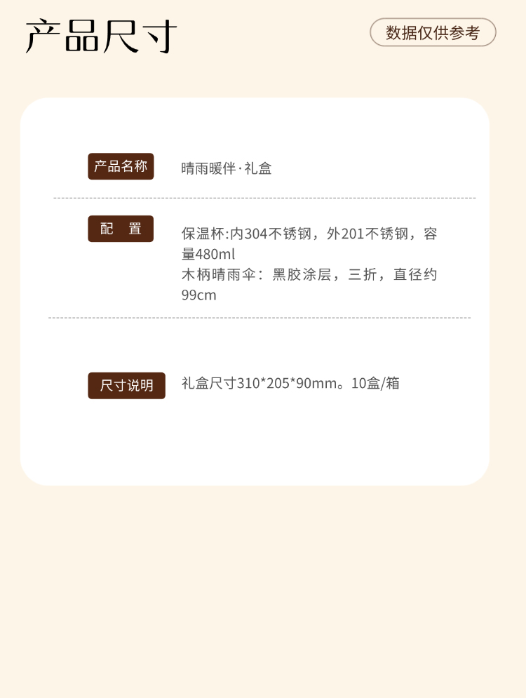 无论晴空万里还是细雨绵绵,这份贴心好礼都时刻相伴!【晴雨暖伴礼盒】为您甄选高品质保温杯,一杯子,暖住幸福温度;搭配轻盈坚固晴雨伞,一伞下,撑起晴朗心情。让它成为您传递温暖的使者,无论自用还是赠礼,都将快乐与关怀融入每个日常点滴。一份心意,双重守护,让温暖不“降温”,让天空常“放晴”! 保温杯 材质:内304不锈钢,外201不锈钢 容量:480ml 木柄晴雨伞 材质:黑胶 尺寸:三折,8骨,直径约99cm
