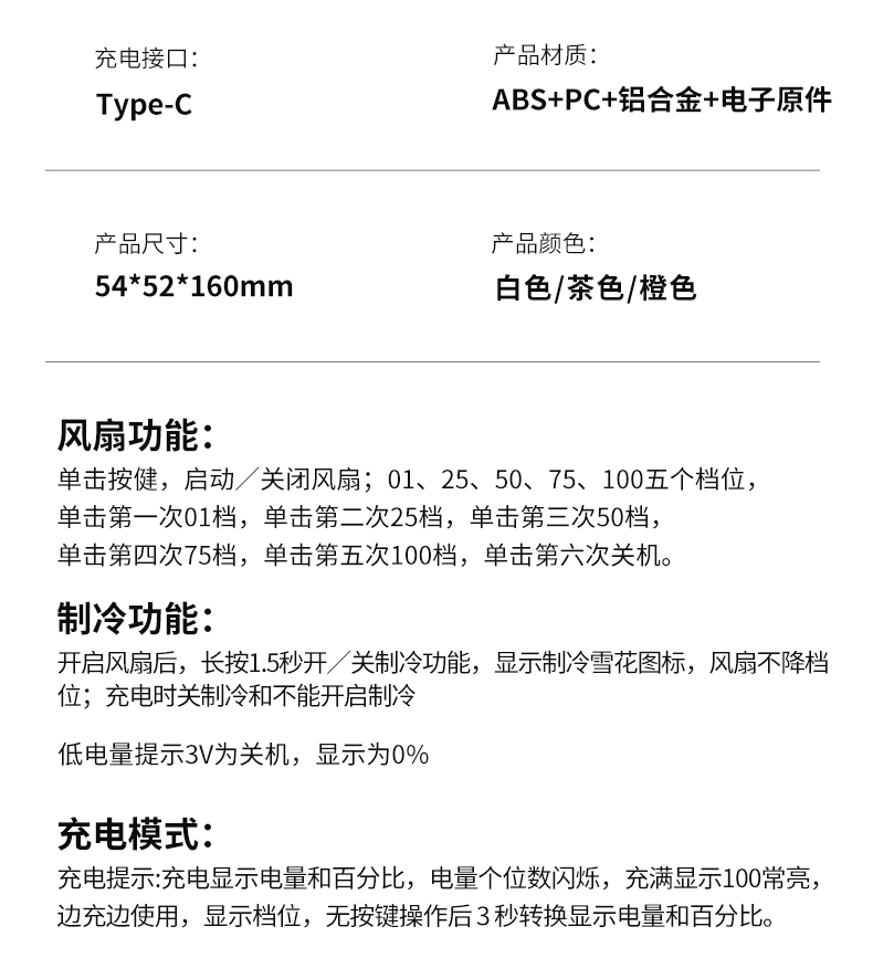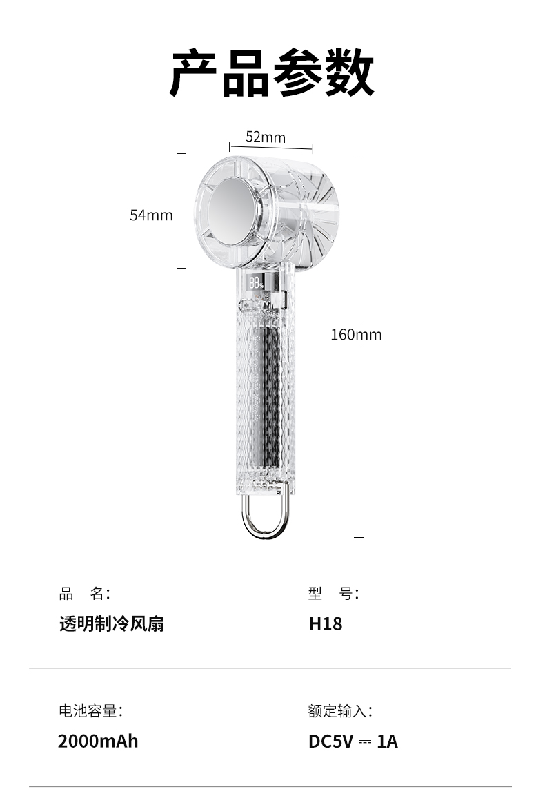 半导体折叠制冷手持风扇 产品型号:H18 产品颜色:白色/茶色/橙色 电池容量:2000mAh 产品材质:ABS+PC+铝合金+电子原件 产品尺寸:54*52*160mm 产品包装:56*53*163mm 一箱数量: 96pcs 外箱尺寸: 44.5*35*34.5CM 产品净重/毛重:146.5G/176G 整箱净重/毛重:17KG/18KG 【推荐理由】: 机甲透明风扇,登上扣方便携带 高速无刷电机,高颜值数显风扇 100档风速可调节 2000毫安大容量 一档超长续航8小时