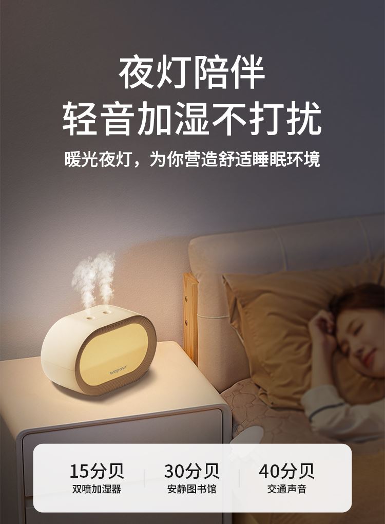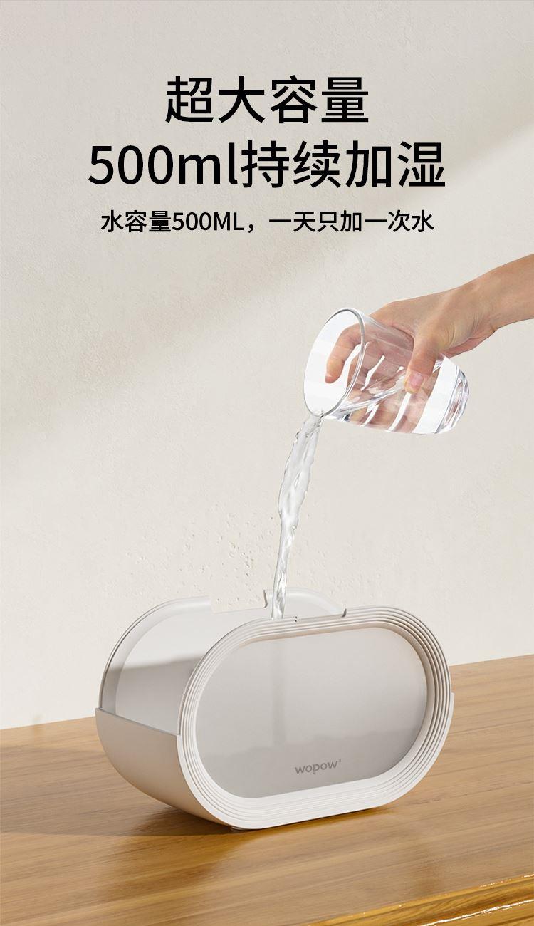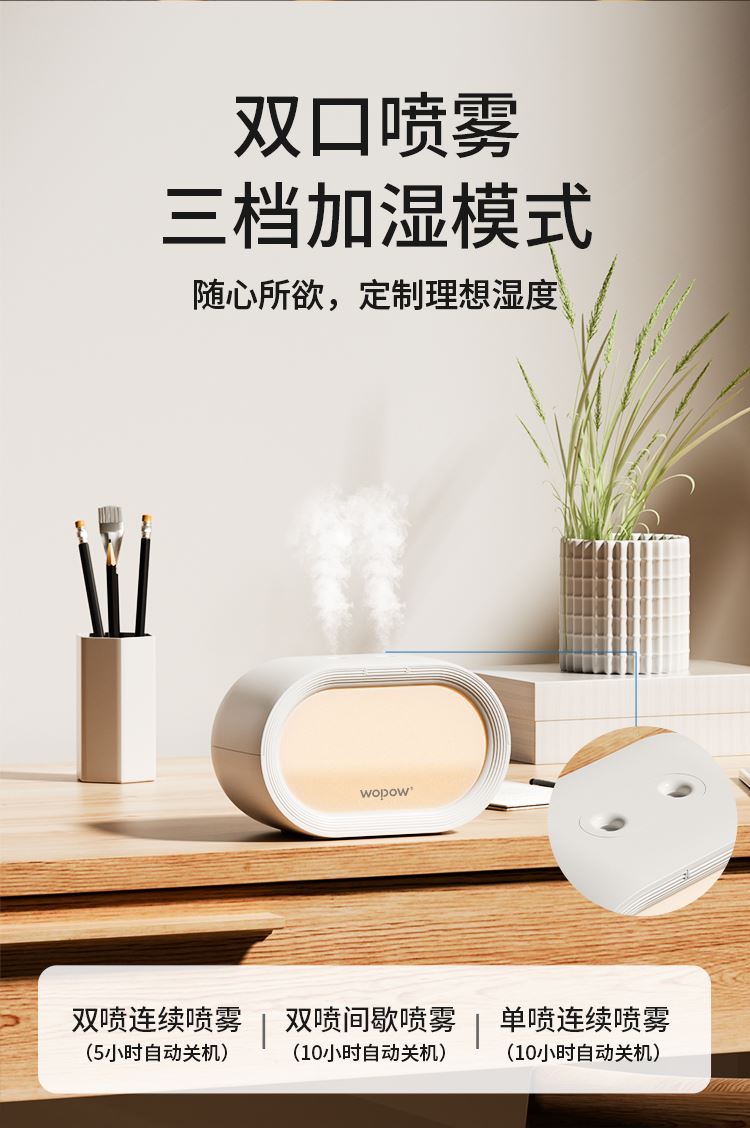容量:500ML 产品尺寸:165*72*104.5mm 包装尺寸:168*110*75mm 产品重量:330g 喷雾时间:5-10小时 双喷雾连续喷雾5小时自动关机,双喷雾间歇喷雾/单喷雾连续喷雾10小时自动关机 喷雾量:约40ML/H 输入TYPE-C,5V1A 颜色:白 材质:ABS+PP 暖白氛围灯光,双喷头 静音加湿,纳米细雾 轻音运行,一键操作 TYPE-C输入,大容量 三档加湿,四季通用