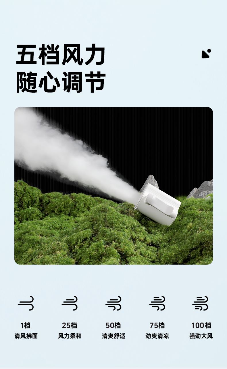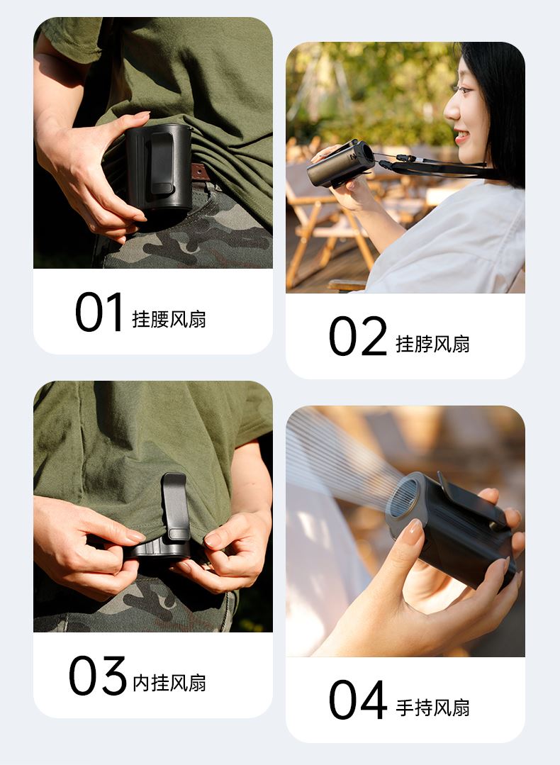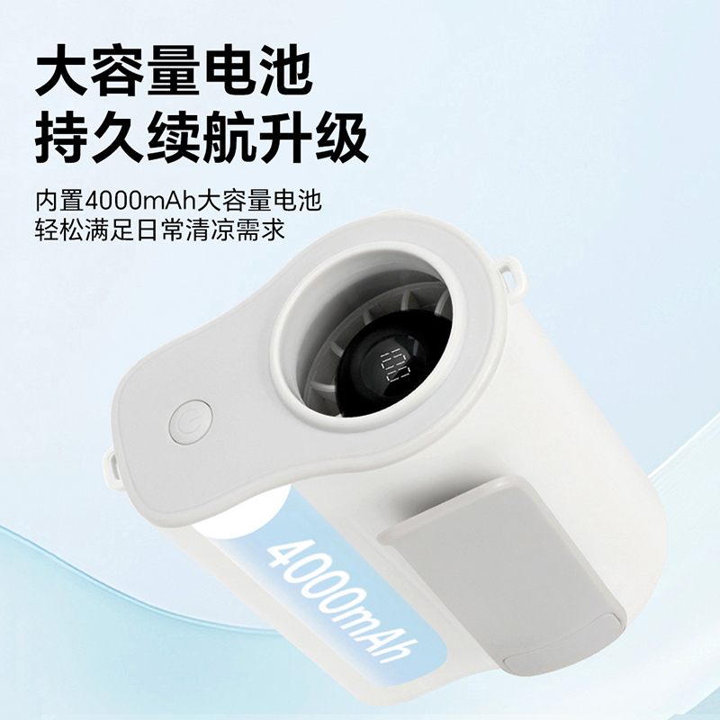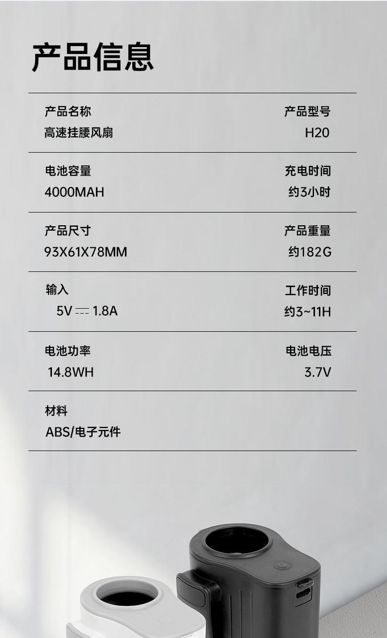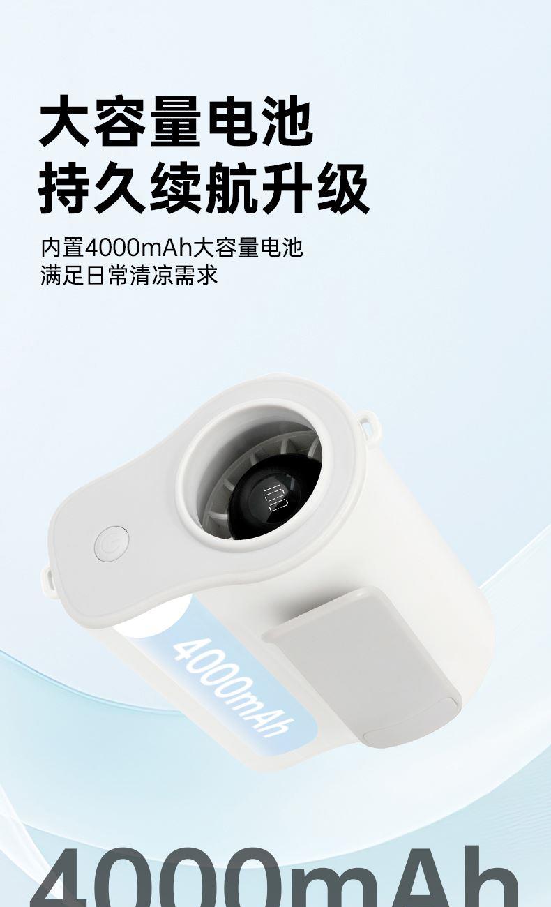 *100档风力调节,配挂绳可挂脖 *12500转速,LDE屏幕数显 *内外双夹专为挂腰设计,4000毫安电池容量