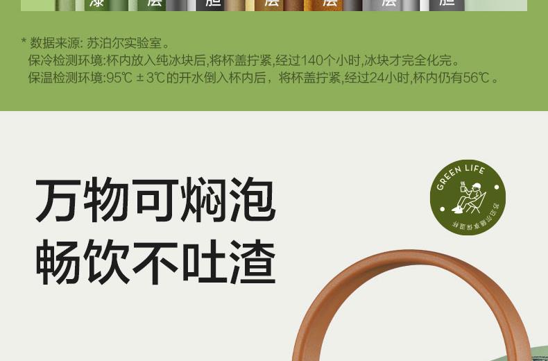 容量(L) 1.0L 材质 内胆316L不锈钢 规格参数 产品说明 代发在库颜色:高山绿/岩木黑 商品毛重(kg):0.85 功能卖点 1、1.0L大容量,旅行、居家好帮手; 2、双层钢盖,热水入杯不烫手,饮用更安心; 3、强效保冷140小时+;保温24小时+; 4、一杯双用(直饮、杯盖); 5、316不锈钢茶滤片,万物皆可泡; 6、316不锈钢内胆、杯盖,环保,健康; 7、360°密封不漏水,便携提手,随拎随走。