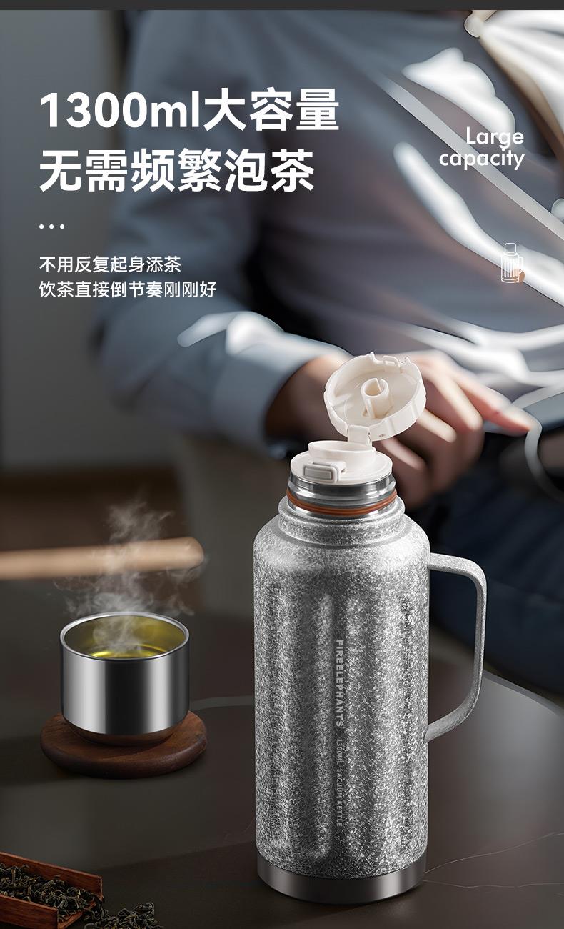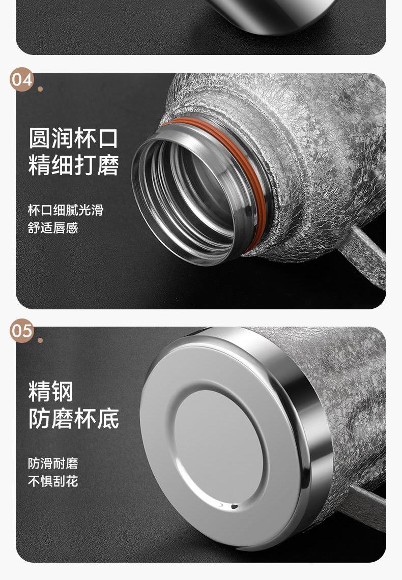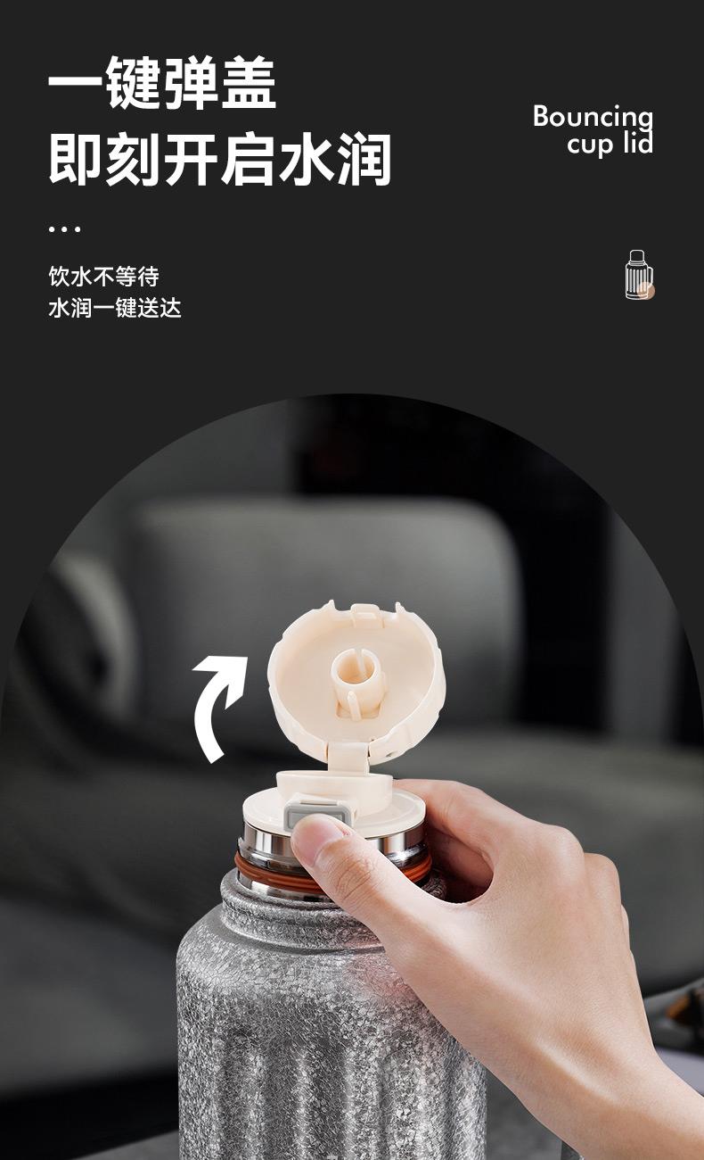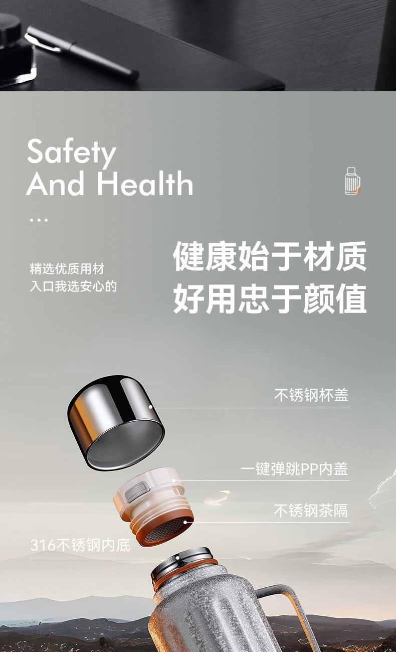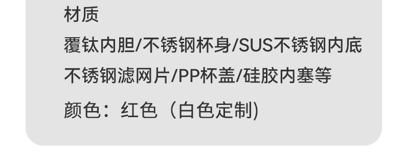规 格:1300ml 材 质:内胆底片SUS316不锈钢,内胆壁体SUS304不锈钢 PP(食品级)+不锈钢茶隔 ,杯盖 SUS304不锈钢 颜 色:红色(白色定制) 彩 盒 尺 寸:140x120x335mm 外 箱 尺 寸:L62.5*W50.5*H37cm 1、创意不锈钢小水杯搭配一键弹跳内盖,便捷饮水随心切换,双重真空保温时效超长。 2、内胆采用一体食品级不锈钢,内壁光滑细腻,不易粘附水垢,为您的健康保驾护航。 3、耐高温,抗腐蚀,密封度强,长效保温/保冷,密封防漏,内置茶隔,可茶水分离。 4、人体工程学手柄设计,握感舒适,外观简约而不简单。