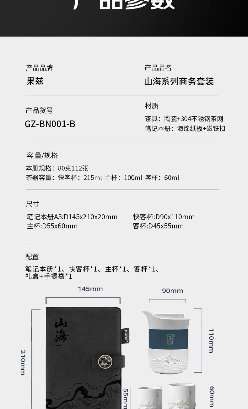 配 置:笔记本册*1、快客杯*1、主杯*1、客杯*1、 礼盒+手提袋*1 本册规格:80克112张 茶器容量:快客杯:280ml 主杯:80ml 客杯:40ml 材 质:茶具:陶瓷+304不锈钢茶网 笔记本册:海绵纸板+磁铁扣 尺 寸:笔记本册A5:D145x210x20mm 快客杯:D96x128mm 主杯:D54x60mm 客杯:D43x55mm