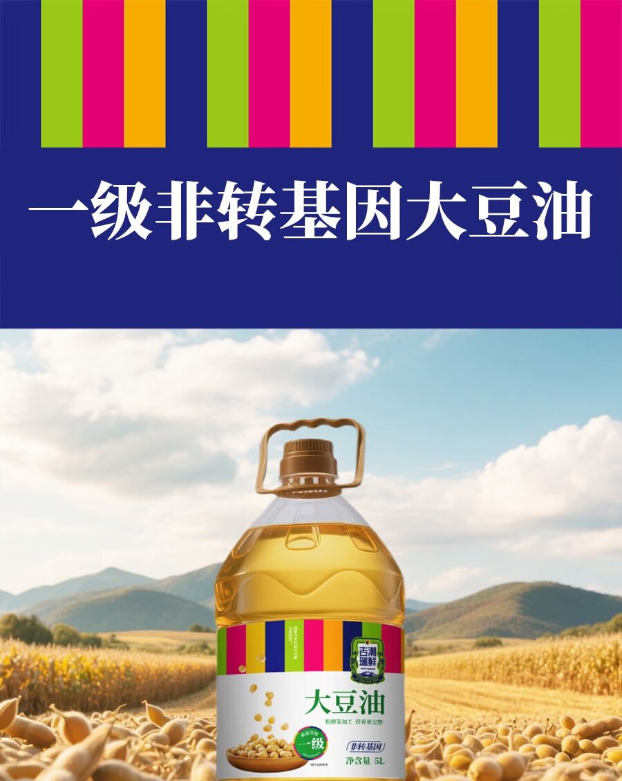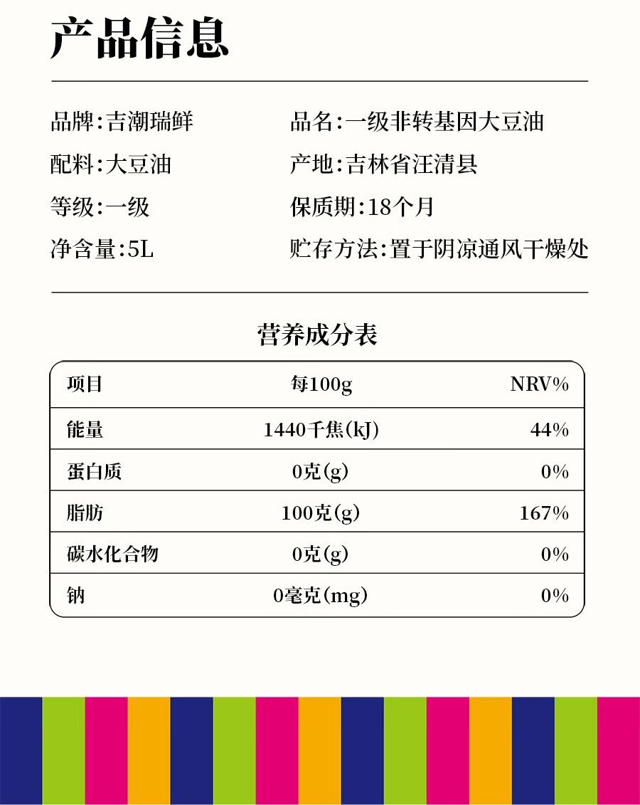 吉潮瑞鲜一级非转基因大豆油5L 配料:大豆油 等级:一级 净含量:1.8L 产地:吉林省汪清县 保质期:18个月 贮存方法:置于阴凉通风干燥处