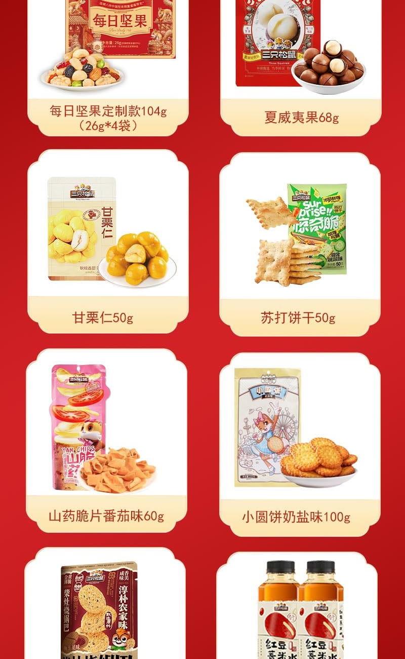 三只松鼠每日坚果定制款104g(26g*4袋) 三只松鼠夏威夷果68g 三只松鼠甘栗仁50g 三只松鼠苏打饼干50g 三只松鼠山药脆片60g 三只松鼠小圆饼奶盐味100g 三只松鼠柴灶烧锅巴60g 三只松鼠红豆薏米水500ml 三只松鼠红豆薏米水500ml