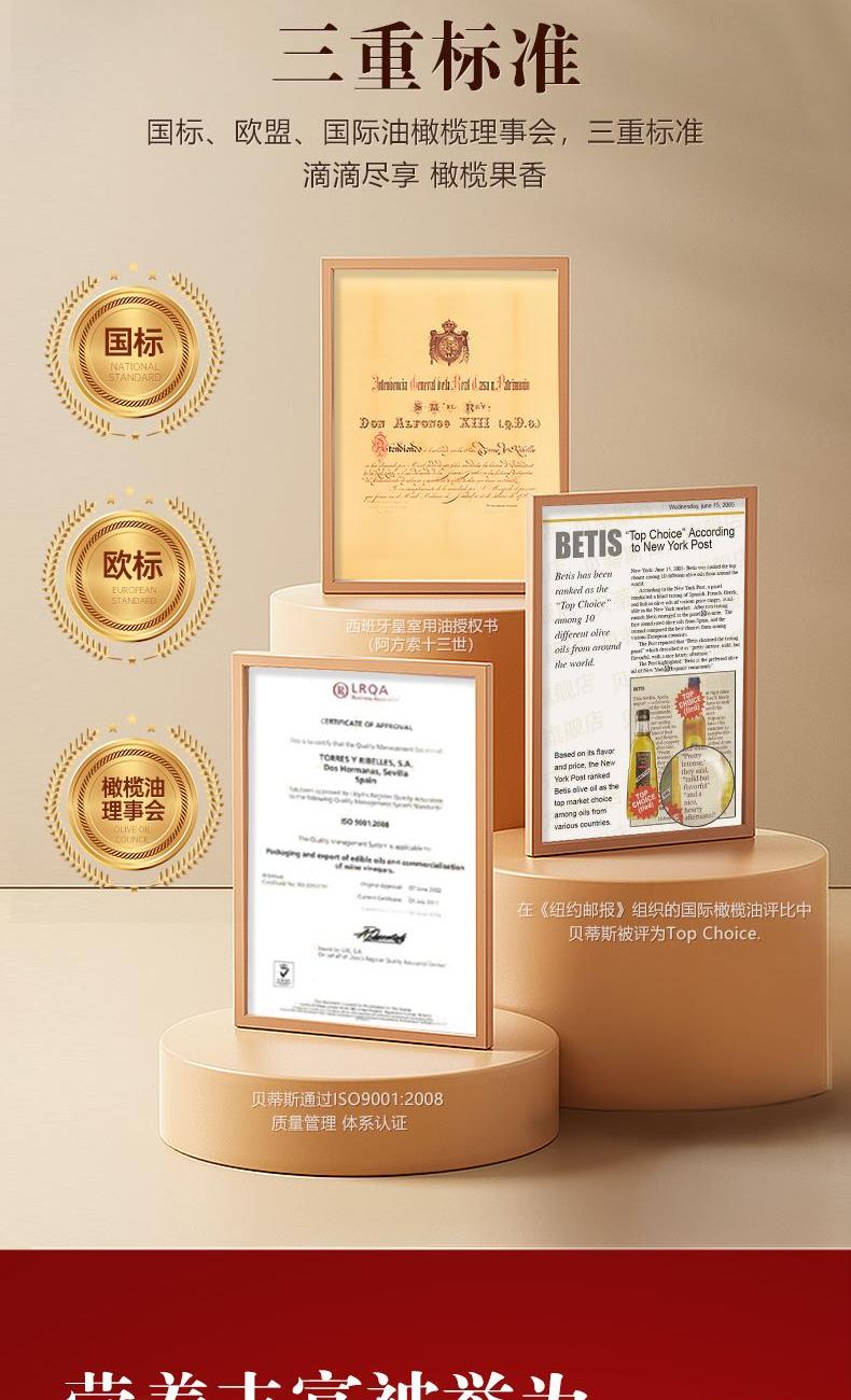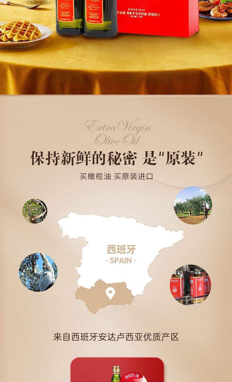 西班牙百年企业, 原瓶原装进口,西班牙皇室用油 产品类型:特级初榨橄榄油 产地:西班牙 产品容量:750ml*2 保质期:2年