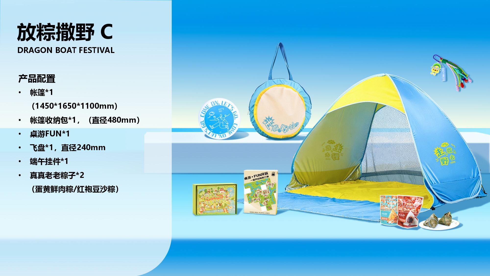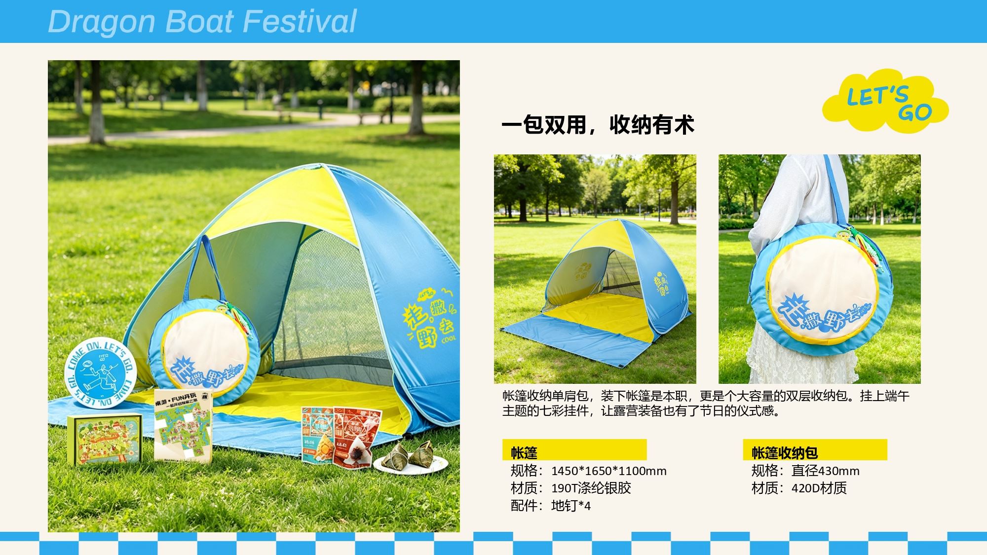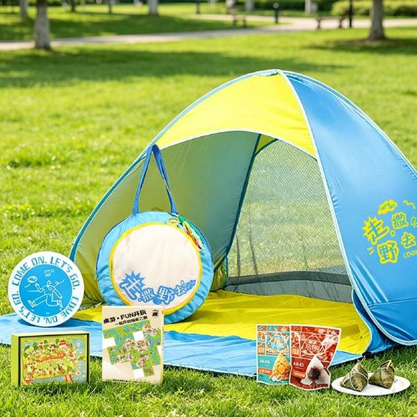 产品配置 帐篷*1 (1450*1650*1100mm) 帐篷收纳包*1,(直径480mm) 桌游FUN*1 飞盘*1,直径240mm 端午挂件*1 真真老老粽子*2 (蛋黄鲜肉粽/红袍豆沙粽)