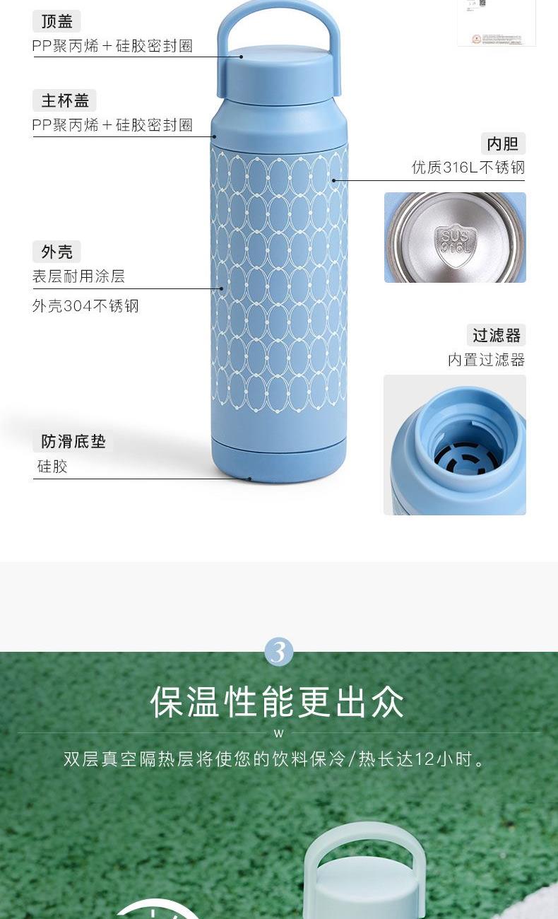 尺寸:高度: 26.5cm 直径:7.3cm 颜色:野草莓-白 产地:中国大陆 杯身:外层304不锈钢;内层316不锈钢 杯盖:PP聚丙烯;Silicone硅胶密封圈 内层采用优质SS316不銹钢材质,具有更好的耐腐蚀性和出色的绝缘性能 结合提手的上盖设计,易于携带。 保温/保冷可达12小时,保冰24小时 由耐用的食品级不锈钢制成。 防漏杯盖设计