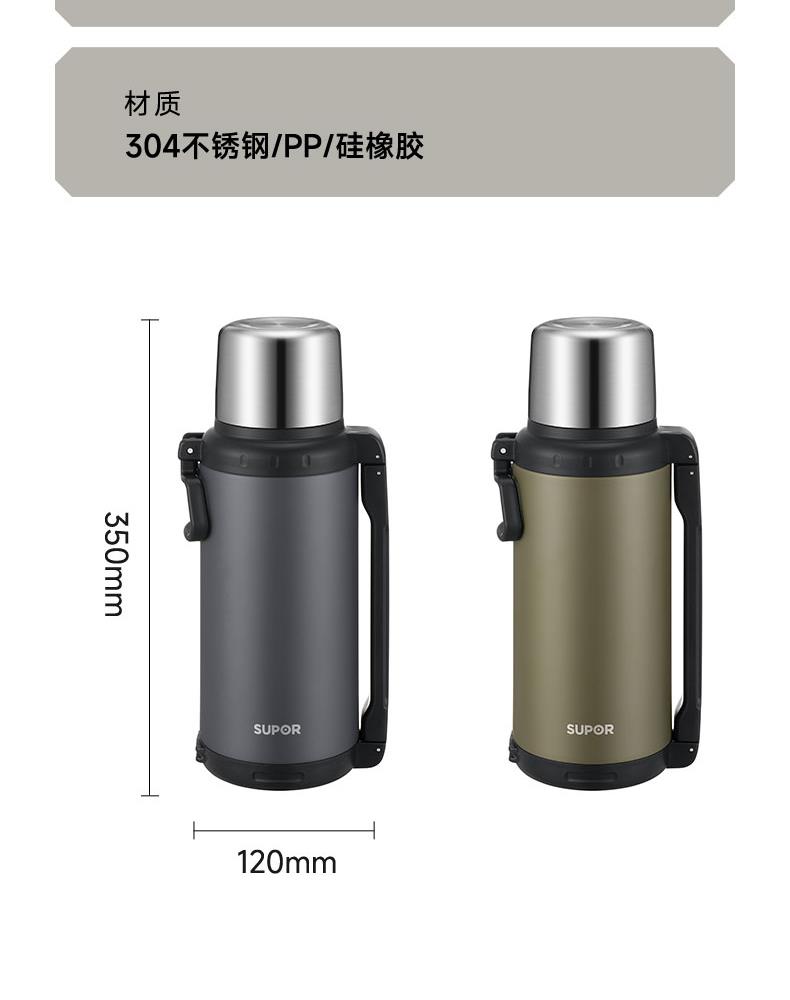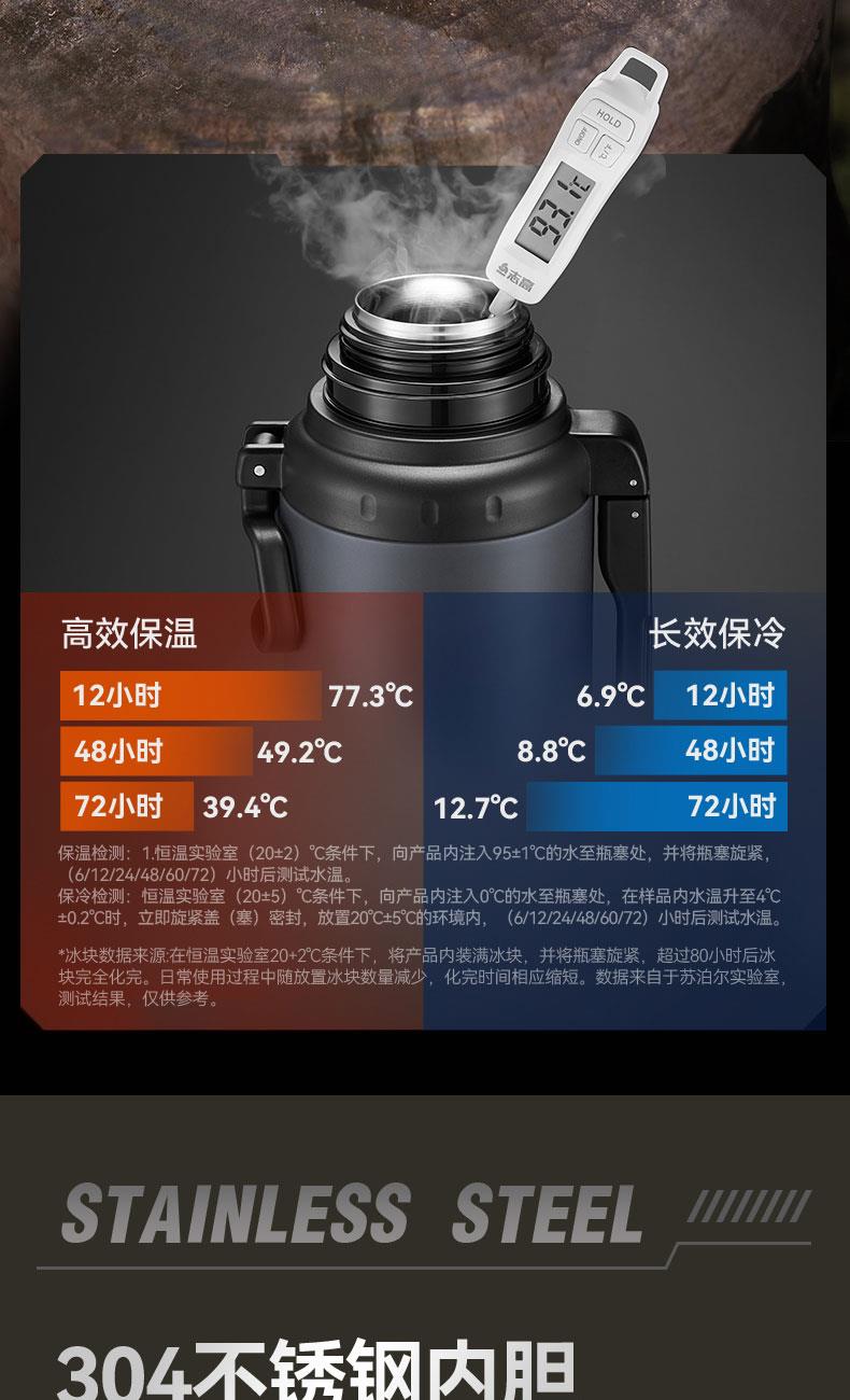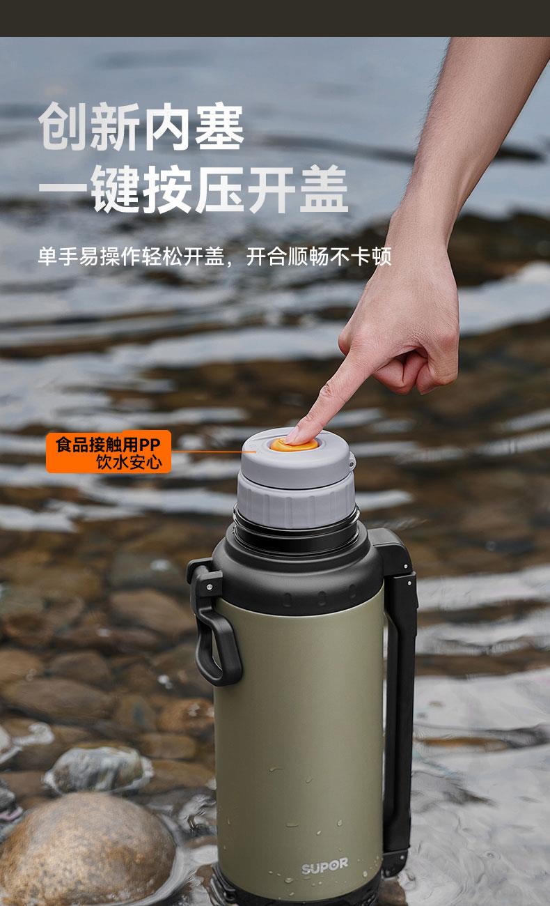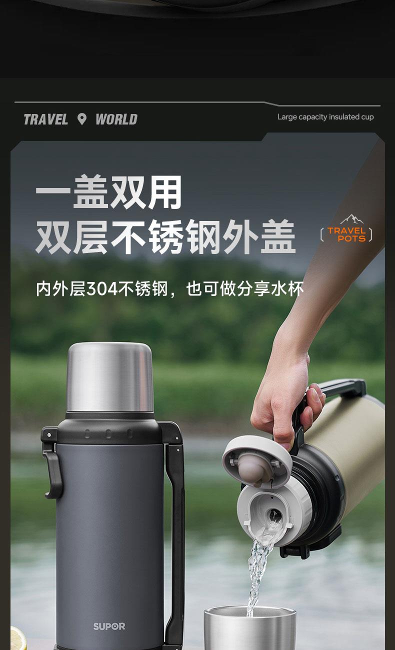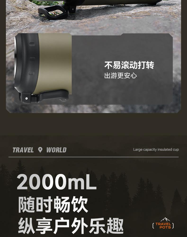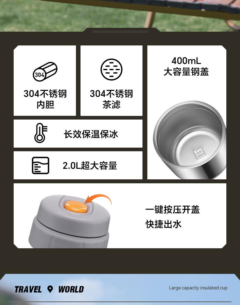 容量(L) 2.0L 材质 内胆304不锈钢 规格参数 代发在库颜色:高山绿/漫暮黑 商品毛重(kg):0.85 572*286*365 功能卖点 1、2L大容量,旅行、居家好帮手; 2、双层钢盖,热水入杯不烫手,饮用更安心; 3、强效保冷140小时+;保温24小时+; 4、一杯双用(直饮、杯盖);