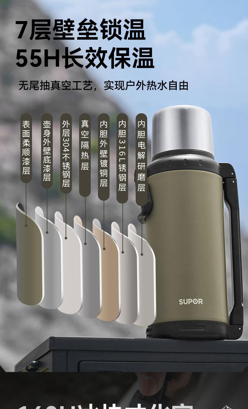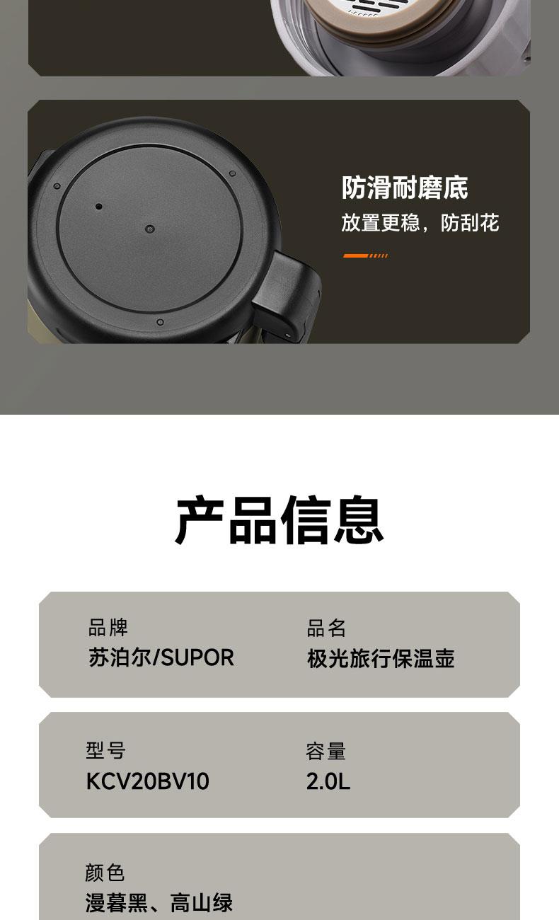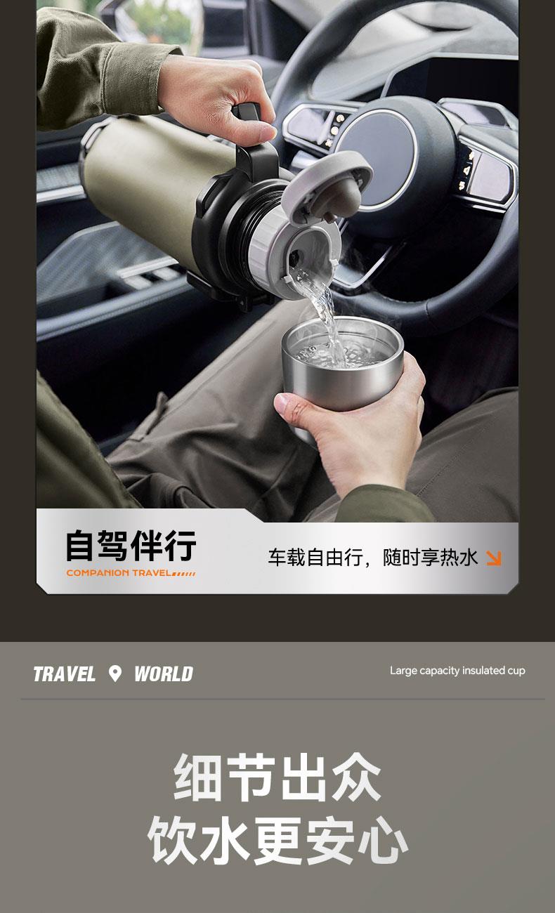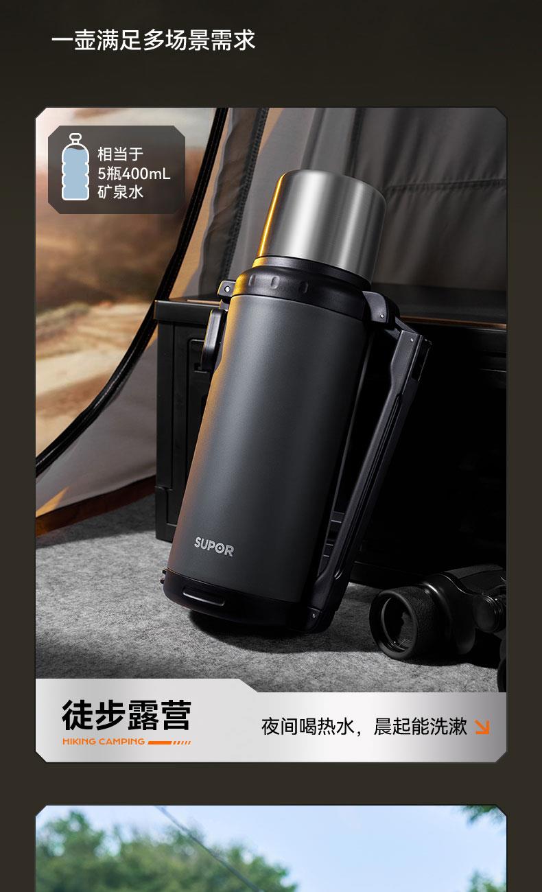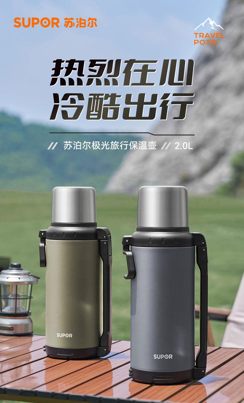 容量(L) 2.0L 材质 内胆304不锈钢 规格参数 代发在库颜色:高山绿/漫暮黑 商品毛重(kg):0.85 572*286*365 功能卖点 1、2L大容量,旅行、居家好帮手; 2、双层钢盖,热水入杯不烫手,饮用更安心; 3、强效保冷140小时+;保温24小时+; 4、一杯双用(直饮、杯盖);