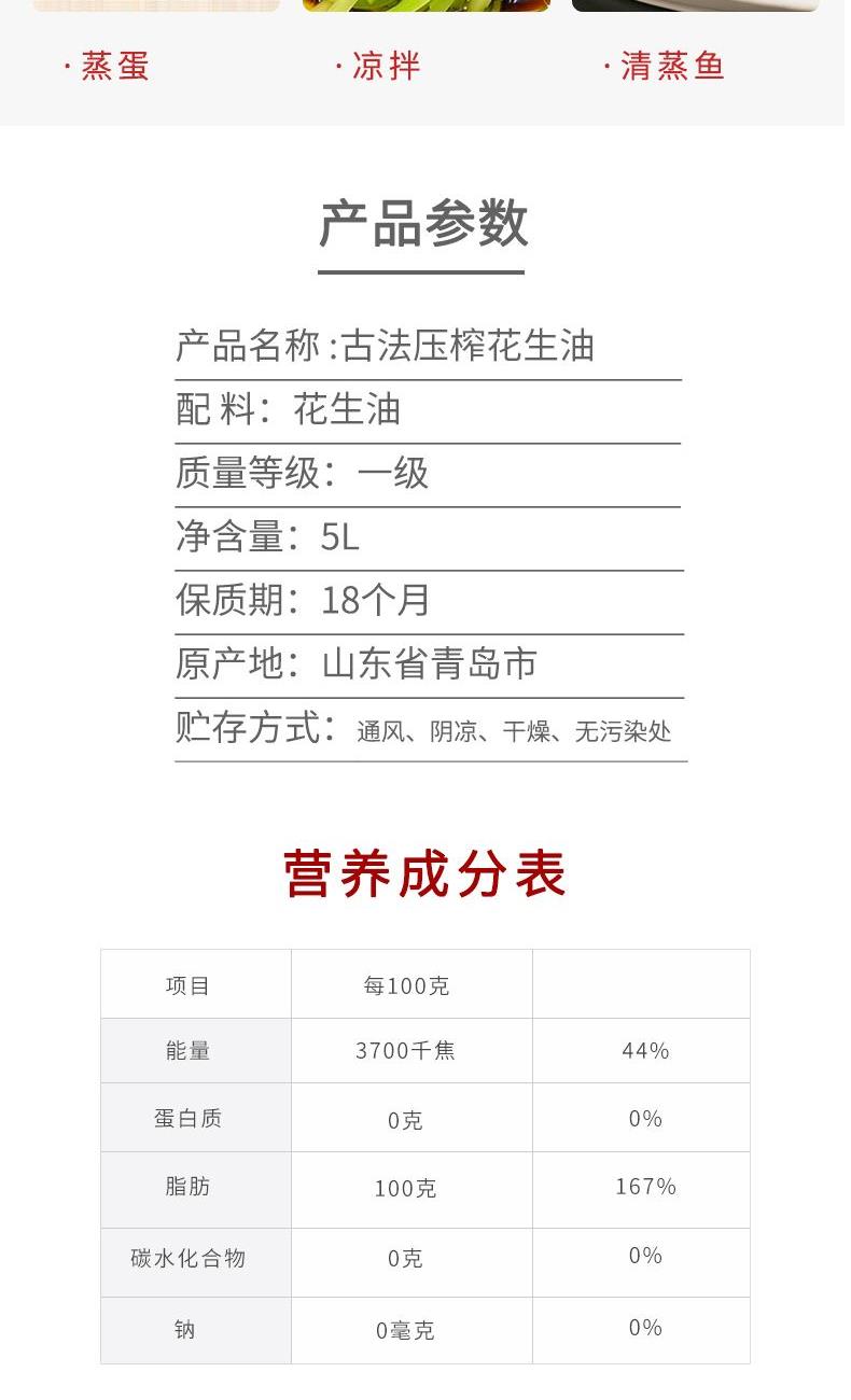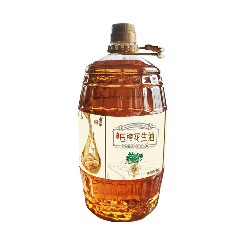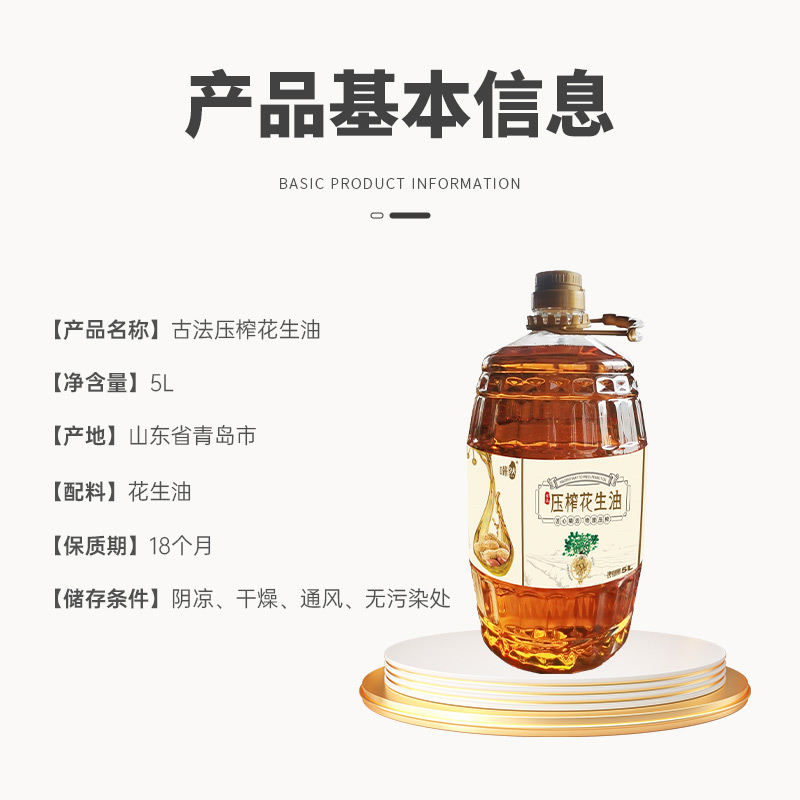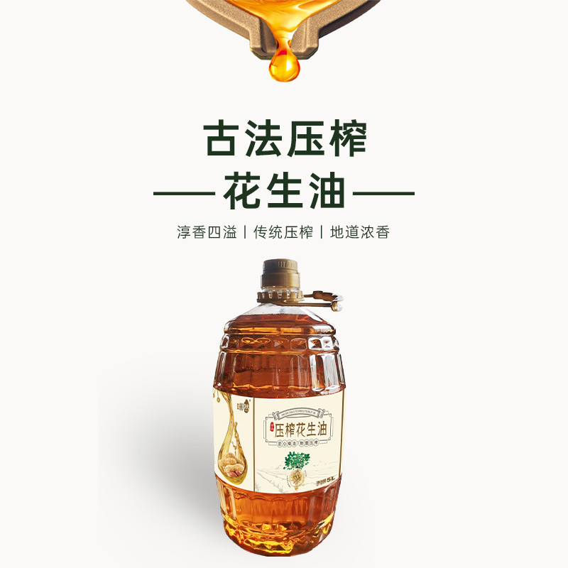 产 品 : 咪然古法小榨花生油5L 执行标准 : GB/T 1534 保 质 期 :18个月 产 地 : 中国 箱 规 :4*5L