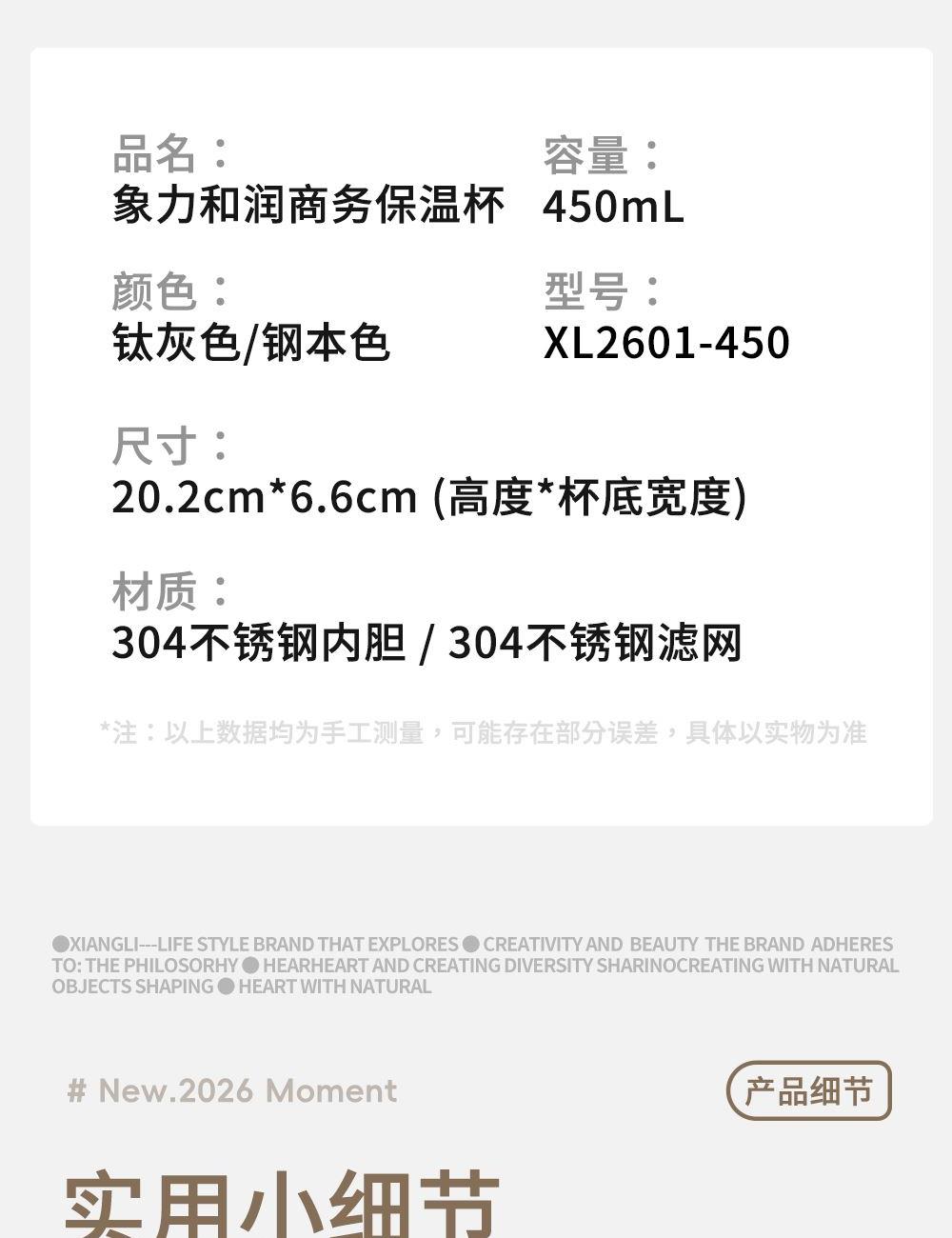 容量:450ML 颜色:枪色 本色 产品尺寸:高度 202×直径66cm 材质:杯盖 304不锈钢拉丝工艺食品级PP材料+304不锈钢内胆 采用食用级304不锈钢回流盖,内置304食品级不锈钢滤网 杯盖密封圈:食品级硅胶圈 包装:单瓦盒