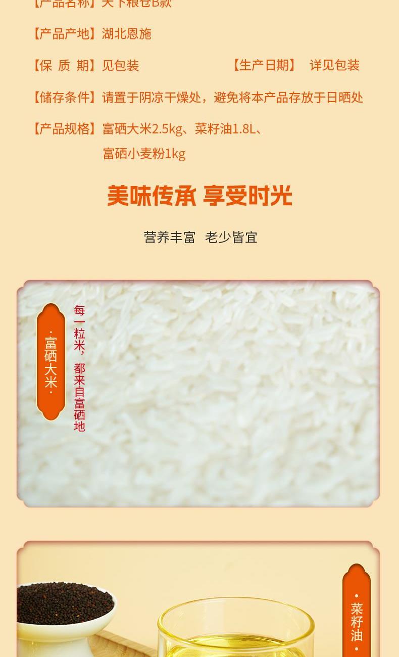 产品信息 品 名:天下粮仓B 规 格:富硒大米2.5kg、菜籽油1.8L, 富硒小麦粉1kg 包 装:长38cm宽17.5cm高30cm 产品特色 1、富有机硒认证,每100g平均硒含量≥20ug。 2、菜籽油油品透亮、香味浓郁,含有丰富的维生素E以及油酸、亚油酸、亚麻酸等; 3、富硒小麦粉,面粉自然白净,粉质细腻,筋度适中,延展性高,适合家庭面食制作:做饺子、面条、馒头、包子、烙饼、面包等 4、精美礼盒,送礼佳品。