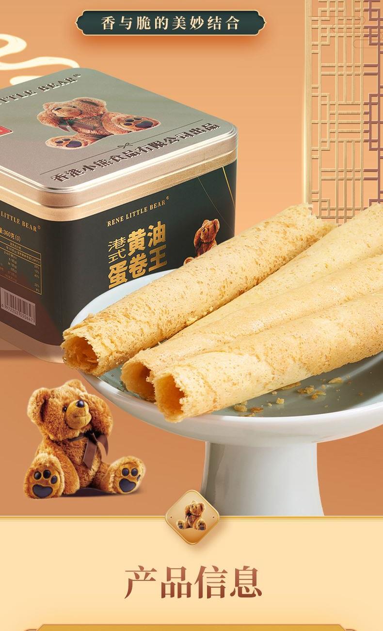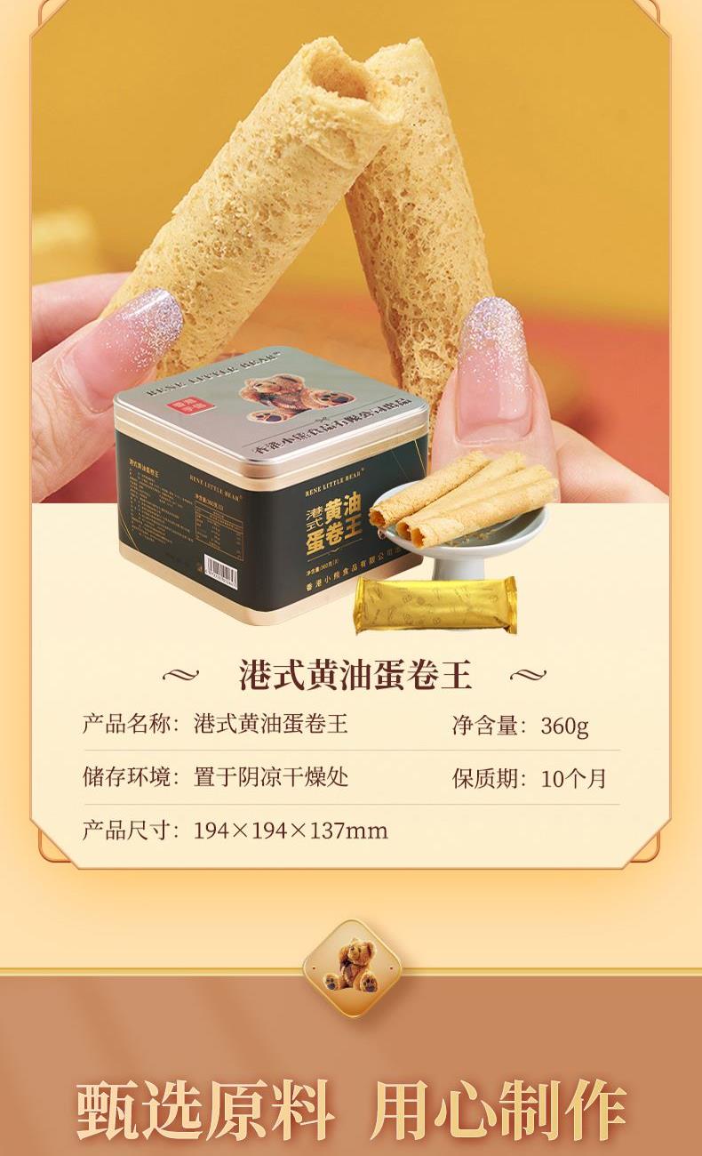 产品净含量:360g 产品保质期:10个月 产品包装:精致铁罐配精美礼品袋 产品卖点:港式蛋卷王采用新西兰进口黄油≥10%,鲜鸡蛋≥25%,零添加,配料表非常干净 ,无反式脂肪酸,奶味浓郁,酥酥脆脆口感,入口掉渣酥香 。铁罐+独立内托小包装+礼袋,送礼更贴心。香港小熊在全国专柜和专卖店有500多家,品质保证,售后安心,有保障。