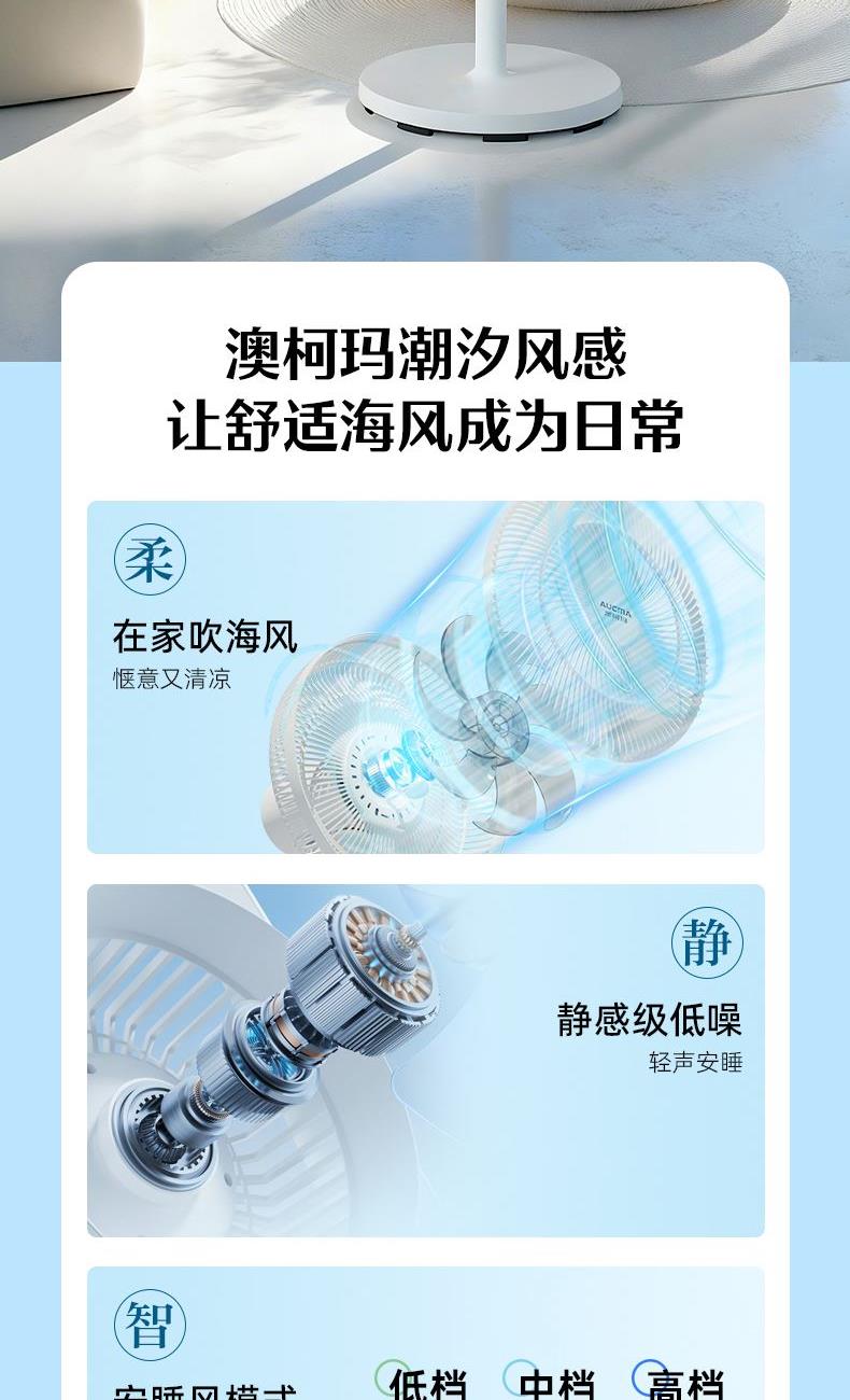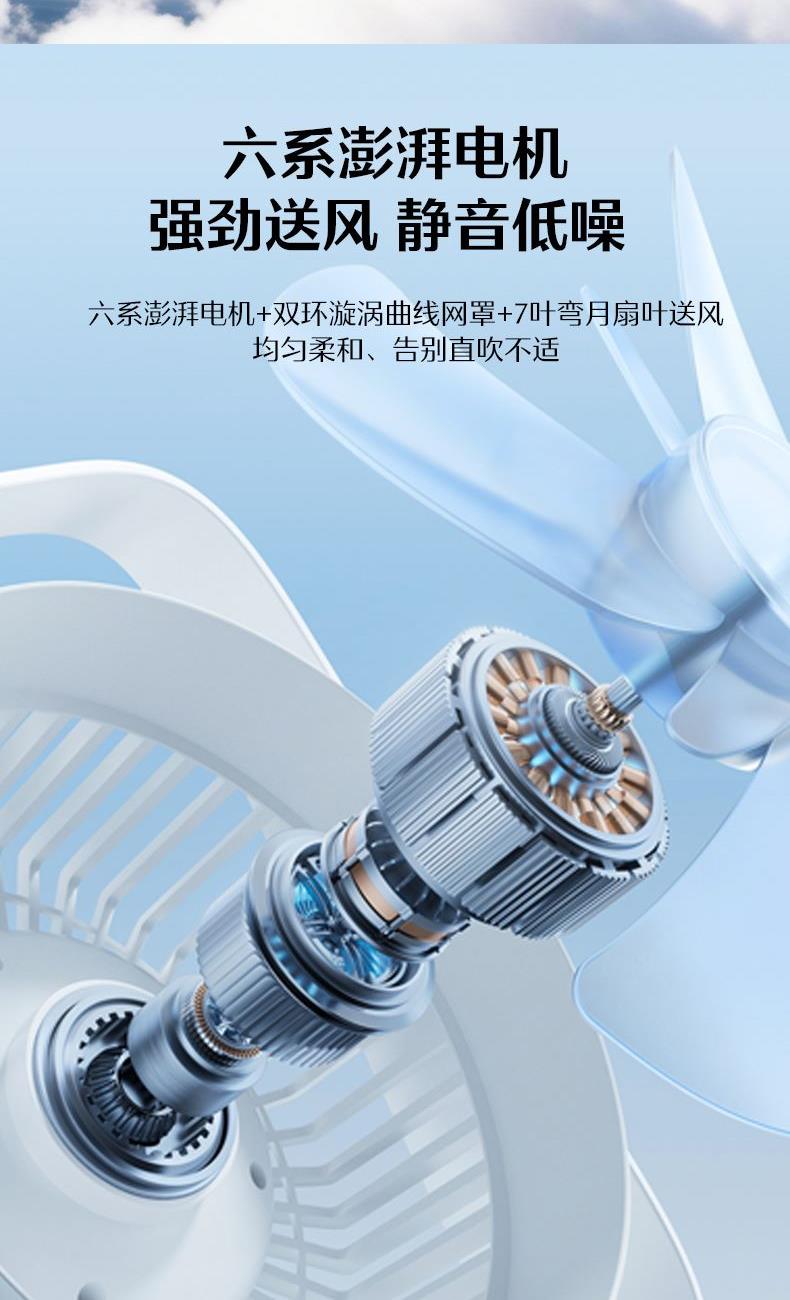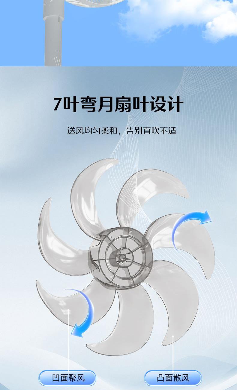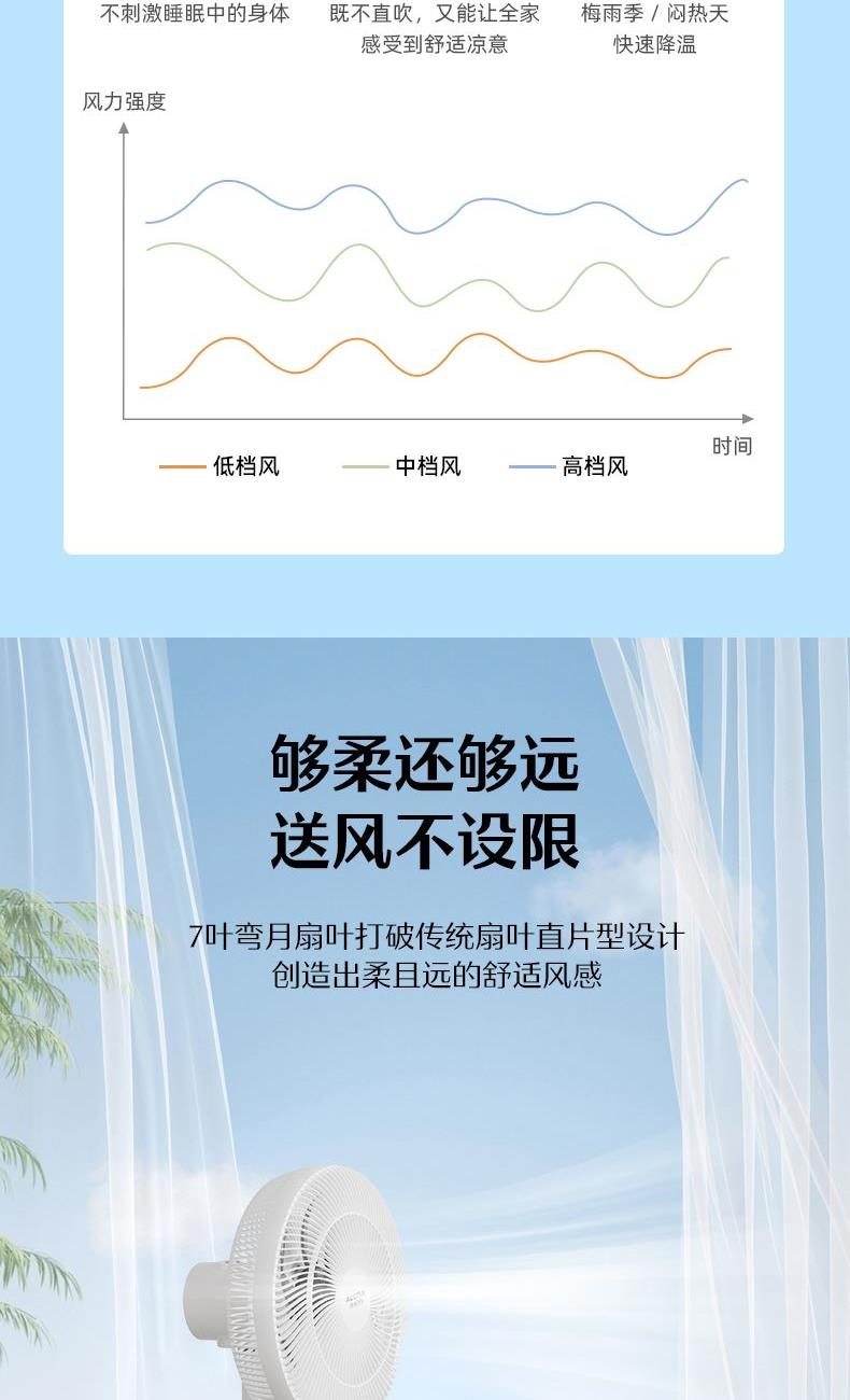 网罩:350mm 扇叶:300mm 7叶弯月扇叶 电机:66-14六系高效电机 立柱:27cm两节ABS 台地立一机三用 包装尺寸:500*210*385mm 风速:5.5m/s 档位:三档 模拟潮汐海风 丝丝凉风铺面而来;复刻潮汐清凉海风,体验风的秘密。 产品上下手动摇头,左右自动摇头; 七叶扇叶,风柔音轻,凉爽惬意 安静陪伴,贴身呵护,清凉工作 柔风细腻强而不硬。