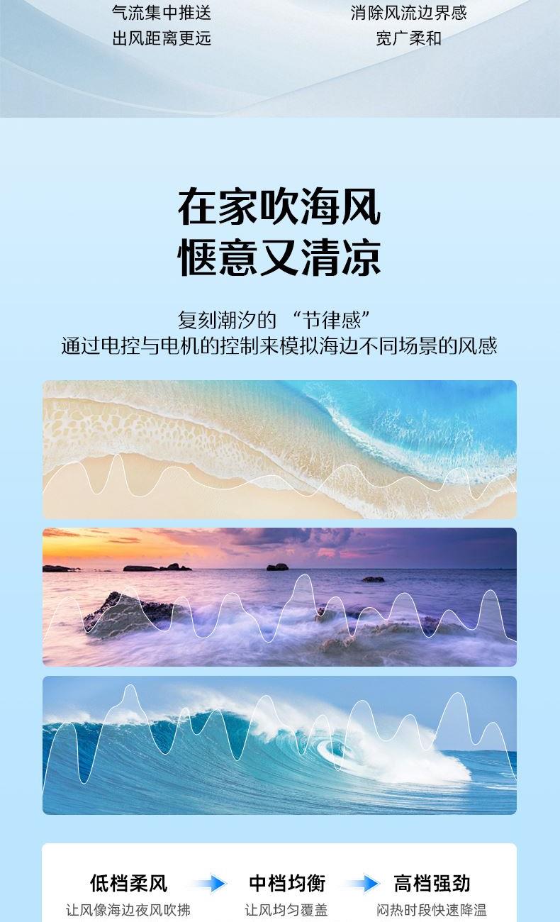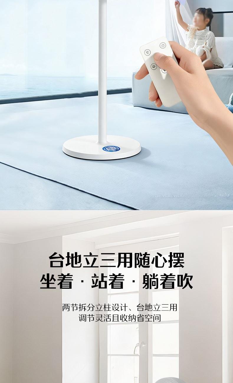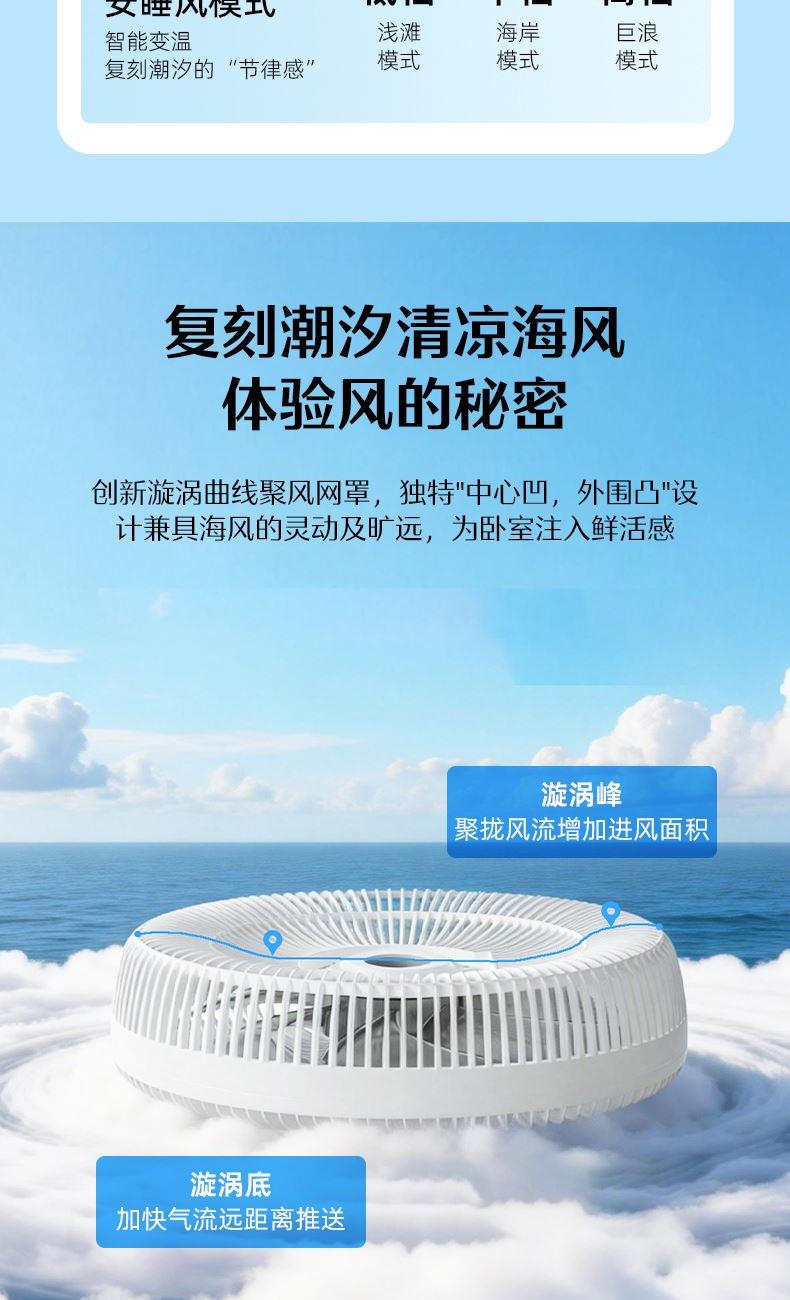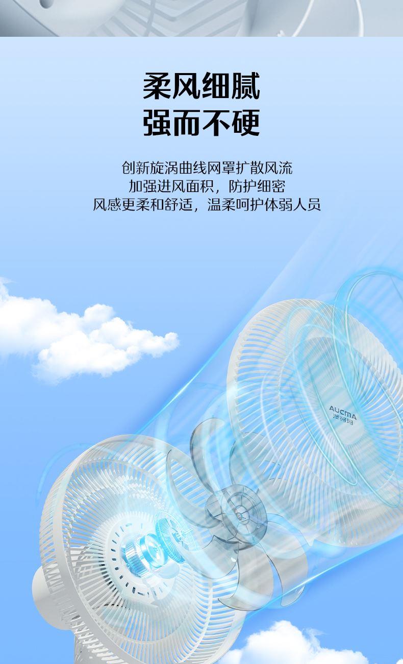 网罩:350mm 扇叶:300mm 7叶弯月扇叶 电机:66-14六系高效电机 立柱:27cm两节ABS 台地立一机三用 包装尺寸:500*210*385mm 风速:5.5m/s 档位:三档 模拟潮汐海风 丝丝凉风铺面而来;复刻潮汐清凉海风,体验风的秘密。 产品上下手动摇头,左右自动摇头; 七叶扇叶,风柔音轻,凉爽惬意 安静陪伴,贴身呵护,清凉工作 柔风细腻强而不硬。