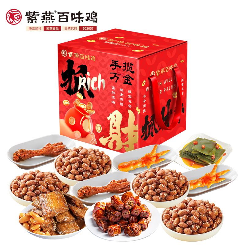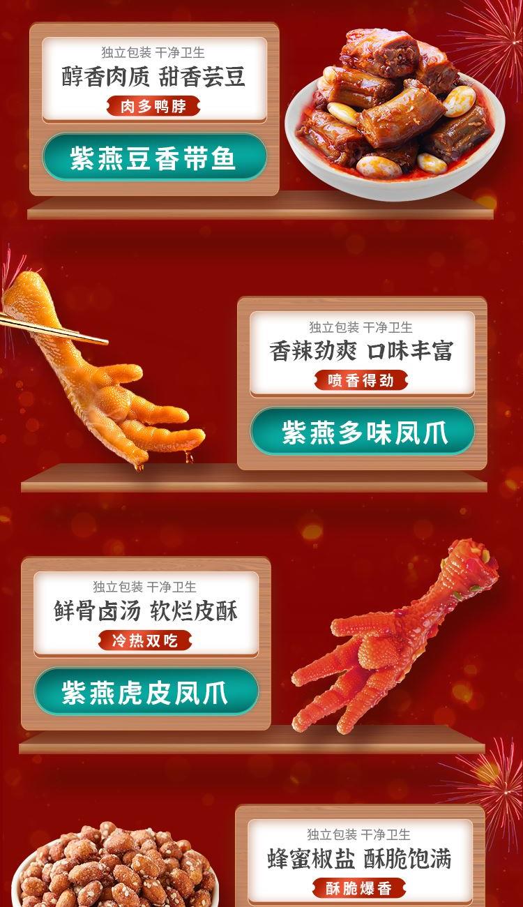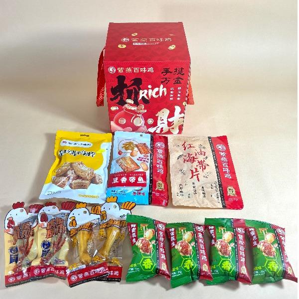 紫燕甜辣鸭脖60g*1 紫燕豆香带鱼(香辣味)60g*1 紫燕虎皮凤爪(卤香味)(单只)30g*1 紫燕虎皮凤爪(卤香味)(单只)30g*1 紫燕多味凤爪(单只)30g*1 紫燕多味凤爪(单只)30g*1 紫燕脆滑厚海带片(红油海带片)60g*1 紫燕蜂蜜花生(椒盐味)25g*1 紫燕蜂蜜花生(椒盐味)25g*1 紫燕蜂蜜花生(椒盐味)25g*1 紫燕蜂蜜花生(椒盐味)25g*1 礼盒+组装+外盒