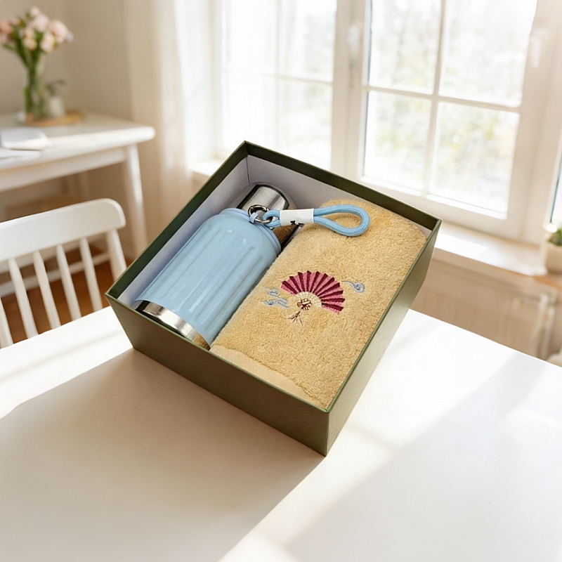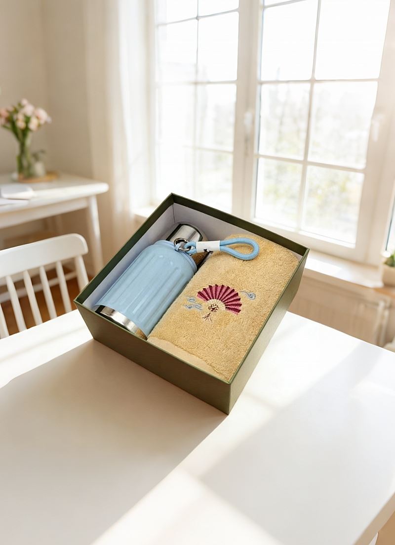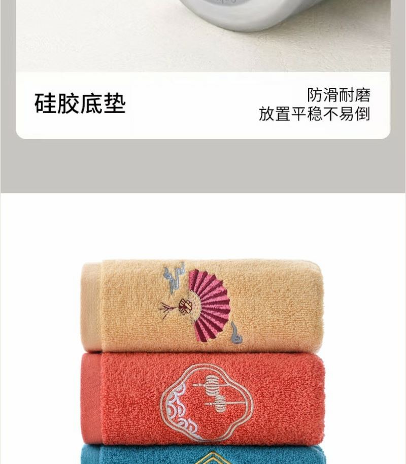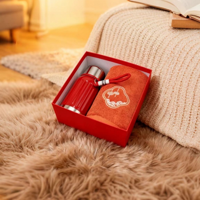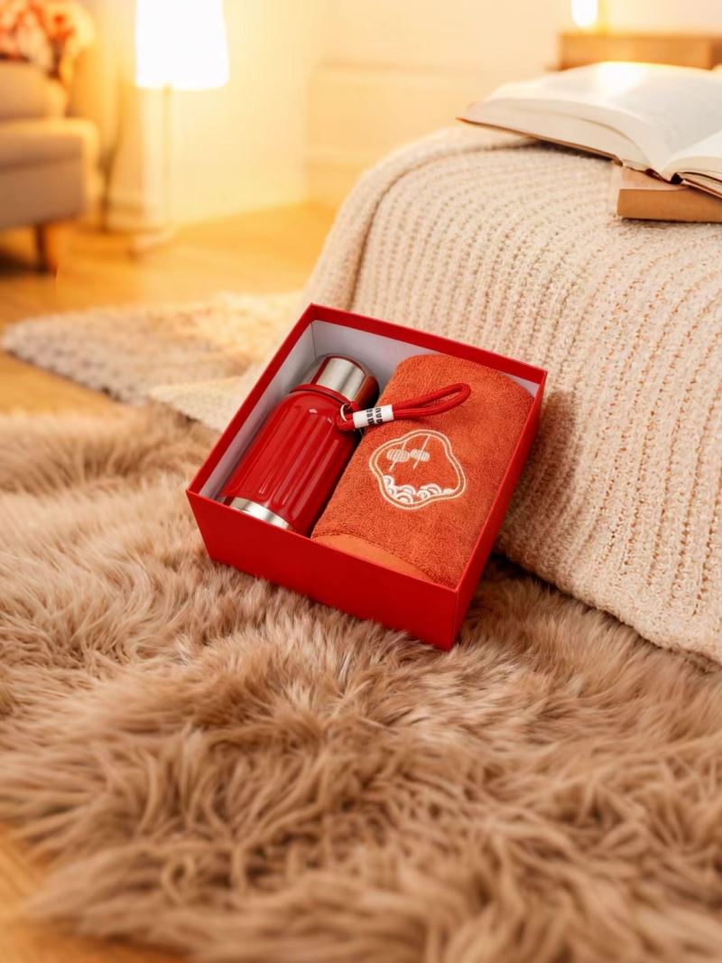 型号: A9B14X 产品内容 1、唐风古韵精梳棉大毛巾×1 34*74CM 98克 2、轻奢保温壶×1 450毫升容量 内胆316 杯盖201 礼盒: 20×20×9.5cm 硬盒天地盖+拎袋 450毫升保温壶 大小合适 316内胆 带盖设计 一杯两用 毛巾精选精梳棉材质 结合国风刺绣主题融入 品质好礼