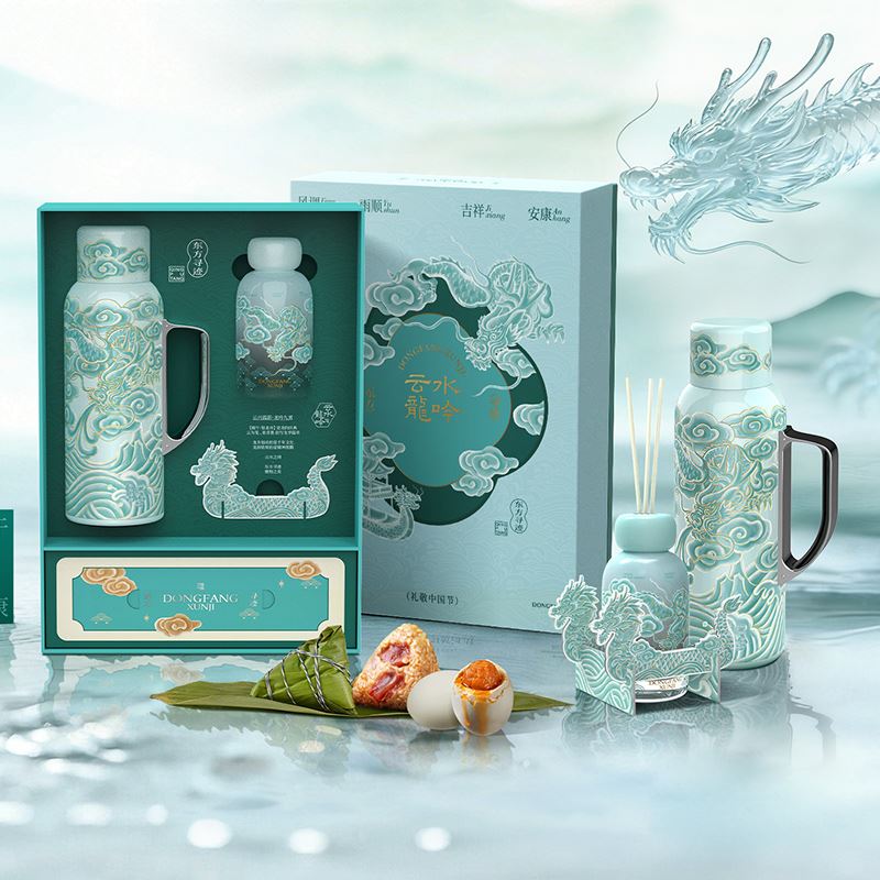 配置 · ① 陶瓷内胆焖壶×1把(820ml) (SUS-316内胆丨304外壳丨内胆/杯盖内壁喷瓷) ② 无火香氛液×1瓶(200ml-乌木沉香) ③ 龙舟纸框景×4片 ④ 香液扩香棒×1套 ⑤ 发芽糙米粽×2只(100g/只) ⑥ 超大海鸭蛋×2只(80g/只) ⑦ 端午礼卡×1份 ⑧ 云水龙吟礼盒×1套(含袋) 尺寸 · 380×275×95mm
