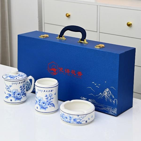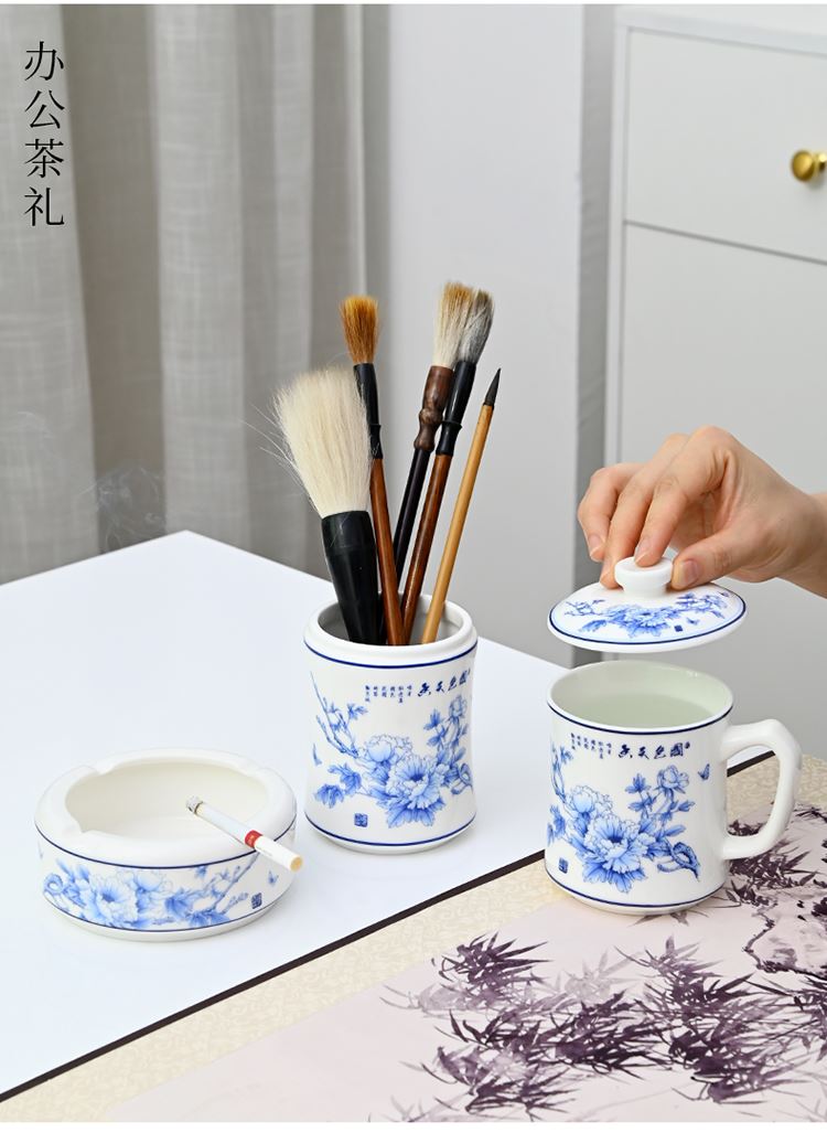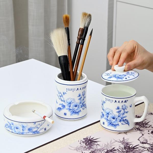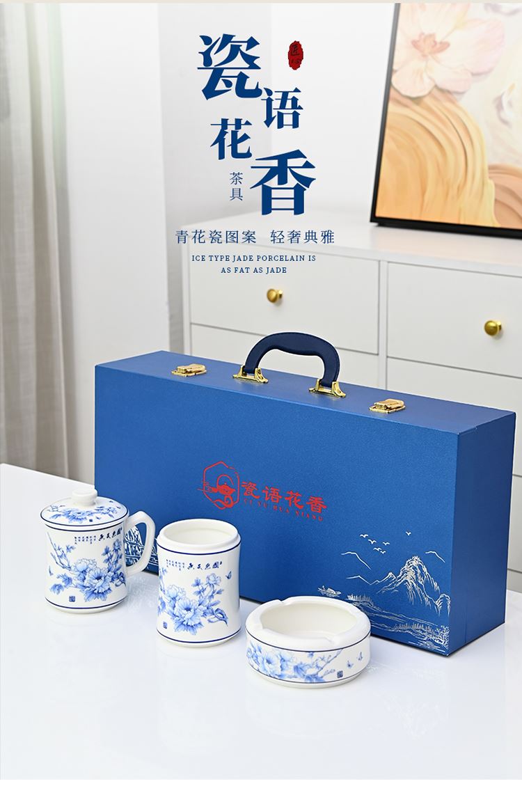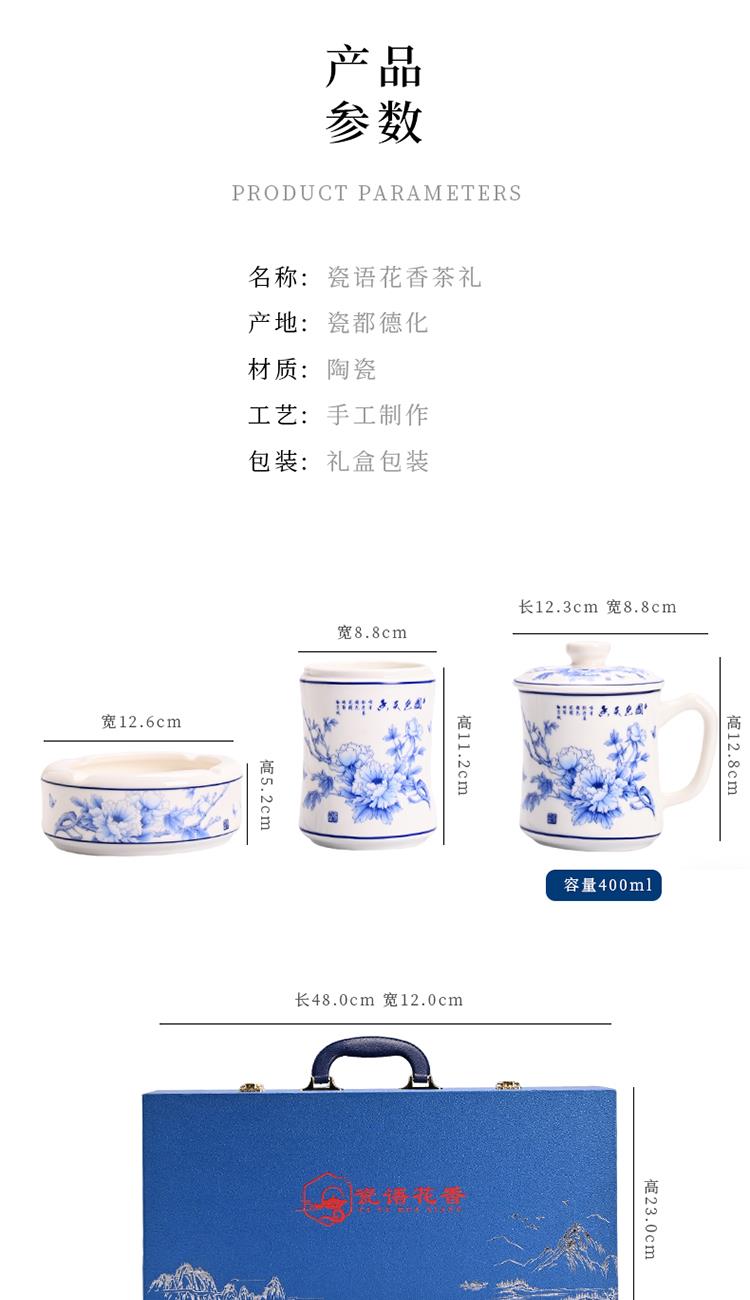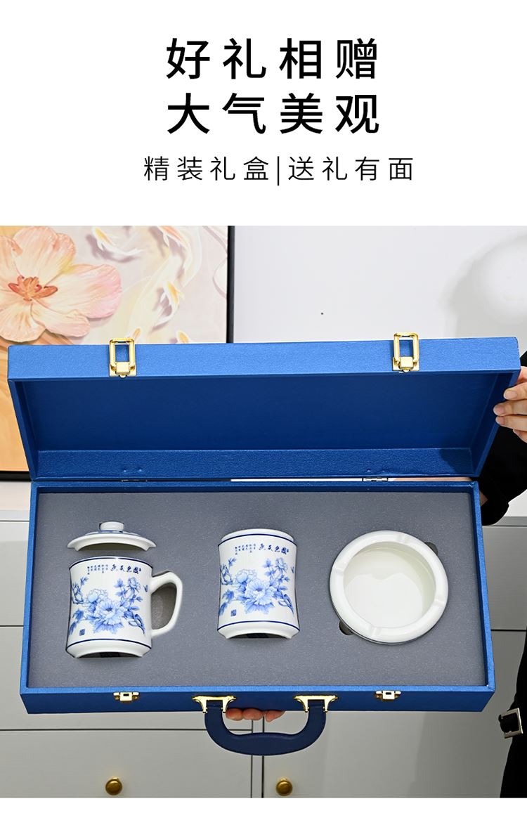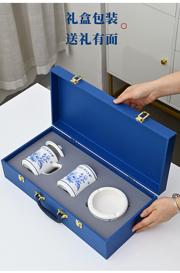 办公杯:12.8*12*8厘米400ml 笔筒:11.2*8.8厘米 烟灰缸:12.6*5.2厘米 礼盒:48*23*12厘米 天然矿物釉,高温烧制无铅镉 ,瓷质明亮通透,温润如玉,包装礼盒轻奢新颖,搭配礼盒包装,自用赠礼两宜。青花瓷轻奢典雅,大器美观,甄选好礼,品质保障。
