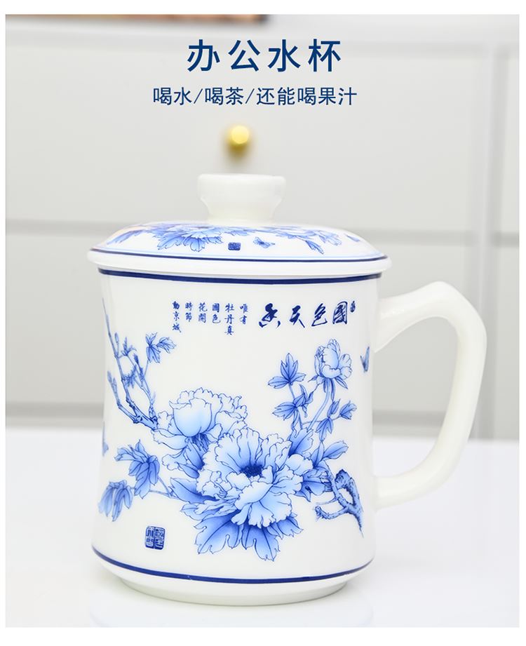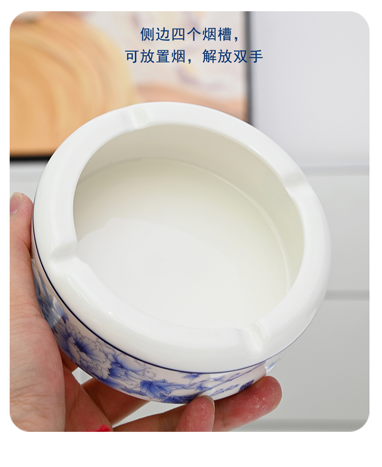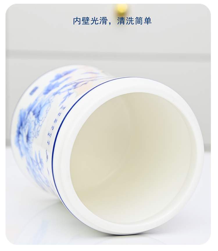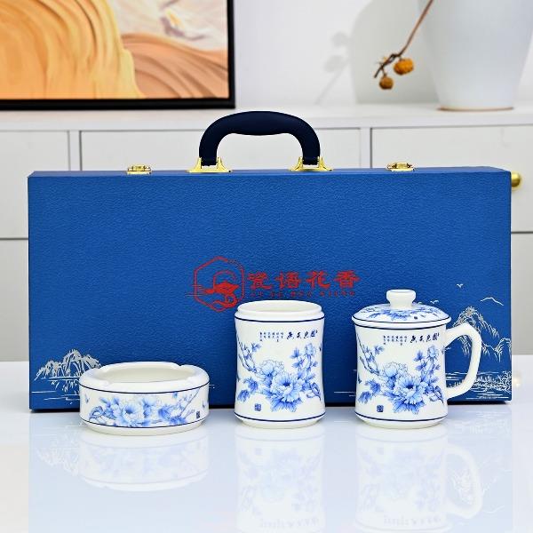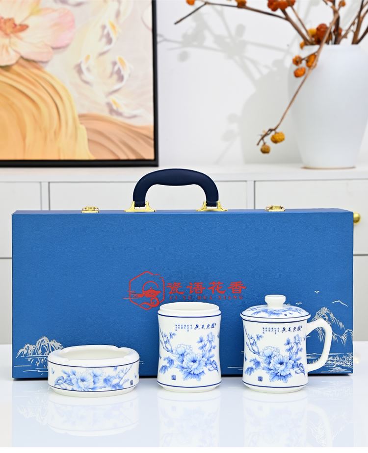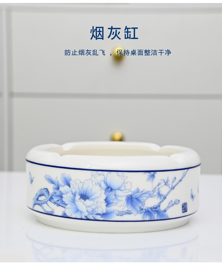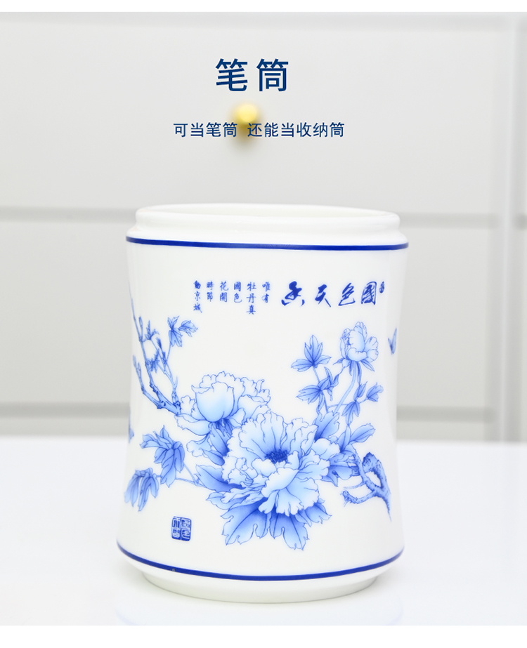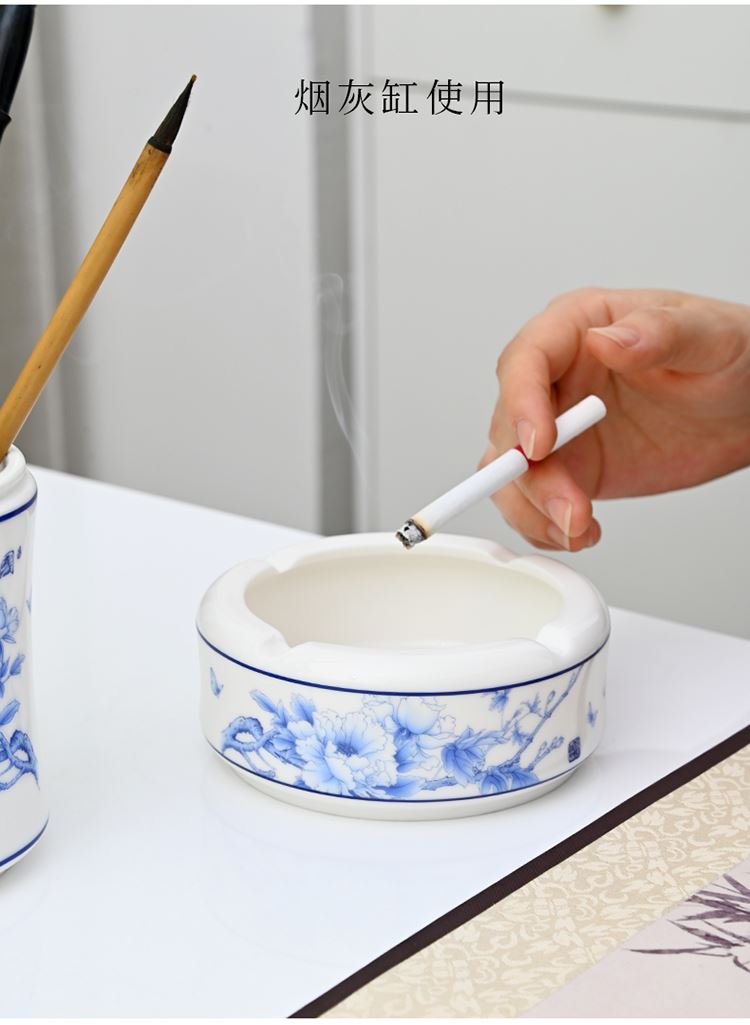 办公杯:12.8*12*8厘米400ml 笔筒:11.2*8.8厘米 烟灰缸:12.6*5.2厘米 礼盒:48*23*12厘米 天然矿物釉,高温烧制无铅镉 ,瓷质明亮通透,温润如玉,包装礼盒轻奢新颖,搭配礼盒包装,自用赠礼两宜。青花瓷轻奢典雅,大器美观,甄选好礼,品质保障。