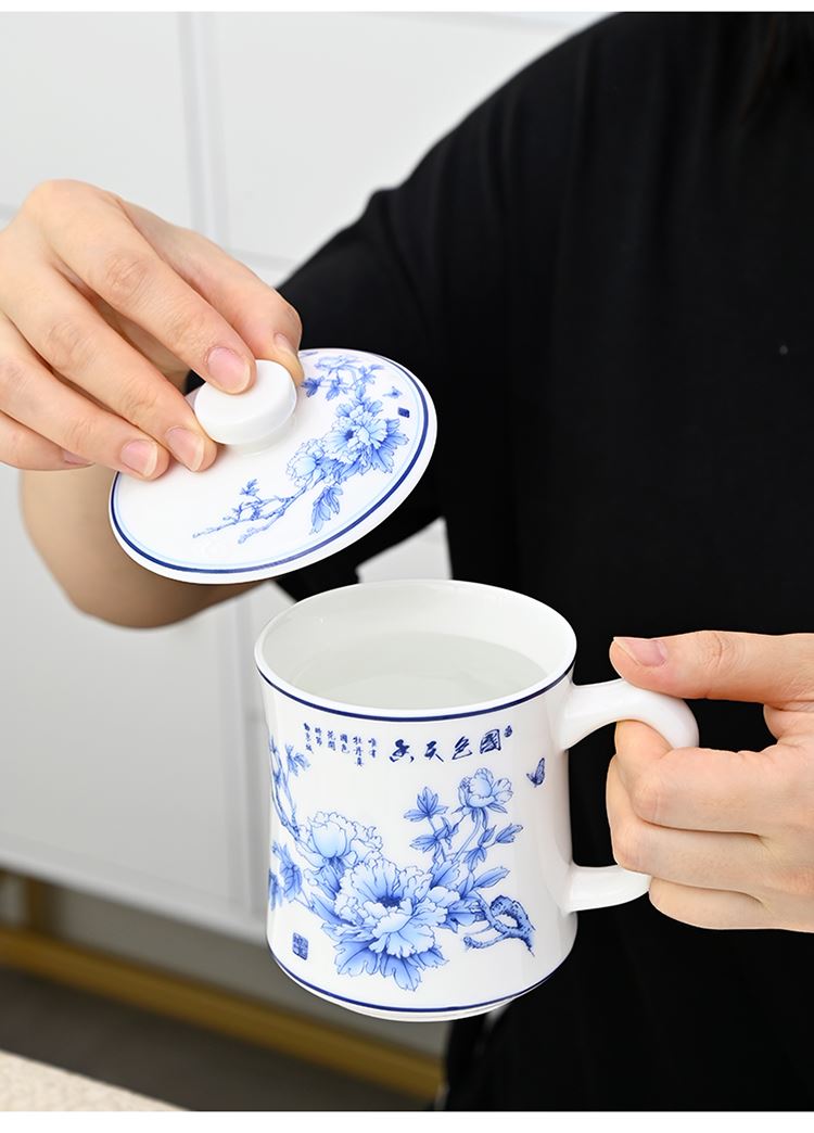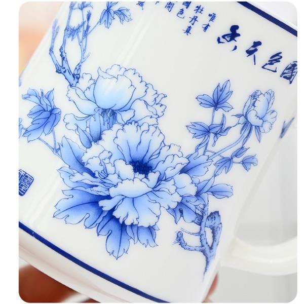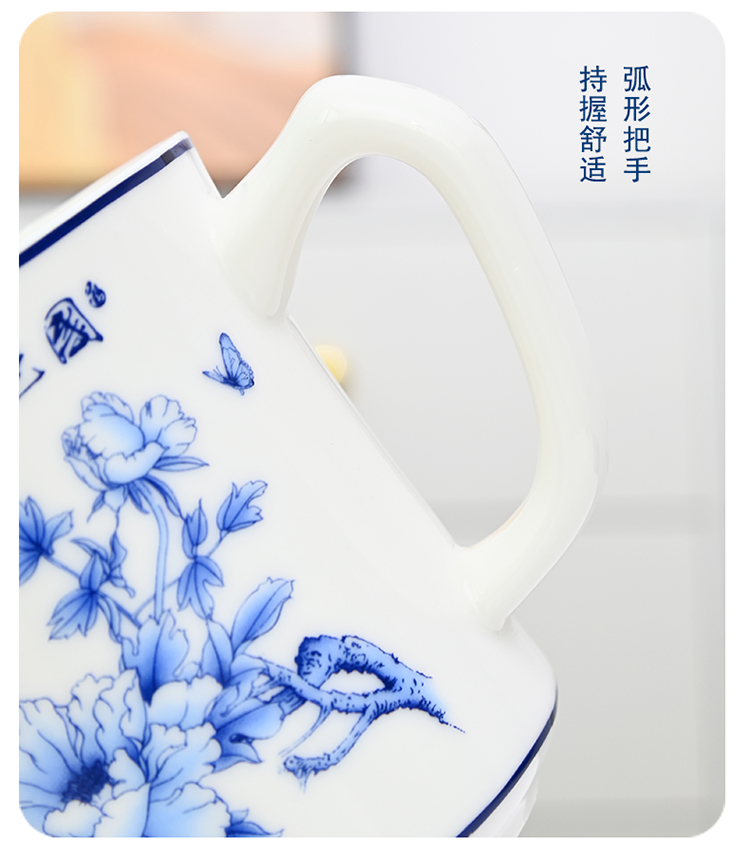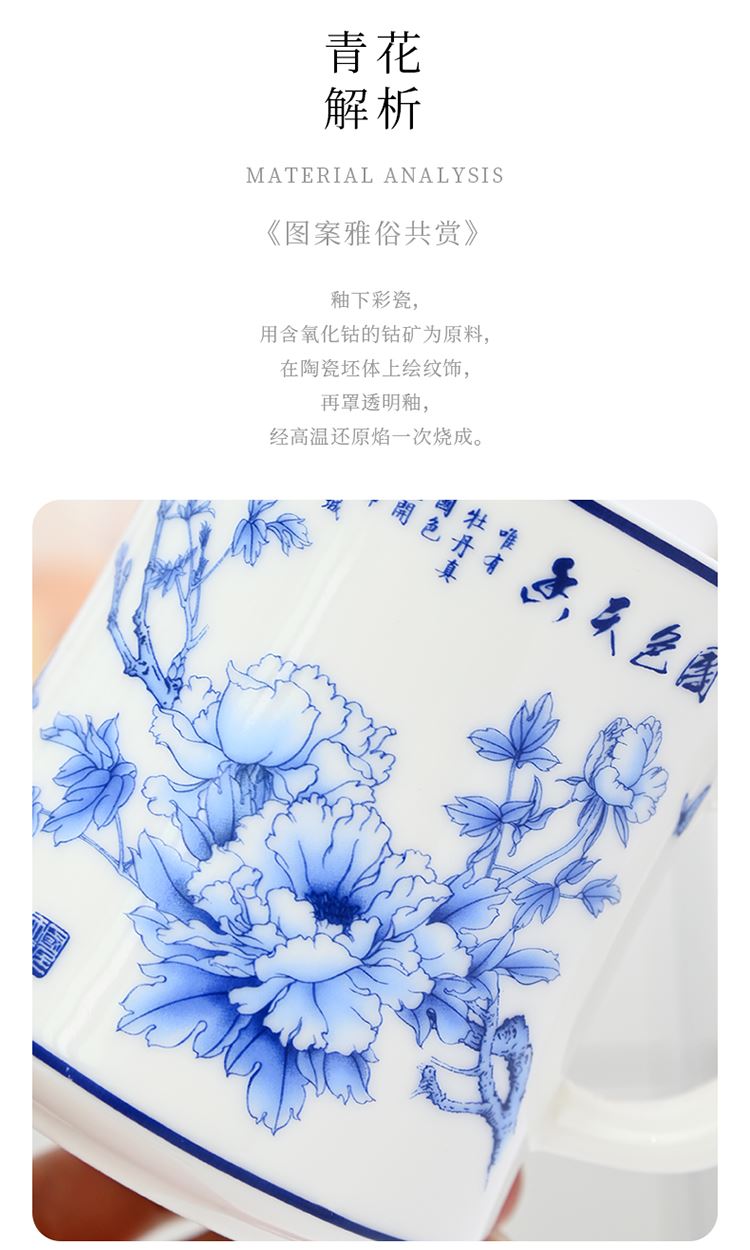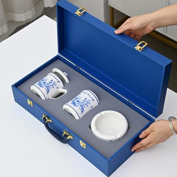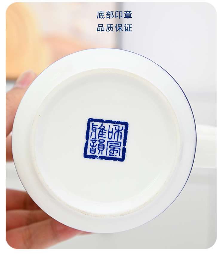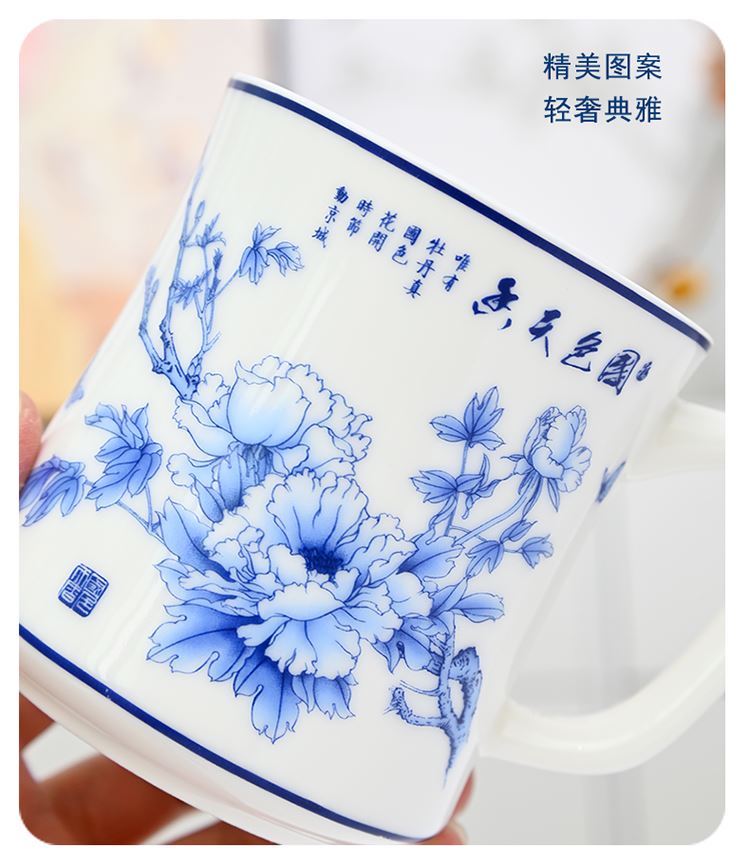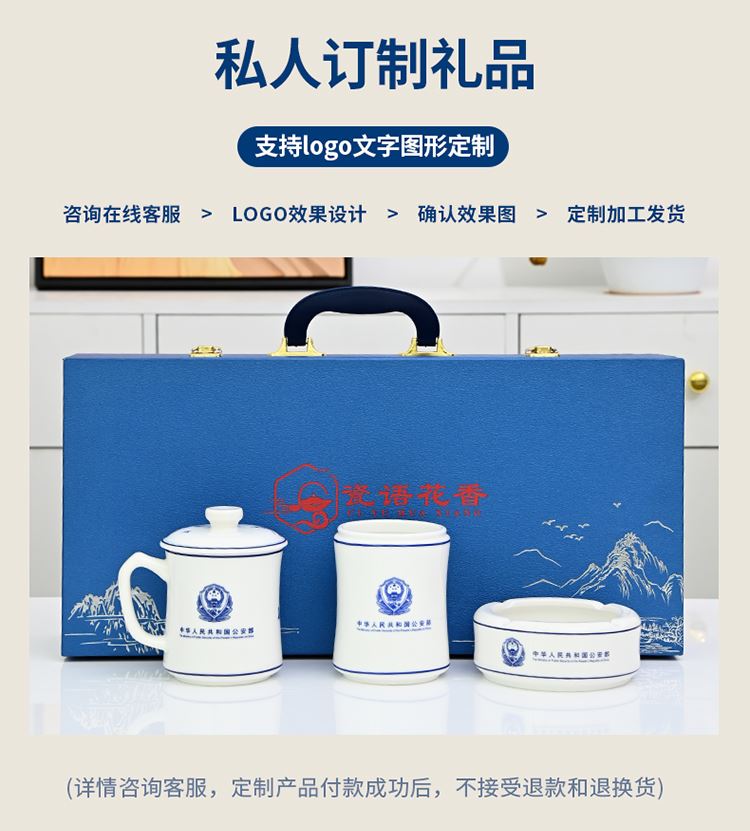 办公杯:12.8*12*8厘米400ml 笔筒:11.2*8.8厘米 烟灰缸:12.6*5.2厘米 礼盒:48*23*12厘米 天然矿物釉,高温烧制无铅镉 ,瓷质明亮通透,温润如玉,包装礼盒轻奢新颖,搭配礼盒包装,自用赠礼两宜。青花瓷轻奢典雅,大器美观,甄选好礼,品质保障。