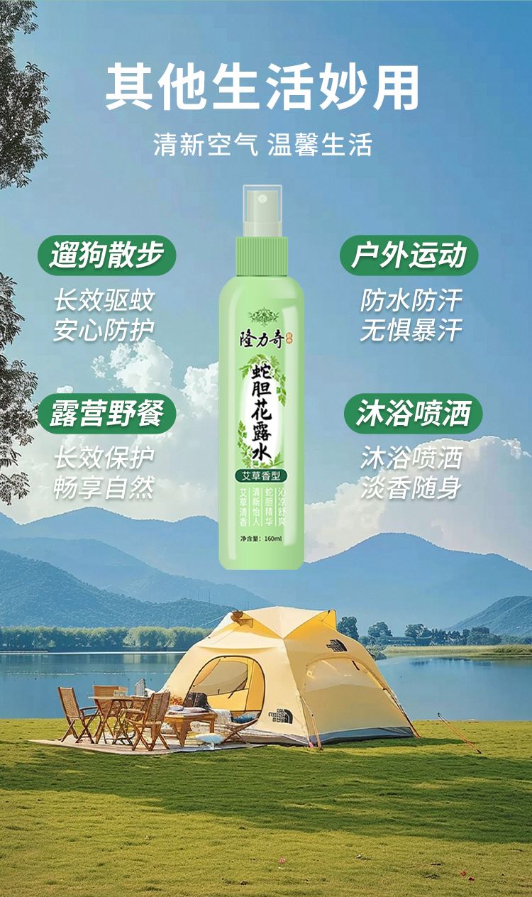 隆力奇艾草香型蛇胆花露水 160ml 货号:LLQ-202504292 净含量:160ml/瓶 保质期:3年 功效:驱蚊止痒 提神醒脑 持久凝香 喷头设计,简单易用 外箱尺寸:23.5X26.5X19.5cm 产品卖点: 1.天然艾草香氛,驱蚊同时舒缓安神; 2.草本温和配方,快速止痒不刺激肌肤 3.长效防护12小时,清爽便携全家适用。