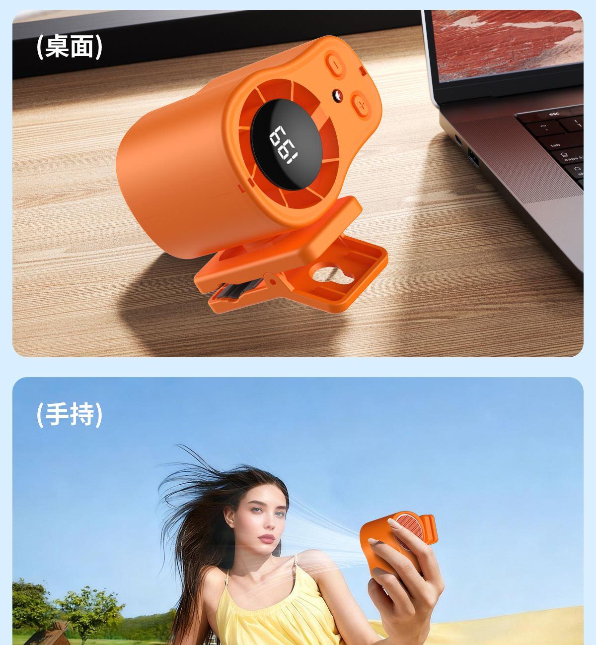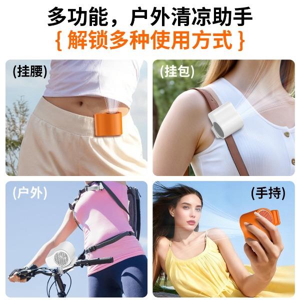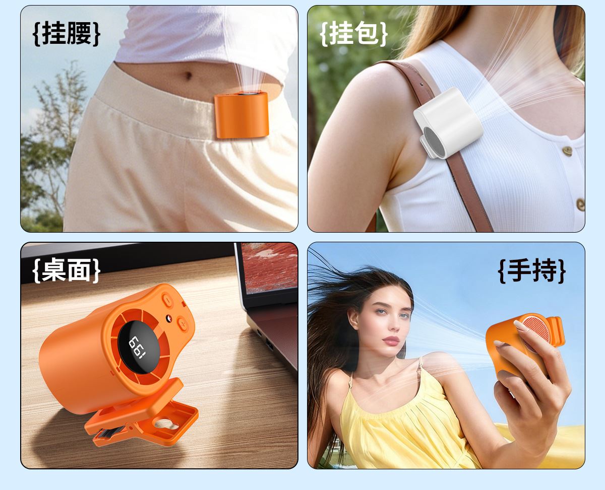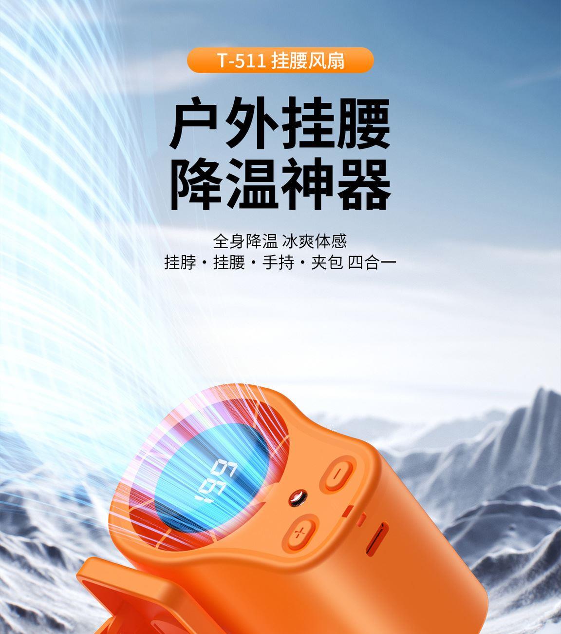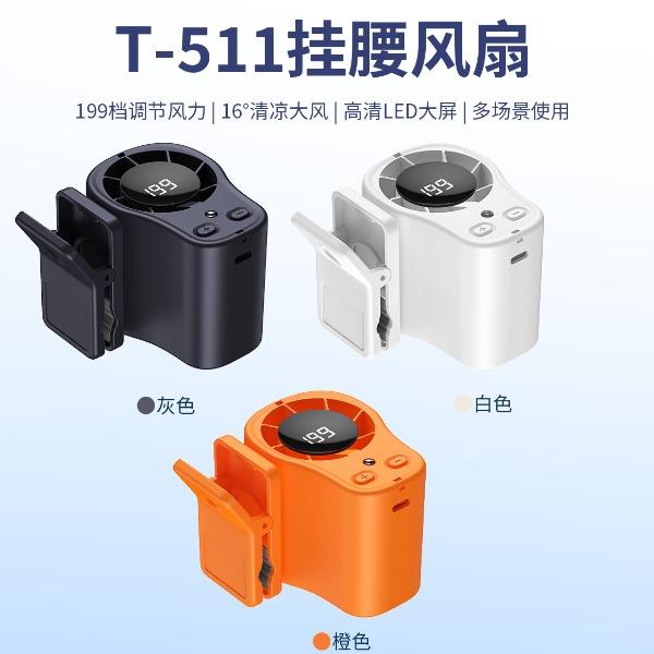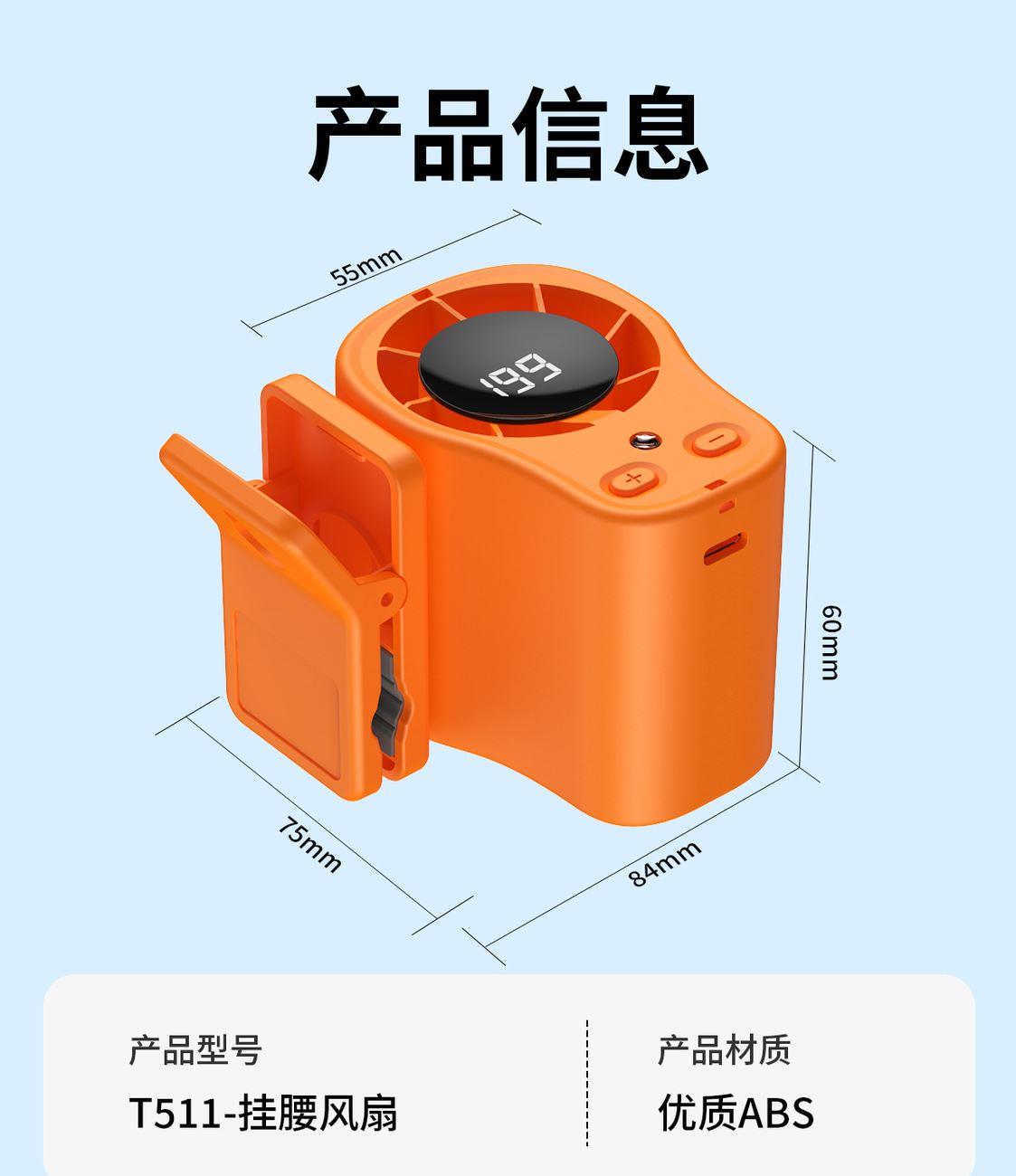 多功能夹子挂腰风扇T-511 颜色:白色 黑色 橙色 整箱数量:100PCS 外箱:41.5*38.5*38CM 单个重量:173.1g 彩盒尺寸:89*79*72mm 整箱重量:175kg 尺寸:84*74*63mm 材质:ABS材质 容量:1500mAh 包装:彩盒包装 【推荐理由】: 户外精致小巧,方便携带高速风扇 199档数显可调节高速风扇 多功能户外使用方式,解锁多种方式 1500毫安大容量电池待机更长